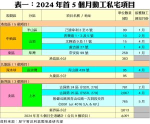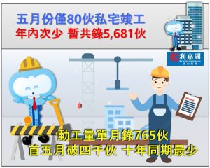 五月份私宅落成量僅80伙 按月減少87% 期內765伙私宅動工 首五個月4,091伙
