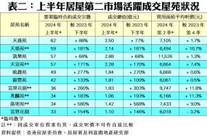 按物業價值劃分(見表一),上半年有5個組別交投量錄得升幅,其中價值200至300萬元以內組別交投升幅顯著,由去年下半年的93宗買賣急增2.52倍至今年上半年的327宗;至於交投最活躍的則為價值300至400萬元以內的居二單位,上半年共錄得782宗成交,較上一個半年度的228宗增加2.43倍。若按屋苑劃分(見表二),上半年將軍澳廣明苑錄34宗成交,按半年飆升5.8倍,成交總值亦同步大增5.68倍至1.42億元;至於天水圍天盛苑則以62宗買賣成為2024上半年居屋第二市場交投最活躍的屋苑,成交總值涉資約2.5億元。
