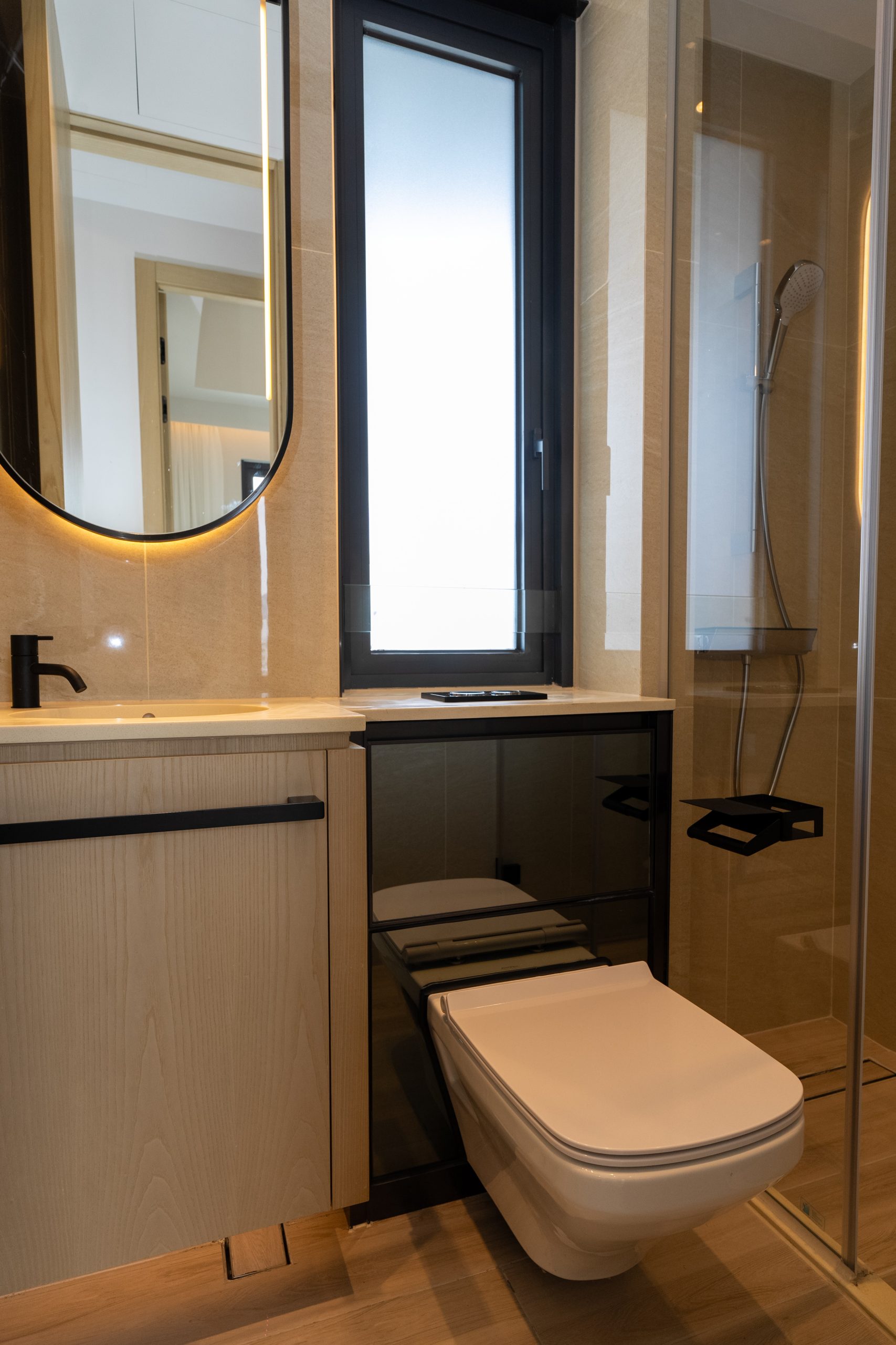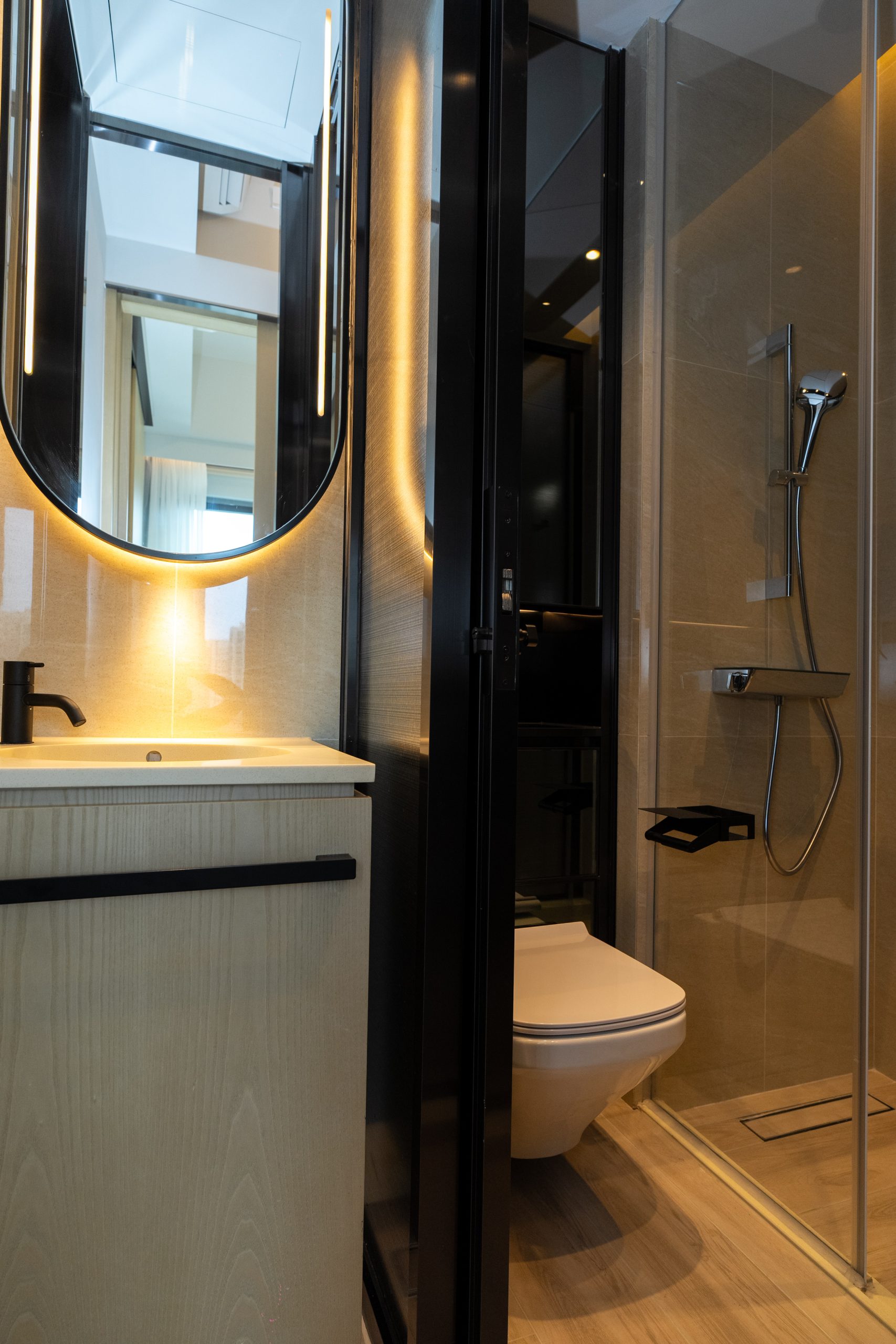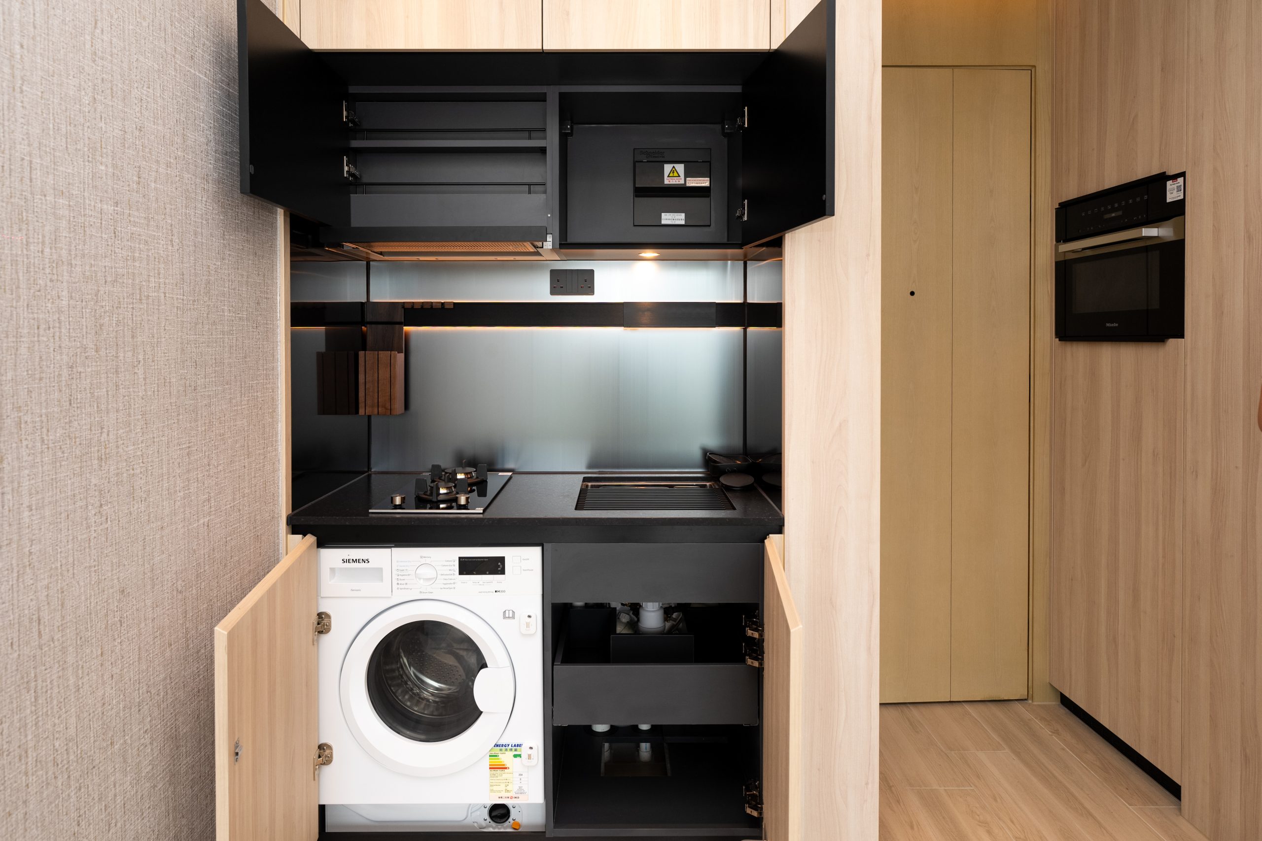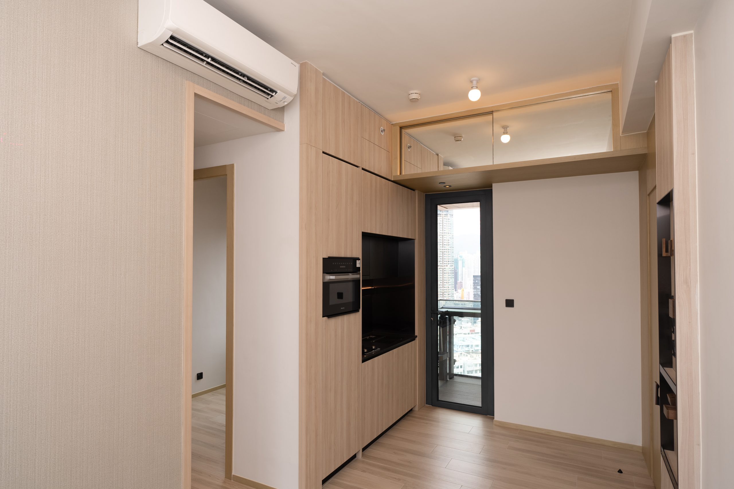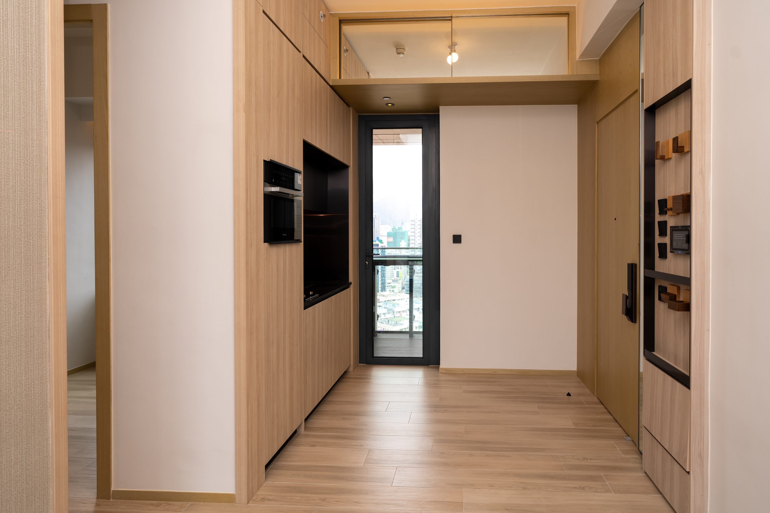 兩間睡房間隔四正,其中一間睡房設L型窗戶,享海景及城市景緻,景觀開揚。廚房採用開放式設計,外連露台,選用高級電器品牌,配備意大利品牌Mia Cucina的嵌入式煤氣煮食爐,以及德國品牌Miele微波焗爐、西門子抽油煙機及雪櫃,設備完善。浴室設計以淺木色為主,精選歐洲品牌衛浴配備,包括丹麥Vola、德國DURAVIT及Hansgrohe。同時裝設鏡面多用途儲物櫃連USB充電位,簡約時尚,盡顯生活品味;天花則設有藍芽喇叭,帶來全方位音樂享受。