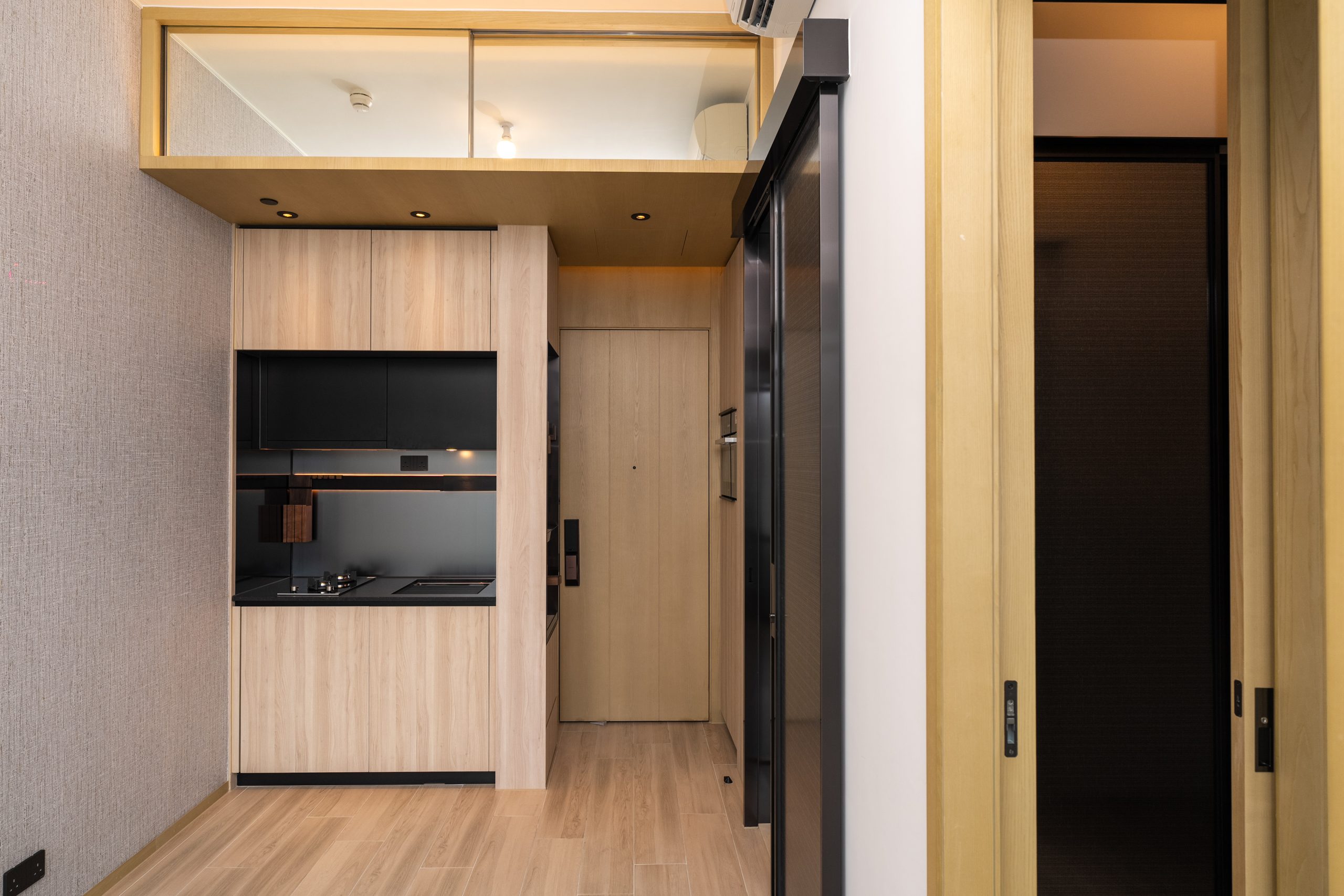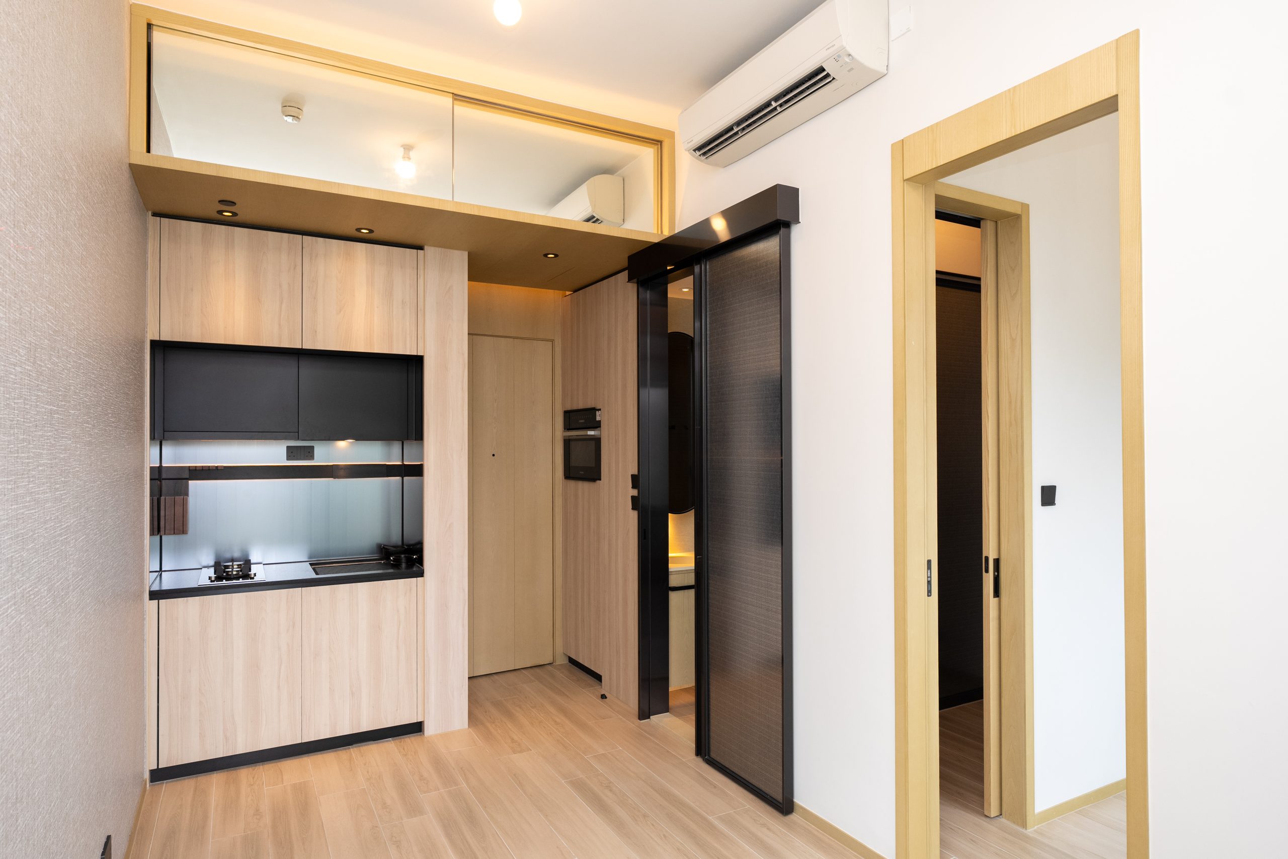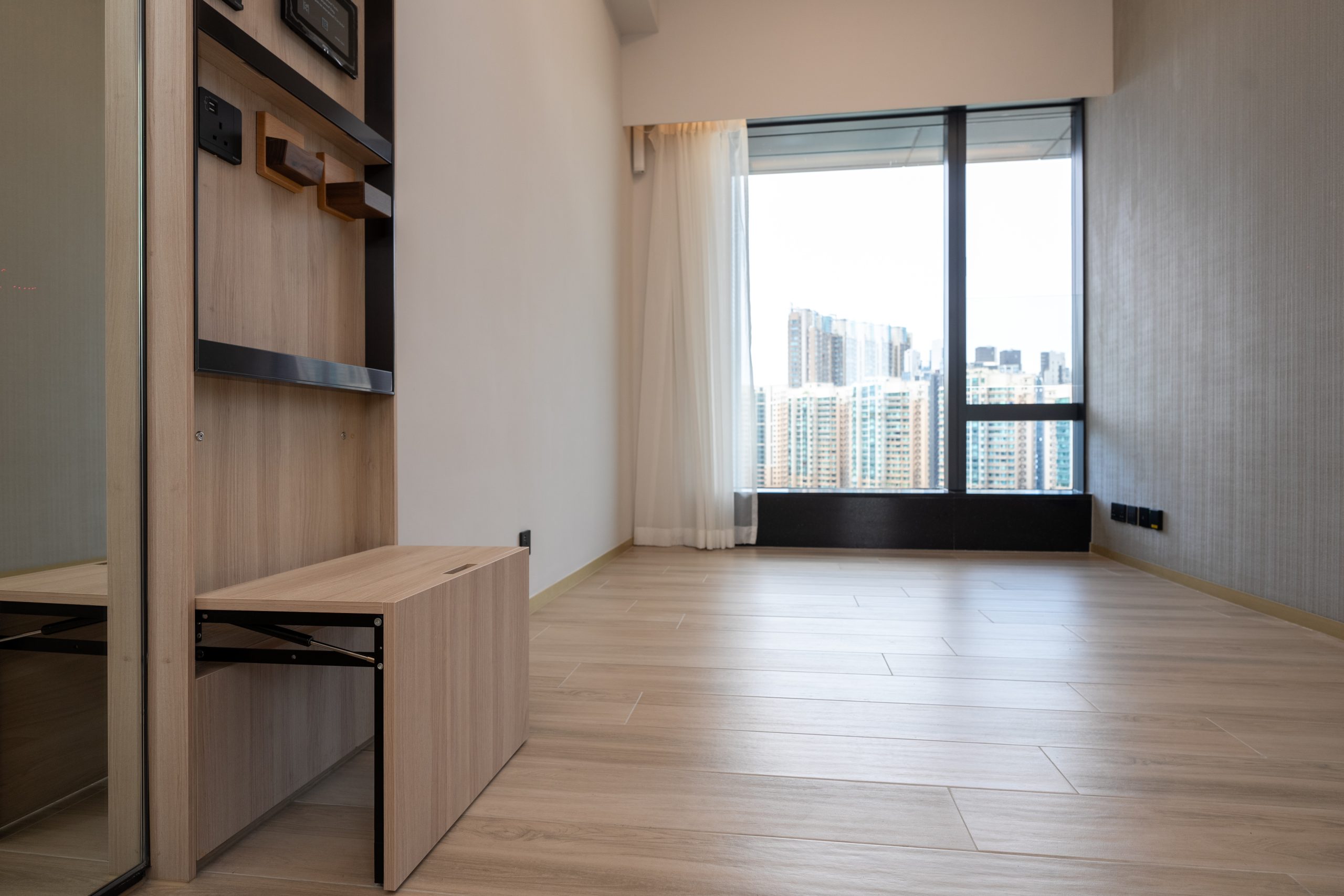 恒基地產旗下大角咀新盤「利奧坊.壹隅」已屆現樓,正式開放2個示範單位參觀,包括第2座27樓A室無改動現樓單位,實用面積405方呎,屬兩房間隔。客飯廳呈長方形佈局,間隔方正實用,易於擺放家具,並以和風牆紙裝飾一面牆身,優雅美觀。客飯廳配以佑大窗戶,廣納自然光線,加上層與層之間的高度約3.5米,空間感十足。玄關位置設有特色磁石牆及隱藏式摺凳,天花設度身訂製的鏡面儲物櫃。