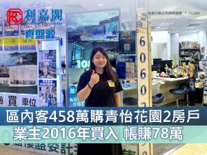 區內客以458萬元購青怡花園2房戶 業主2016年買入 帳賺78萬元
