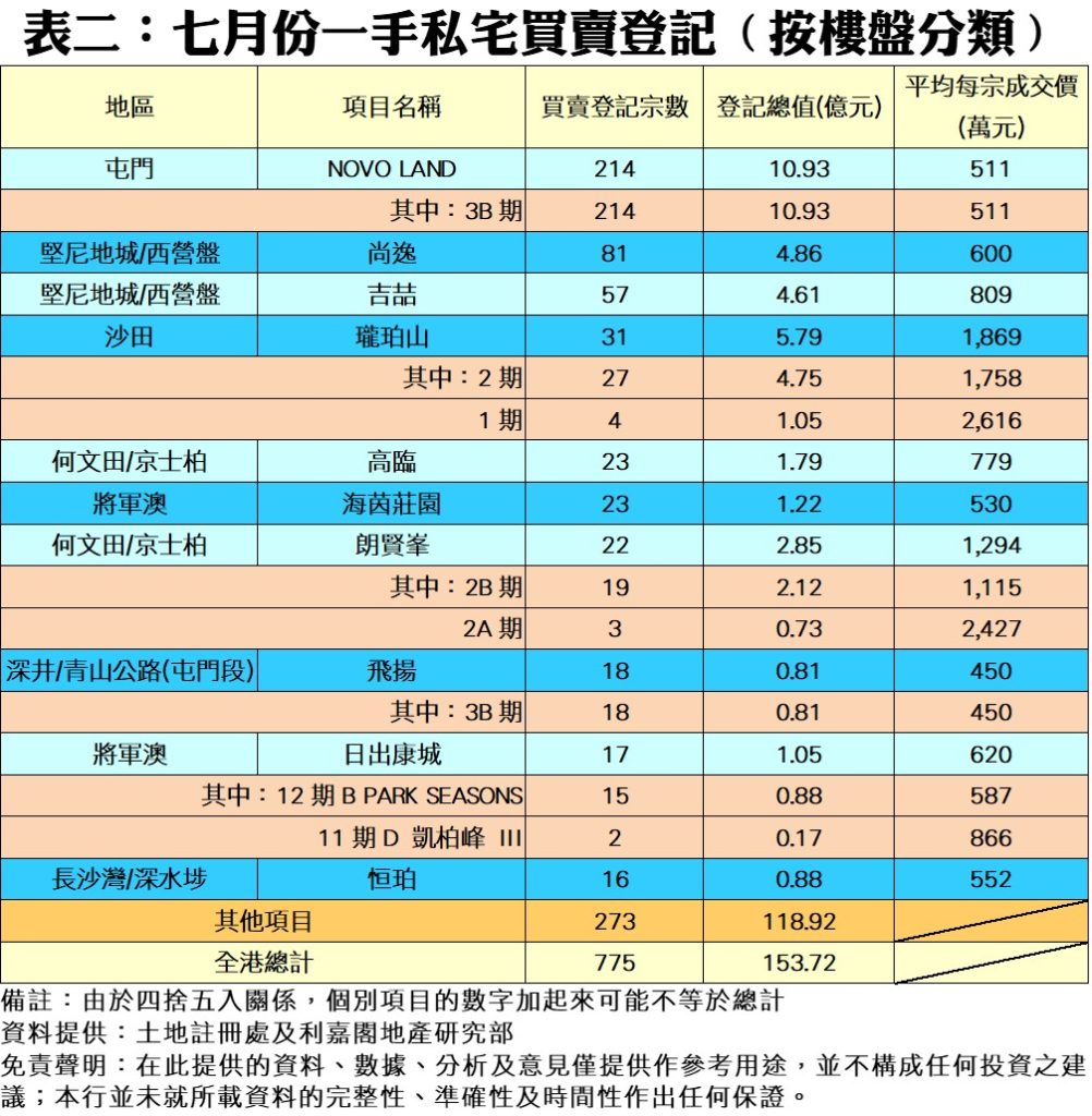 按樓盤分類(見表二),屯門NOVO LAND 3B期於七月份錄得214宗登記,成為月內登記量最多的一手私宅項目,登記總值達10.93億元,平均每宗登記約511萬元;其次為西營盤的尚逸及堅尼地城的吉喆,分別錄得81宗及57宗登記。至於排行榜內上月平均每宗買賣成交價最高者為沙田瓏珀山1期的2,616萬元;而屯門飛揚3B期的450萬元則為較低平均價者。