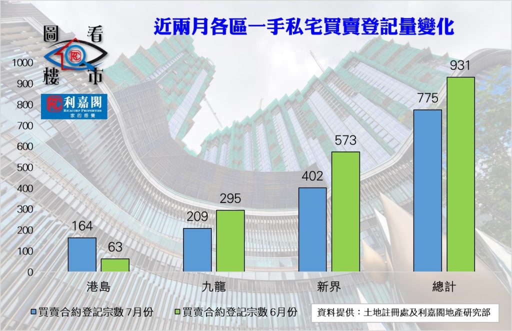 按地區劃分,今年七月份全港三區新盤登記量錄得兩跌一升,當中港島區在低基數下逆市造好,主要受惠兩個同區新盤開售而錄得多宗登記所帶動。總結七月份港島區一手買賣登記量按月大升1.6倍,共錄得164宗。至於,受惠期內登記量大升,相應買賣登記金額亦激增2.4倍,錄得80.50億元,惟主要是受一宗中半山地利根德里3號,涉及53億元的疑似內部轉讓登記所拉動。