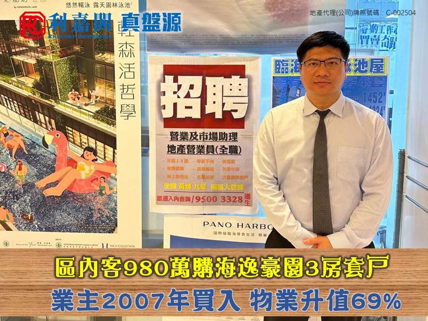 區內客980萬購紅磡海逸豪園3房套戶 業主2007年買入 帳賺4球離場