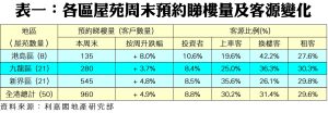 按地區劃分,港島、九龍及新界三區指標屋苑的周末預約睇樓量全線上升,其中以港島按周升幅最大,該區8個指標屋苑於周末暫錄135組客戶預約睇樓,按周增加8%。利嘉閣地產逸樺苑分行聯席董事吳玉蘭表示,受區內焦點新盤帶動,加上二手業主願意減價,康怡花園及南豐新村未來周末兩天的預約睇樓量較上周末增加;由於一手新盤開價,吸引客人留意區內物業,相信對二手亦有帶動作用,部分業主亦願意跟隨市場調整價格,帶動睇樓氣氛。
