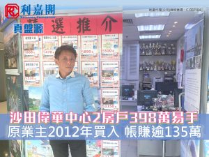 沙田偉華中心2房戶398萬元易手 原業主2012年買入 帳賺逾135萬元
