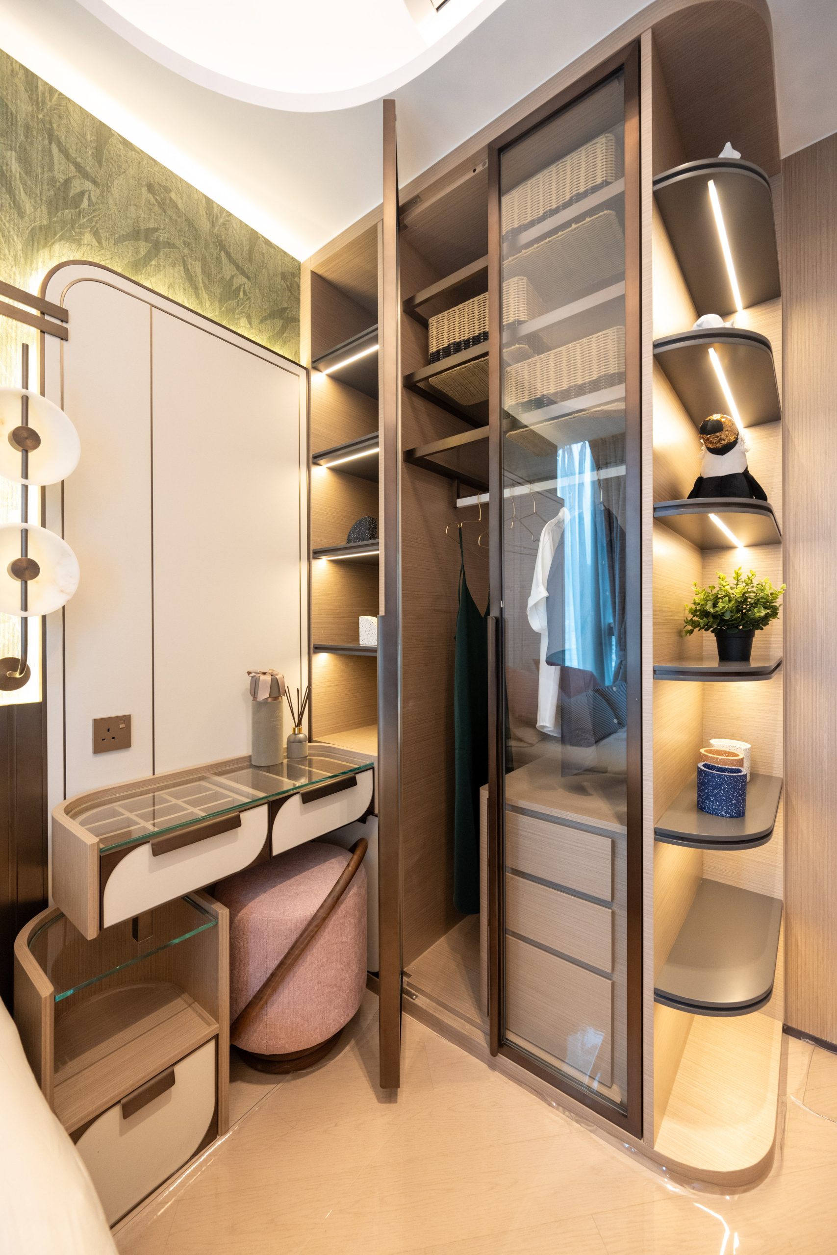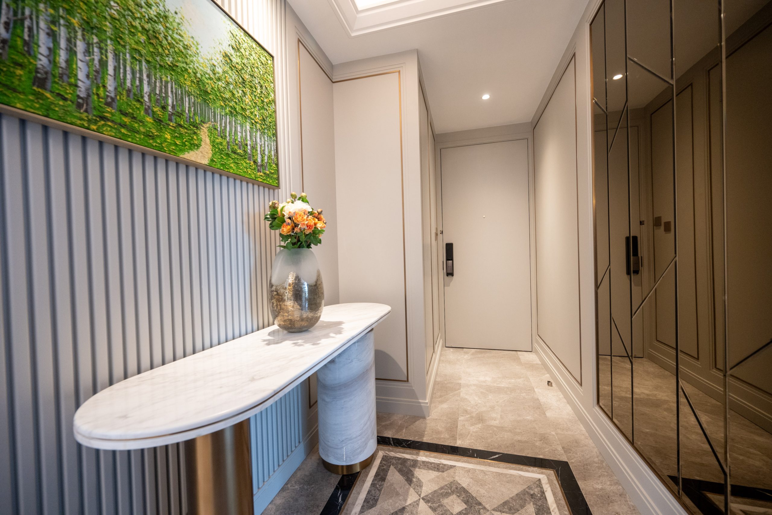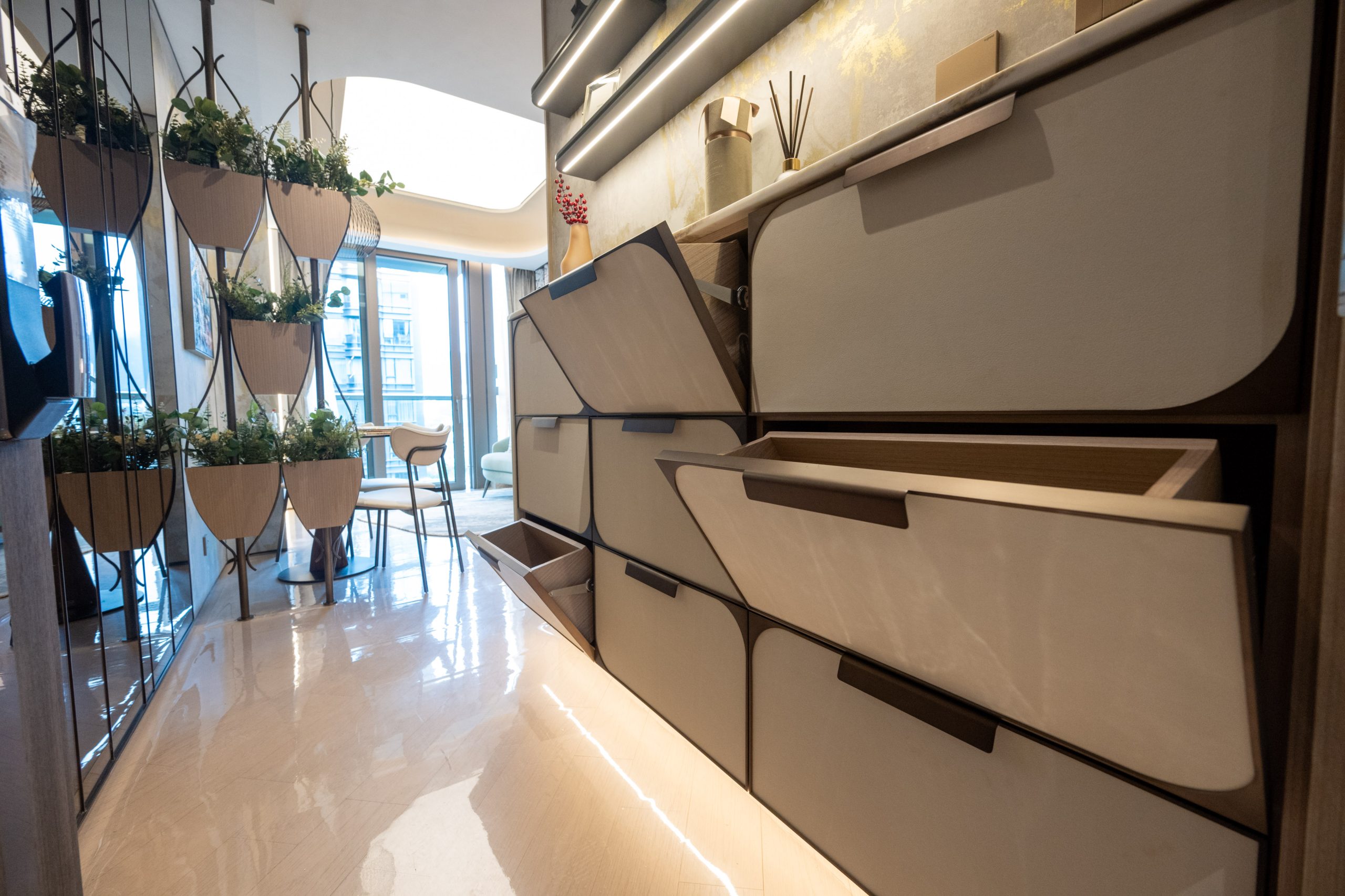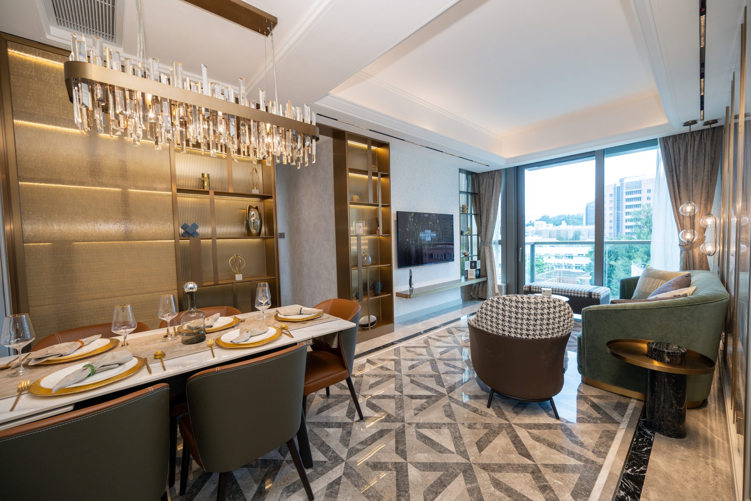 益兆集團控股旗下何文田太子道西266號重建項目「名鑽」設有2個連裝修示範單位,涵蓋三房及兩房間隔,實用面積分別為819方呎和448方呎。其中12樓C室,實用面積819方呎,三房一套連儲物室間隔,大門標配Samsung智能電子鎖,門口位連接玄關區,除了預留空間擺放鞋櫃,玄關的中空天花及左側鏡面設計,亦盡顯豪宅氣派。單位開則方正實用,長方型客飯廳連接全落地玻璃窗的露台,層與層之間的高度約3.3米,令室內空間感及採光率十足。單位坐向南方,可以俯瞰市區開揚景觀。