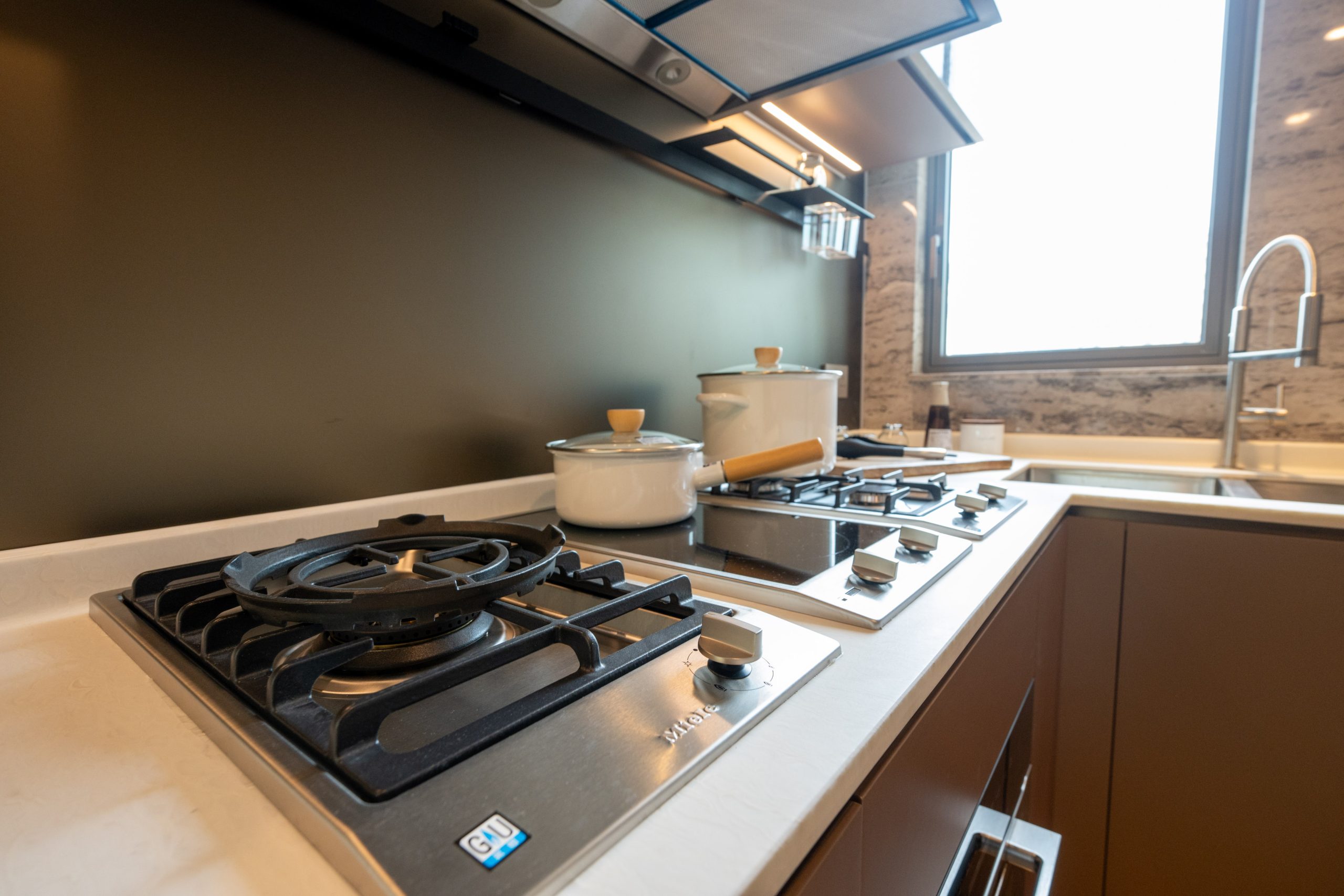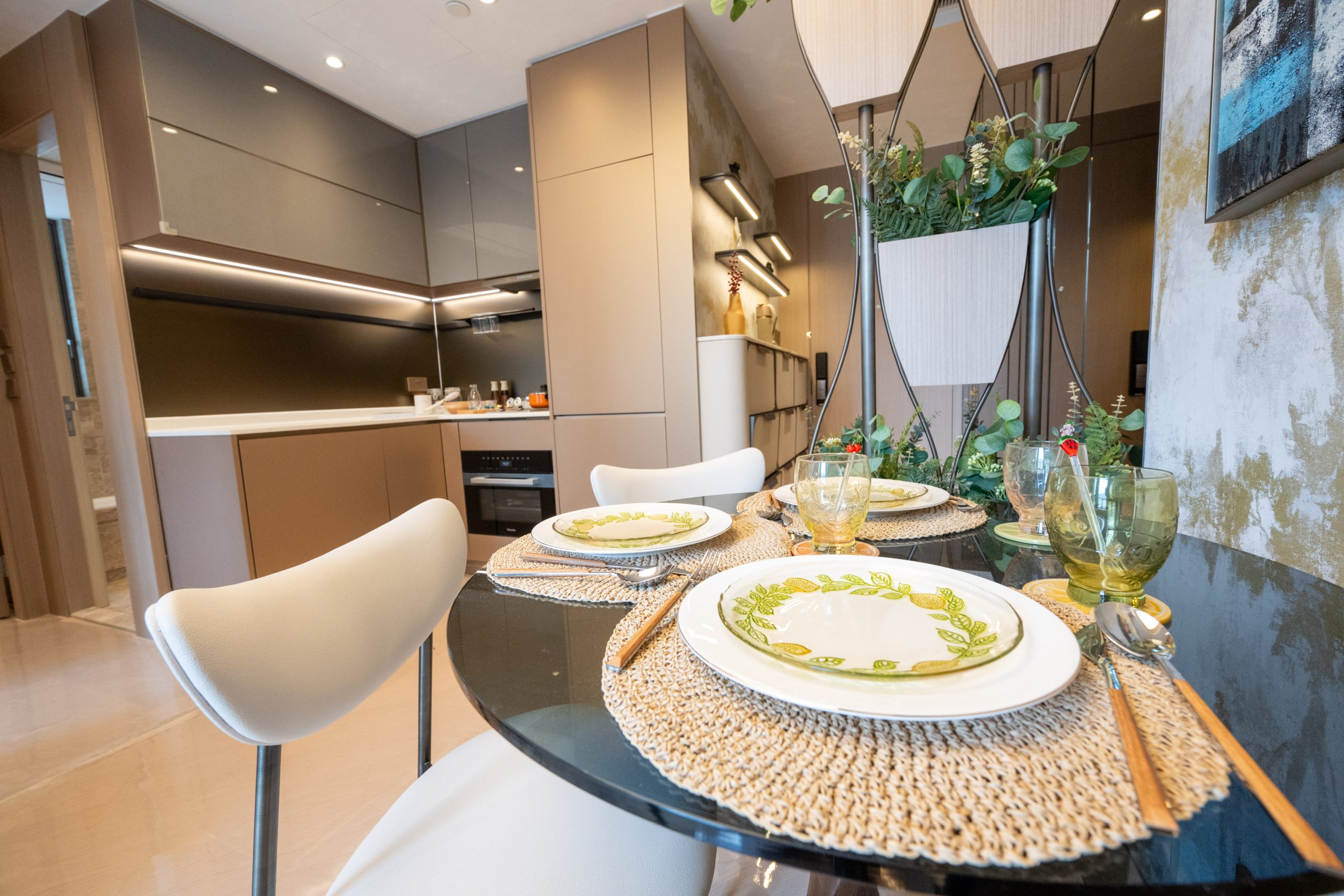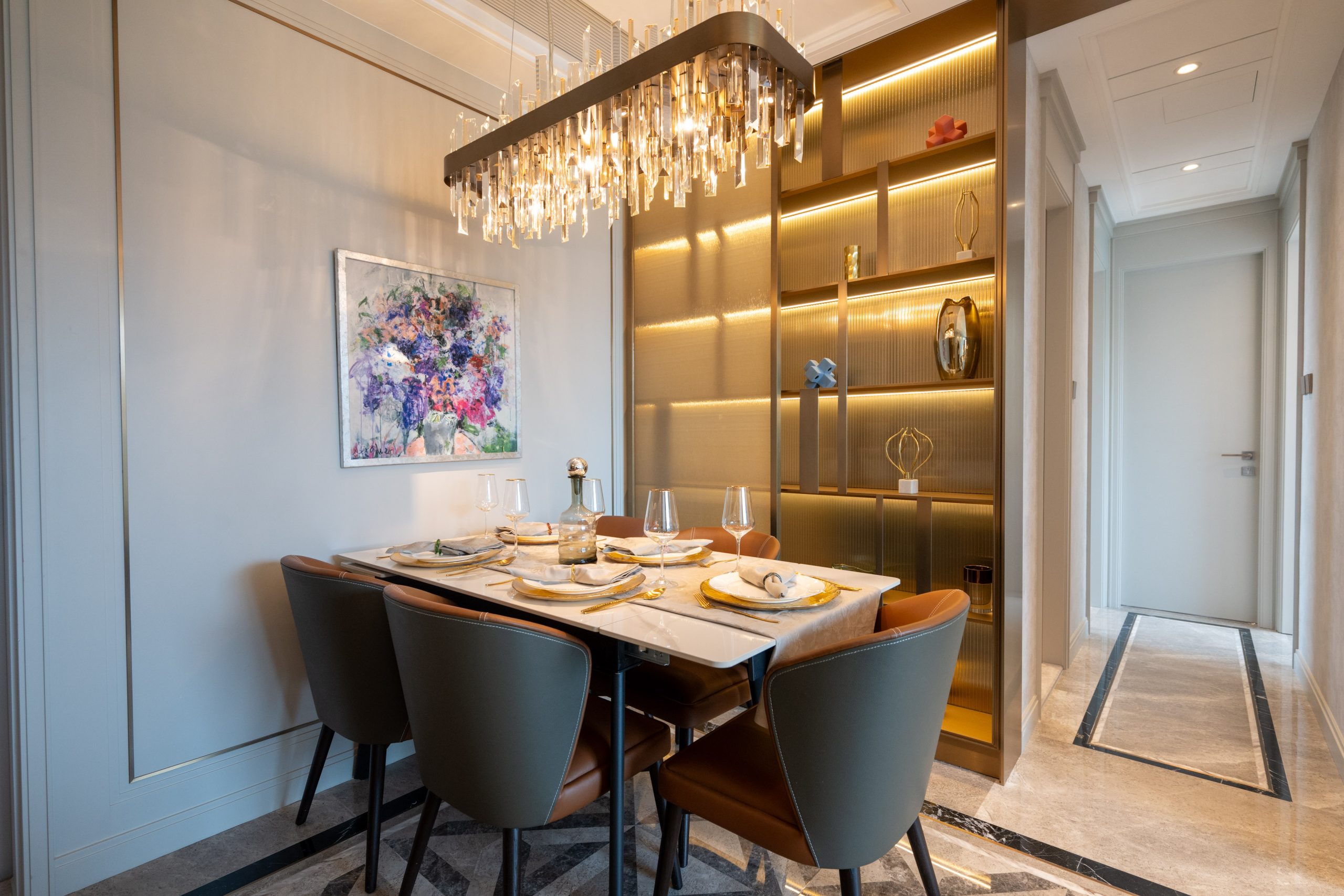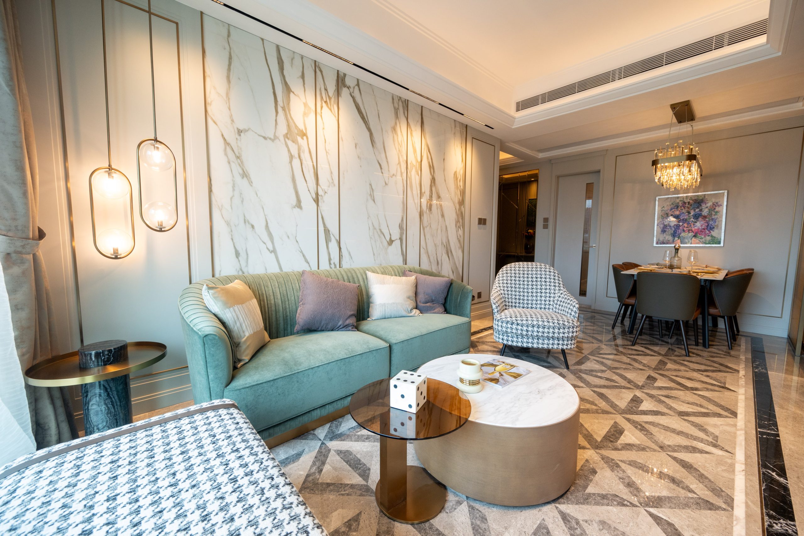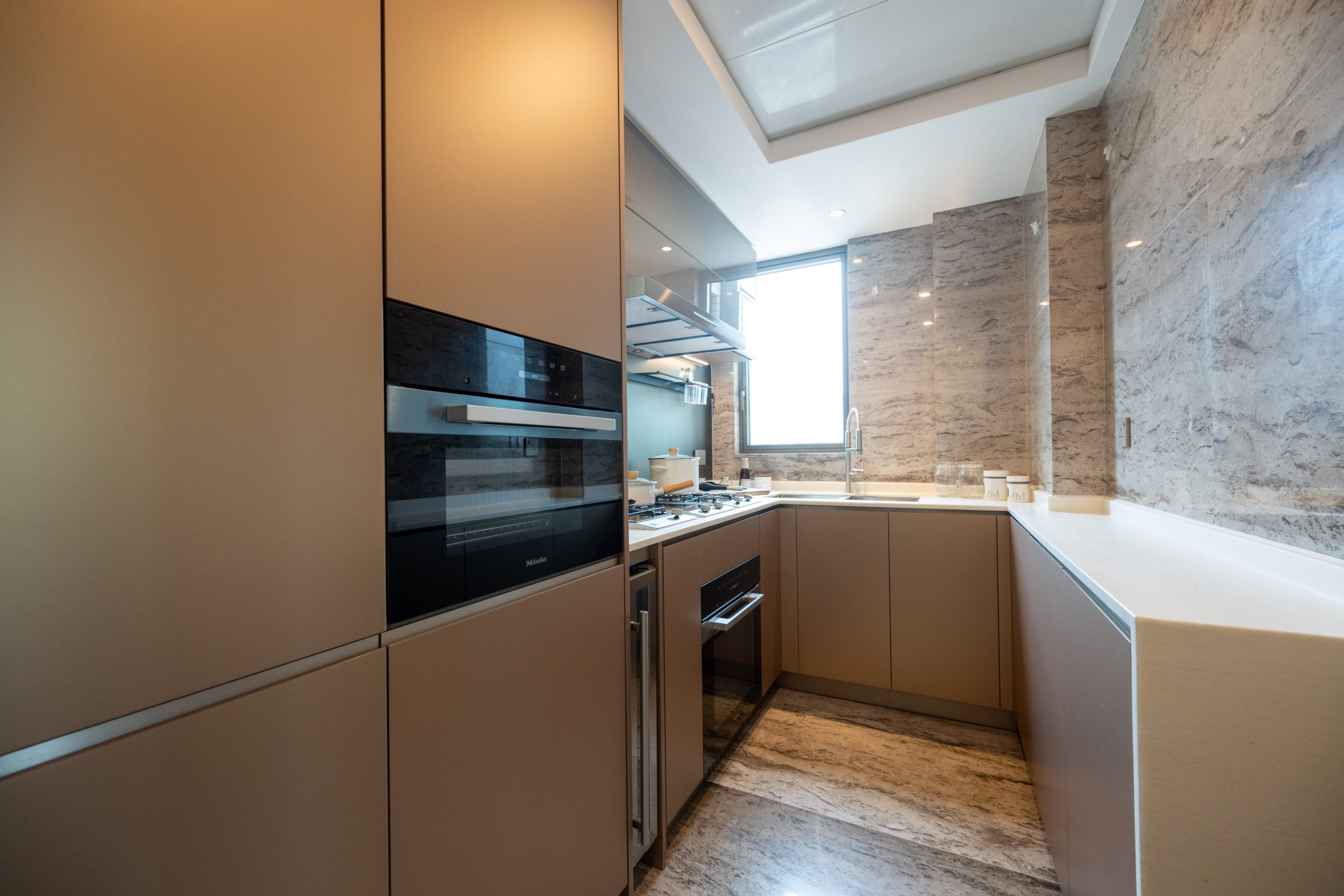 客廳及飯廳分區明確,易於擺放家具,客廳採用雲石地板,與飯廳的岩板牆面和中空暗燈天花設計互相配合,飯廳位置更設有特色吊燈及六人飯桌,令整體氛圍更顯雅緻。廚房為獨立梗廚設計,既支持明火煮食,亦配備電磁煮食爐可供使用。曲尺型的意大利物料金色門板座地櫥櫃及玻璃門吊櫃儲物空間十足,韓國人造石枱面亦提供充足備餐空間,同時配備一系列包括德國品牌Miele及瑞士品牌V-Zug的家電組合,更設有豪宅必備的酒櫃,配合雲石地板物料,提升空間的美觀與實用性。廚房內連設有獨立冷氣及洗手間的儲物室,可作多用途使用。