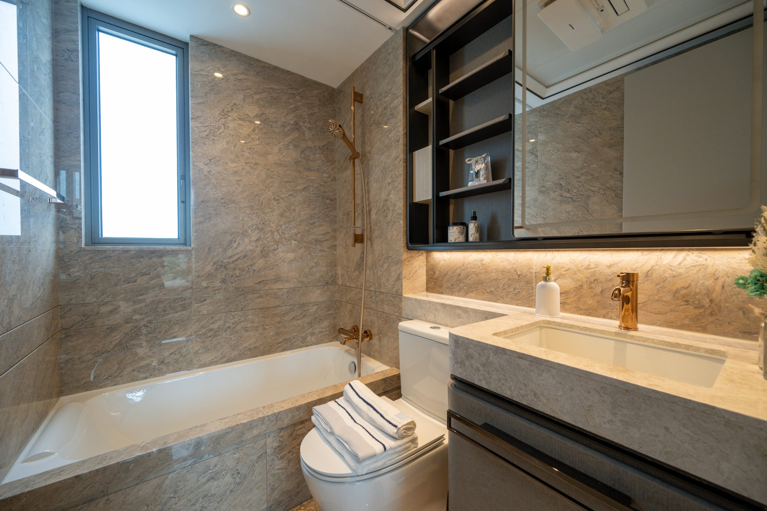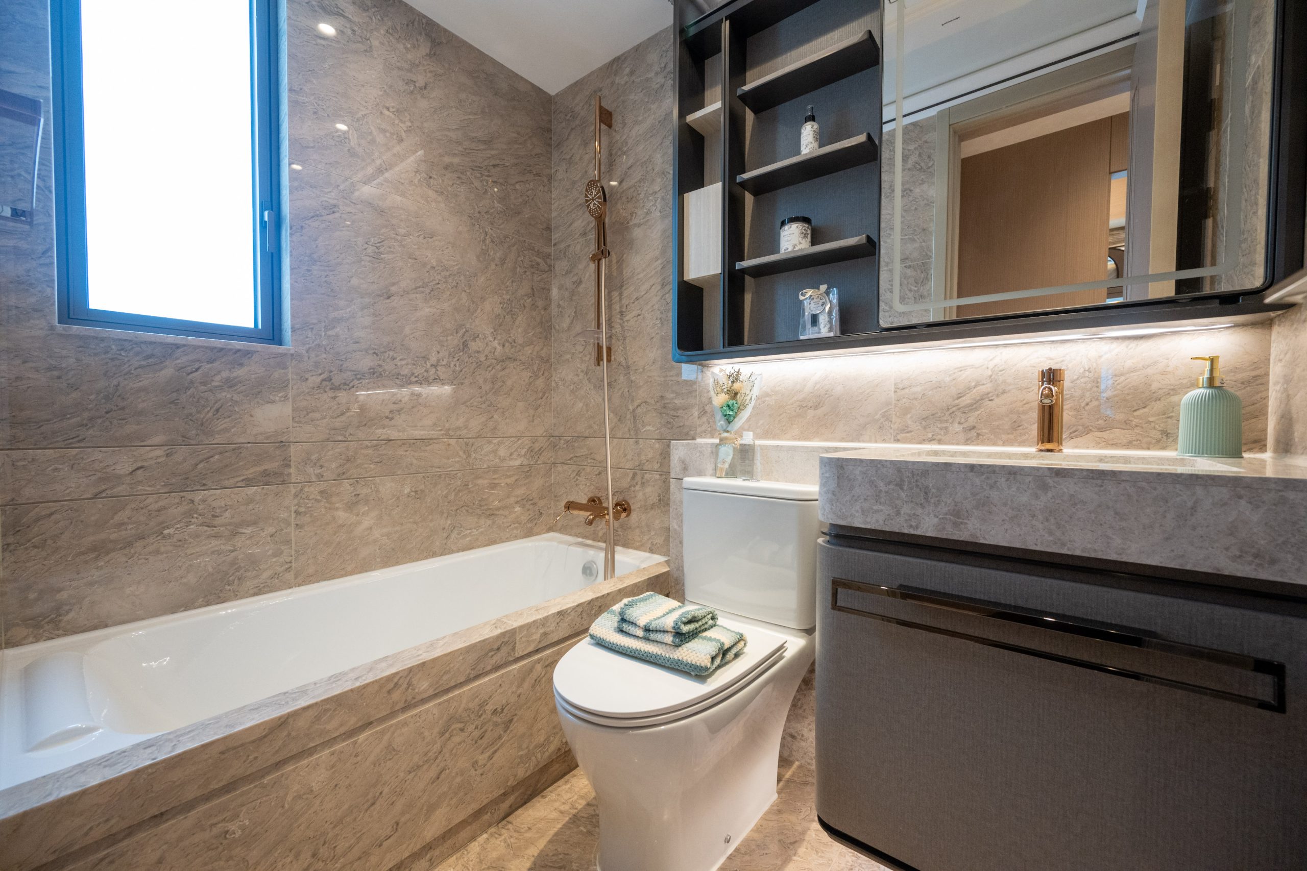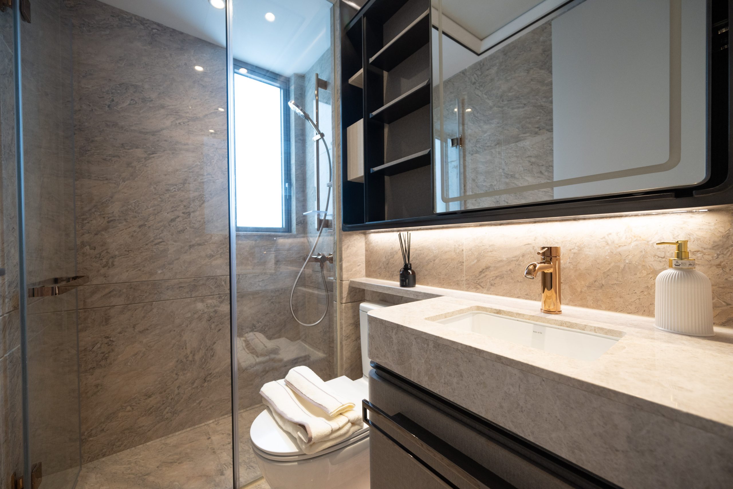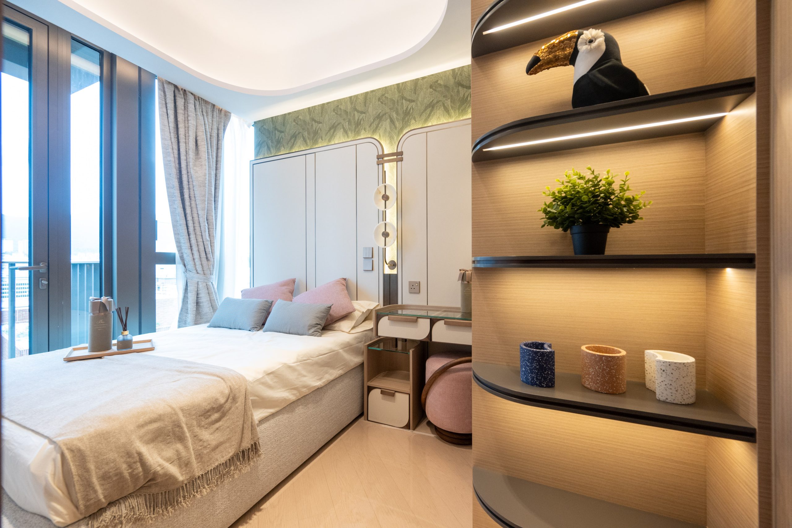 睡房1打造成小朋友睡房,設有靠窗的單人床,並配有透明玻璃衣櫃和儲物空間,呈現兼備童趣及温馨的現代風格。睡房2以書房布局打造,配有垂吊式書架,增添功能性和美感,工作或休息時可從窗外可以遠眺獅子山的壯麗景色,令人心曠神怡。主人睡房設計貫徹客廳典雅奢華的風格,中空天花配有環迴燈光,偌大的空間擺放三邊落床的大床,並配有兩邊的床頭櫃,組合櫃更預留嵌入式電視位置,締造舒適的寐室環境。主人房的套廁及客廁均配有通風窗的明廁設計,不僅採光充足,還能有效通風。以雲石為主要材料的主人套廁設有浴缸及知名衛浴品牌淋浴套裝,亦配備日本Panasonic浴室寶和英國殿堂級音響品牌KEF藍牙喇叭,用料講究,為住客提供便利與舒適並重的升級體驗。