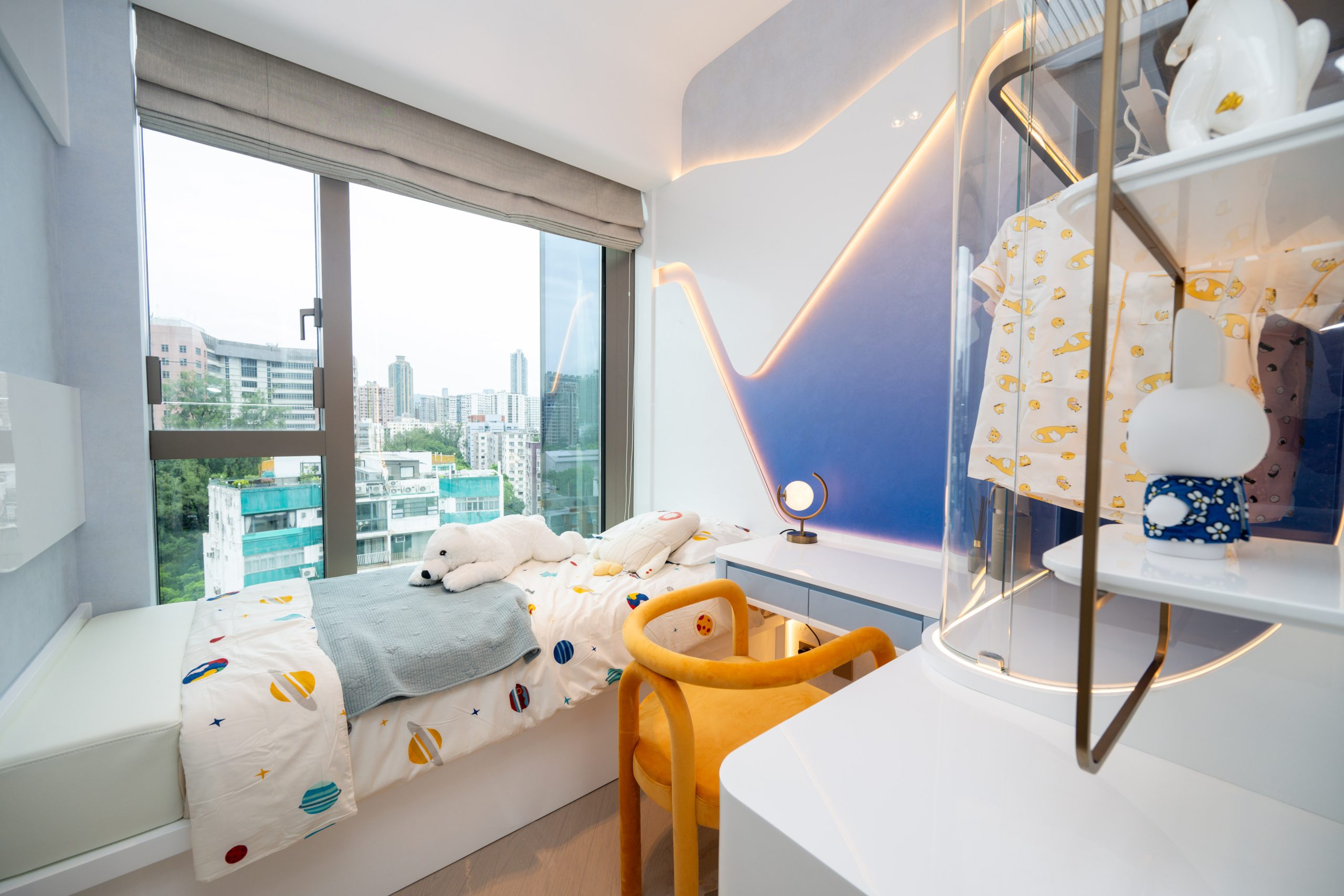 設計師將睡房改造成兒童房,充分利用高樓底的空間特性,設置配有書桌的高架床,加上落地玻璃鏡面和組合衣櫃,實用與現代感兼備。主人睡房的設計細緻考量,中空天花和環繞式燈光提供舒適的居住環境。房內配有組合衣櫃,放置雙人油壓床後仍可三邊落床,床邊設有儲物櫃和梳妝台,滿足各種生活需求,完美演釋高品質生活品味。浴室為明廁設計,雲石地板及燈光鏡面設計實用且易於打理,加上配有浴室寶及嵌入式藍芽喇叭,實用與華麗並重,為住戶提供優質生活空間。