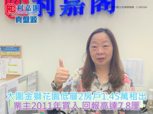 利嘉閣地產大圍名城分行助理分區經理呂學維(Ray)表示,該行客戶主任邱玉鳳(Pauline)最新促成大圍金獅花園2期F座低層6室的二手租賃成交個案,單位實用面積約336方呎,屬2房間隔,望內園景。
