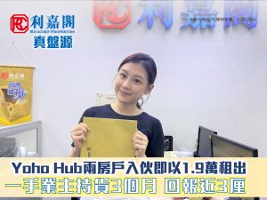 元朗Yoho Hub兩房戶入伙即以1.9萬租出 一手業主持貨3個月 回報近3厘