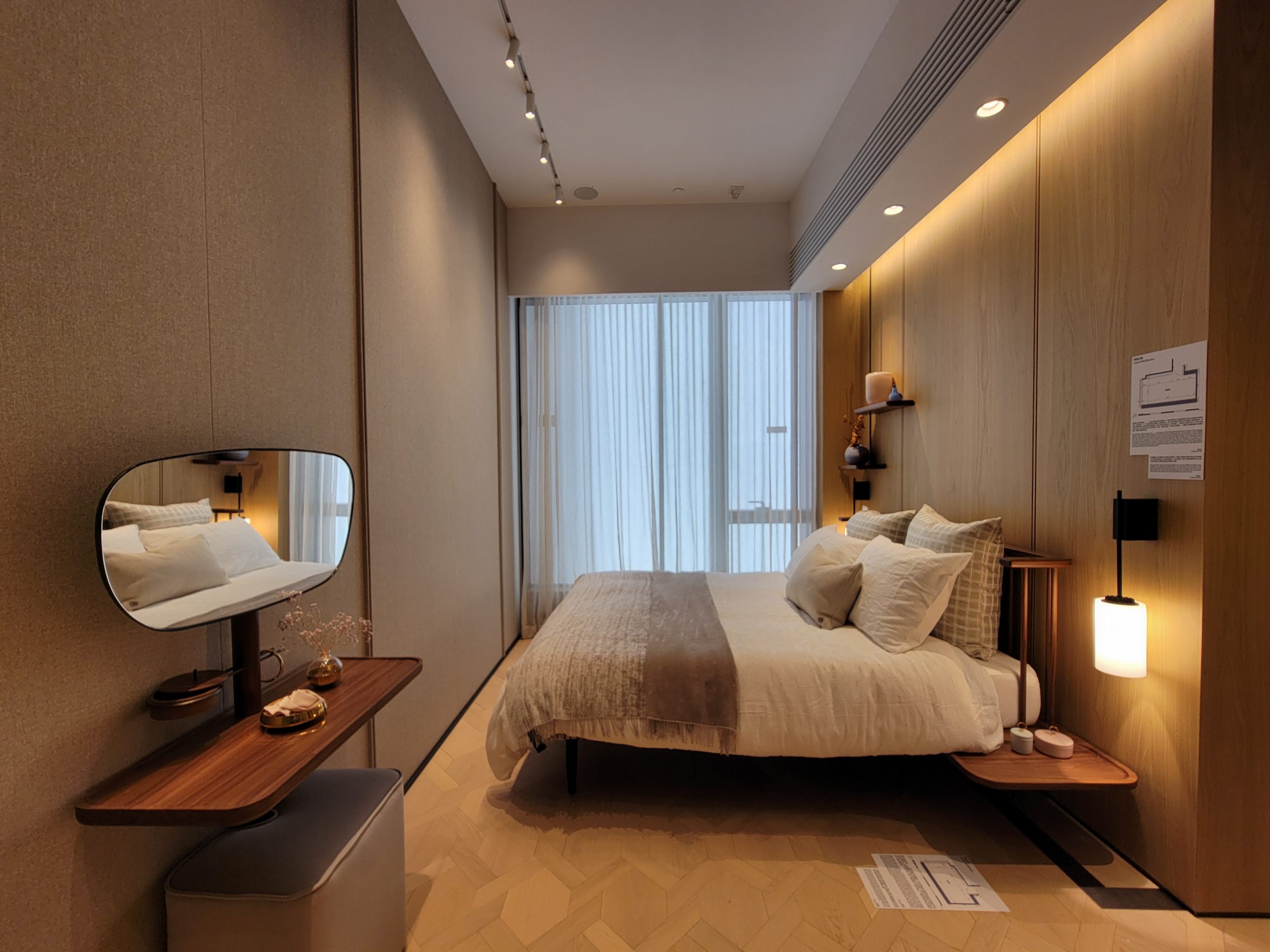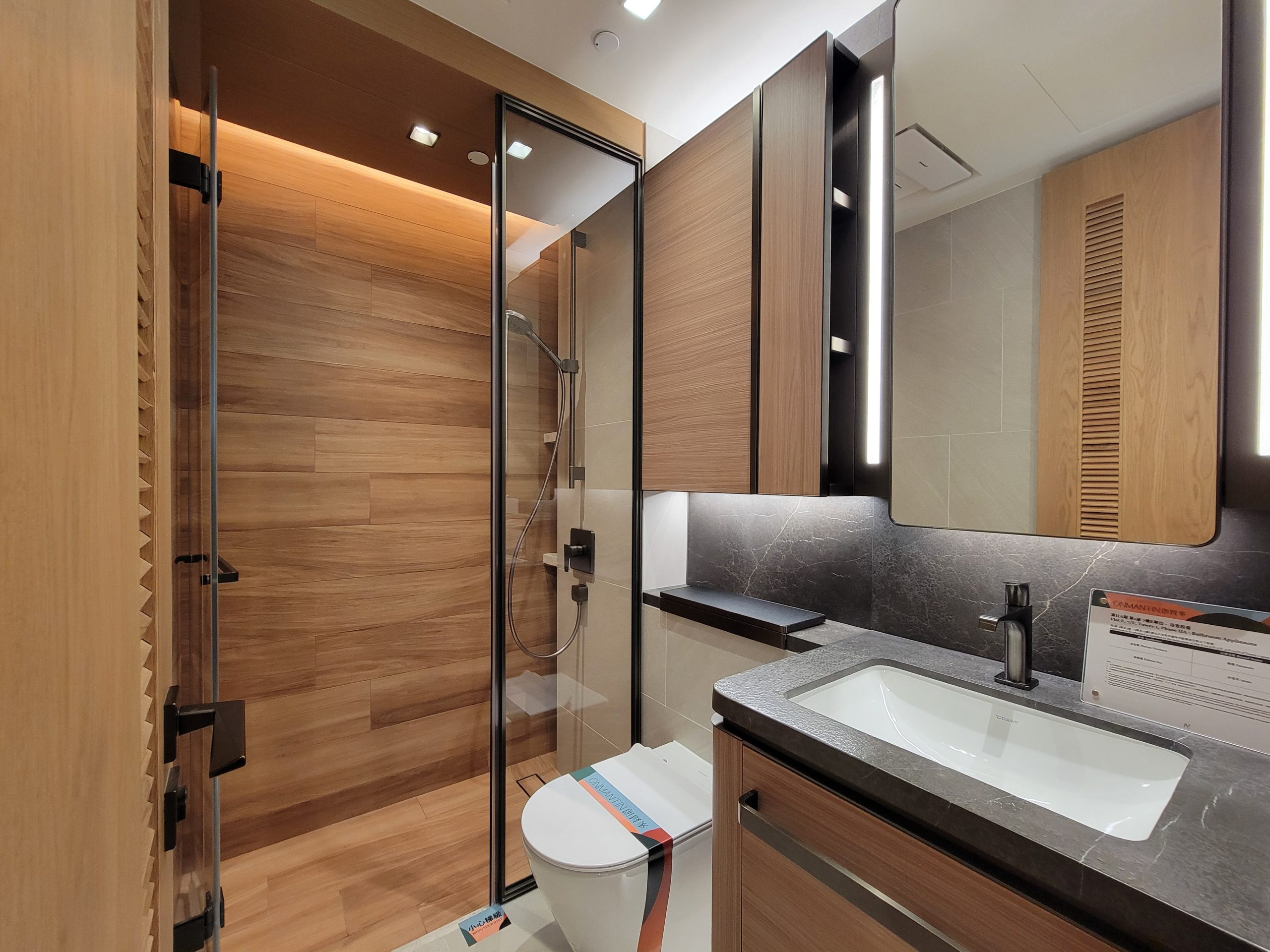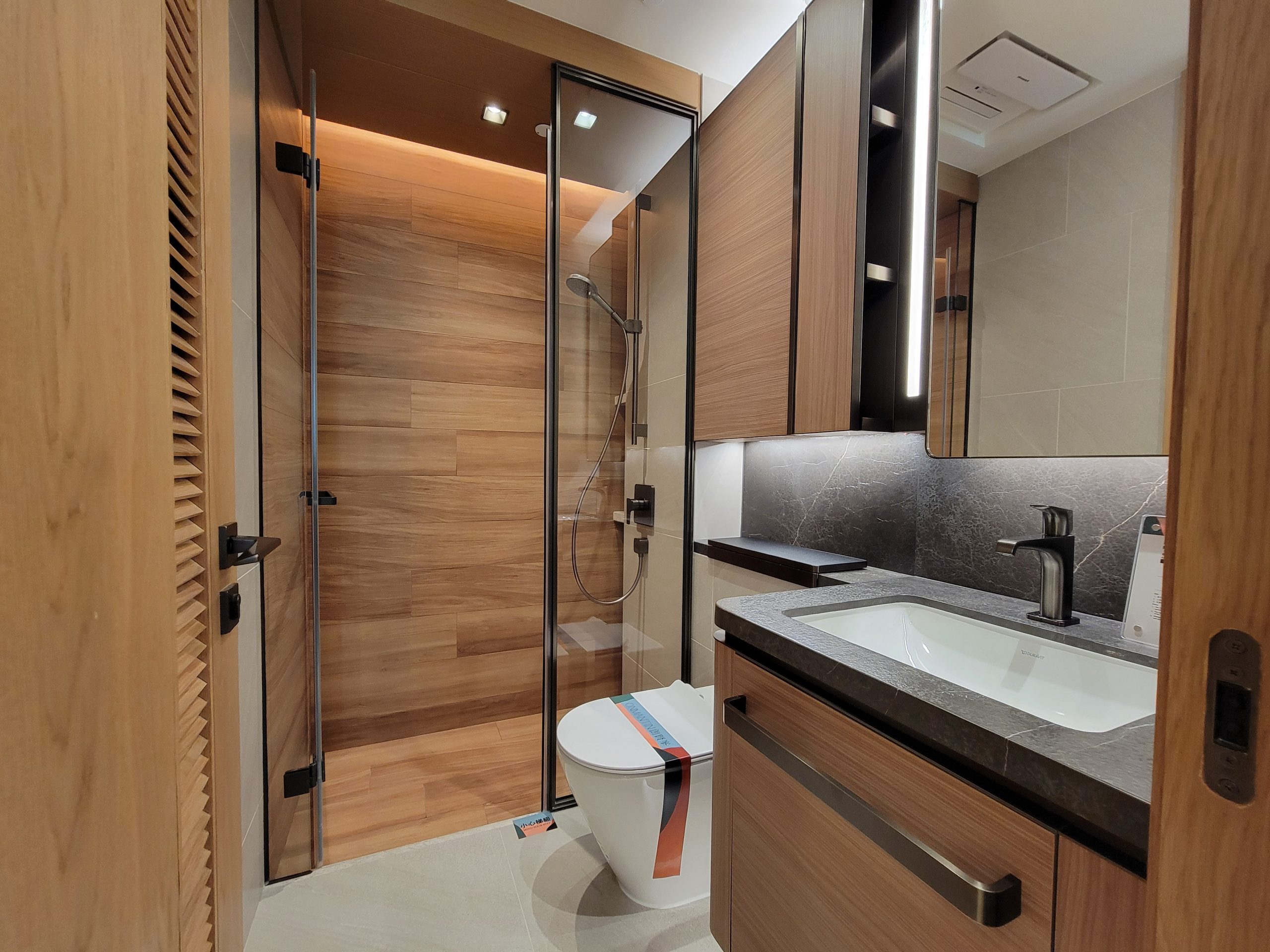浴室的設計同樣考究,採用了帶紅色的木質瓷磚、大理石瓷磚和青銅金屬修飾,貫徹了單位的獨特風格。浴室潔具均選用德國知名品牌AXOR及Duravit,同時特別配置了Panasonic浴室寶,體現了設計的貼心之處。全屋的窗戶採用IGU雙層中空玻璃,有效地達到隔音隔熱的效果。兩間睡房都配備了落地玻璃窗,確保室內採光度充足。其中,主人睡房特別預留了空間用於放置衣櫃,同時有足夠的空間擺放睡床、書枱或梳妝枱,能夠靈活地迎合不同家庭的需求。