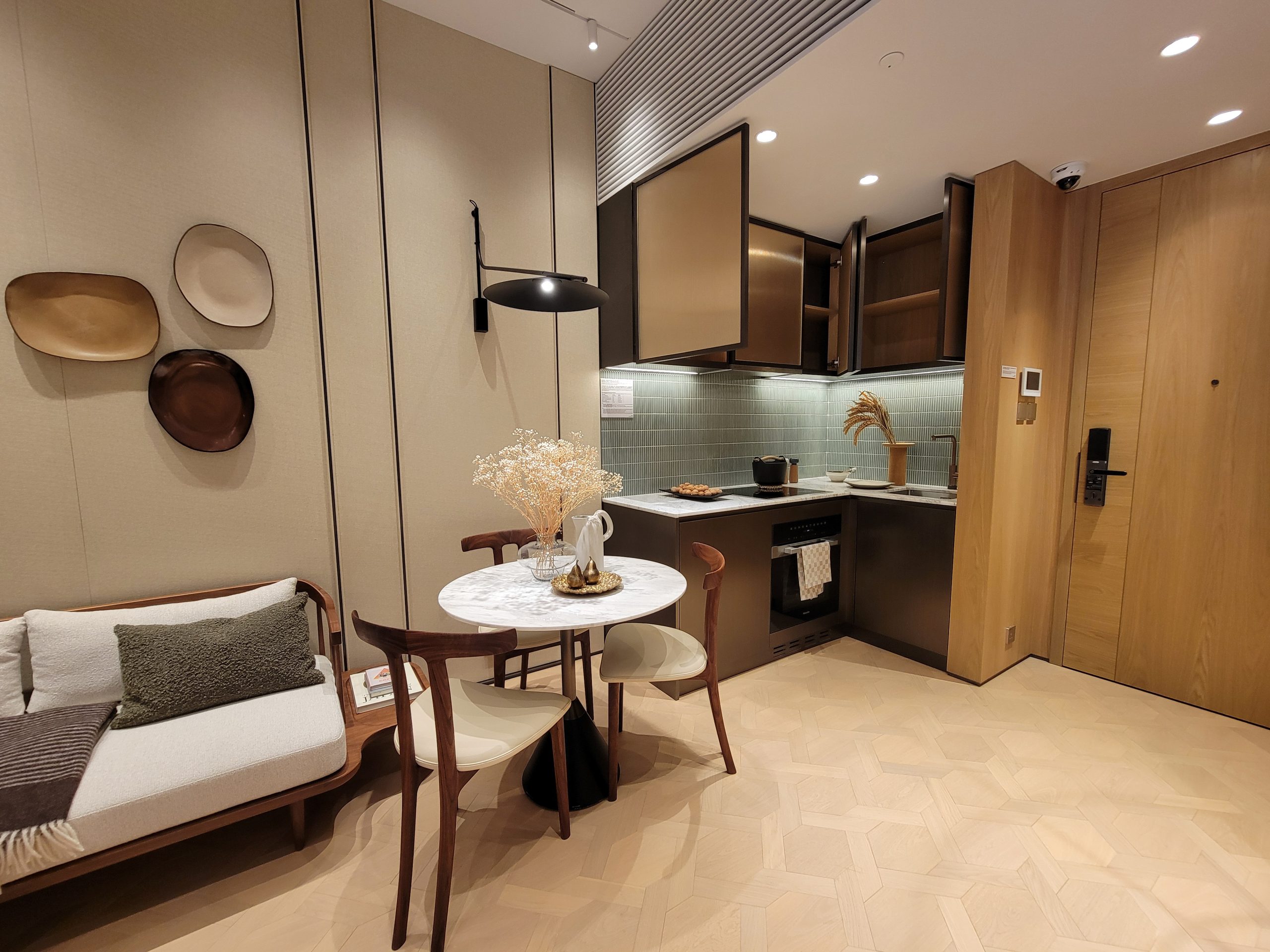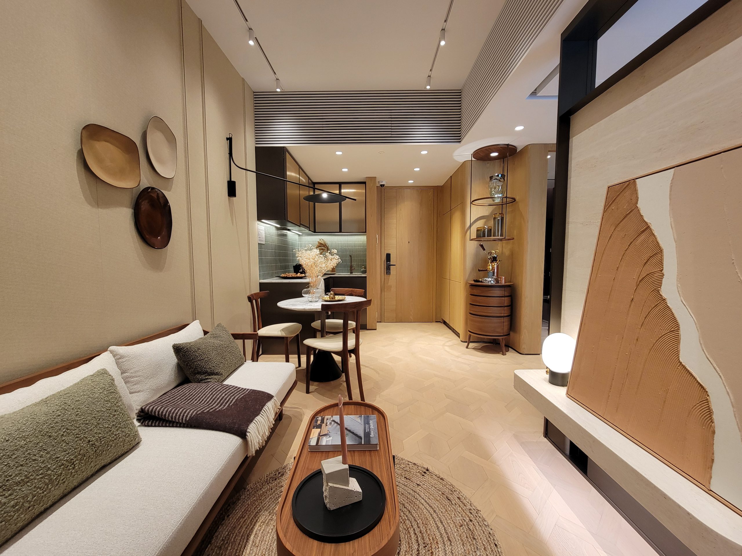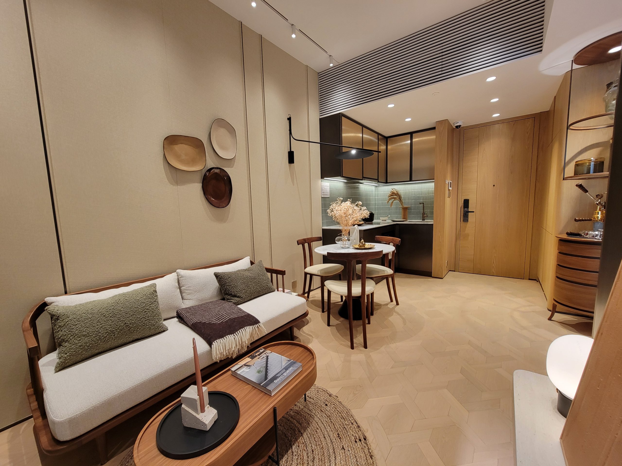 連裝修改動示範單位以追求品味生活的夫婦為設計對象,巧妙融合Japandi風格元素,融合日式侘寂與北歐極簡主義概念;設計師透過靈活運用自然元素和柔和色調,展現簡約舒適的獨特魅力。客廳鋪設淺色六角圖案橡木地板,搭配細緻的亞麻紋理壁紙,充分展示了自然材料的簡潔優雅。一張胡桃木框架配米色布藝的雙人沙發成為空間焦點,配搭胡桃木茶几、地毯及意大利拋光大理石牆面,呈現出天然石材與木材的和諧對比。飯廳擺放一張三人餐桌,上方懸掛獨特設計的吊燈,巧妙地凝聚整個空間的氛圍。