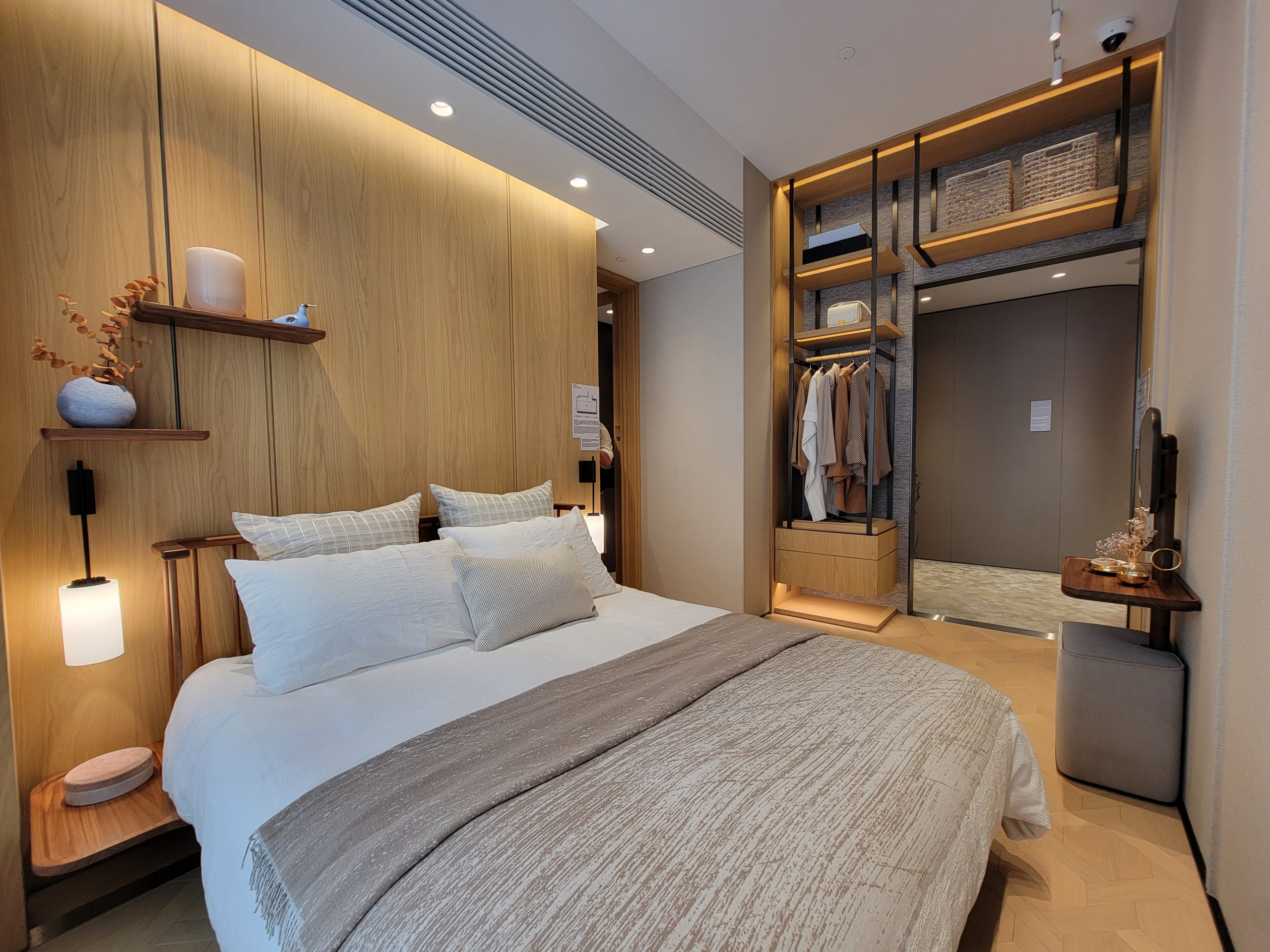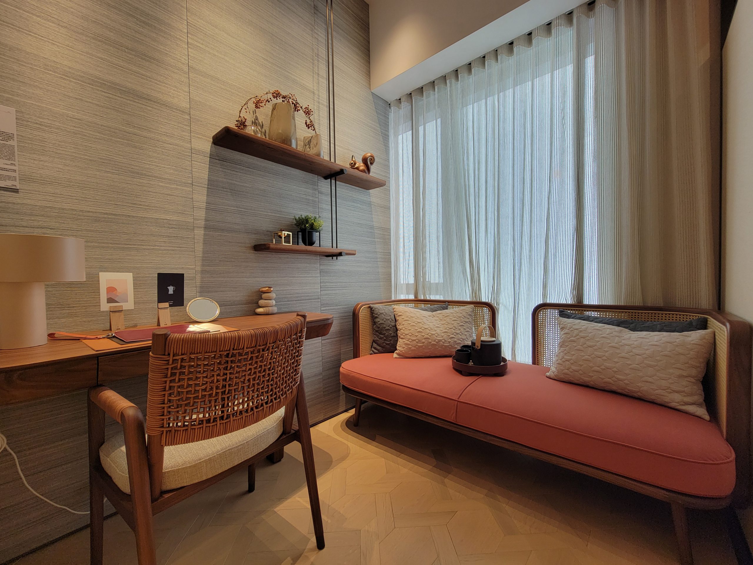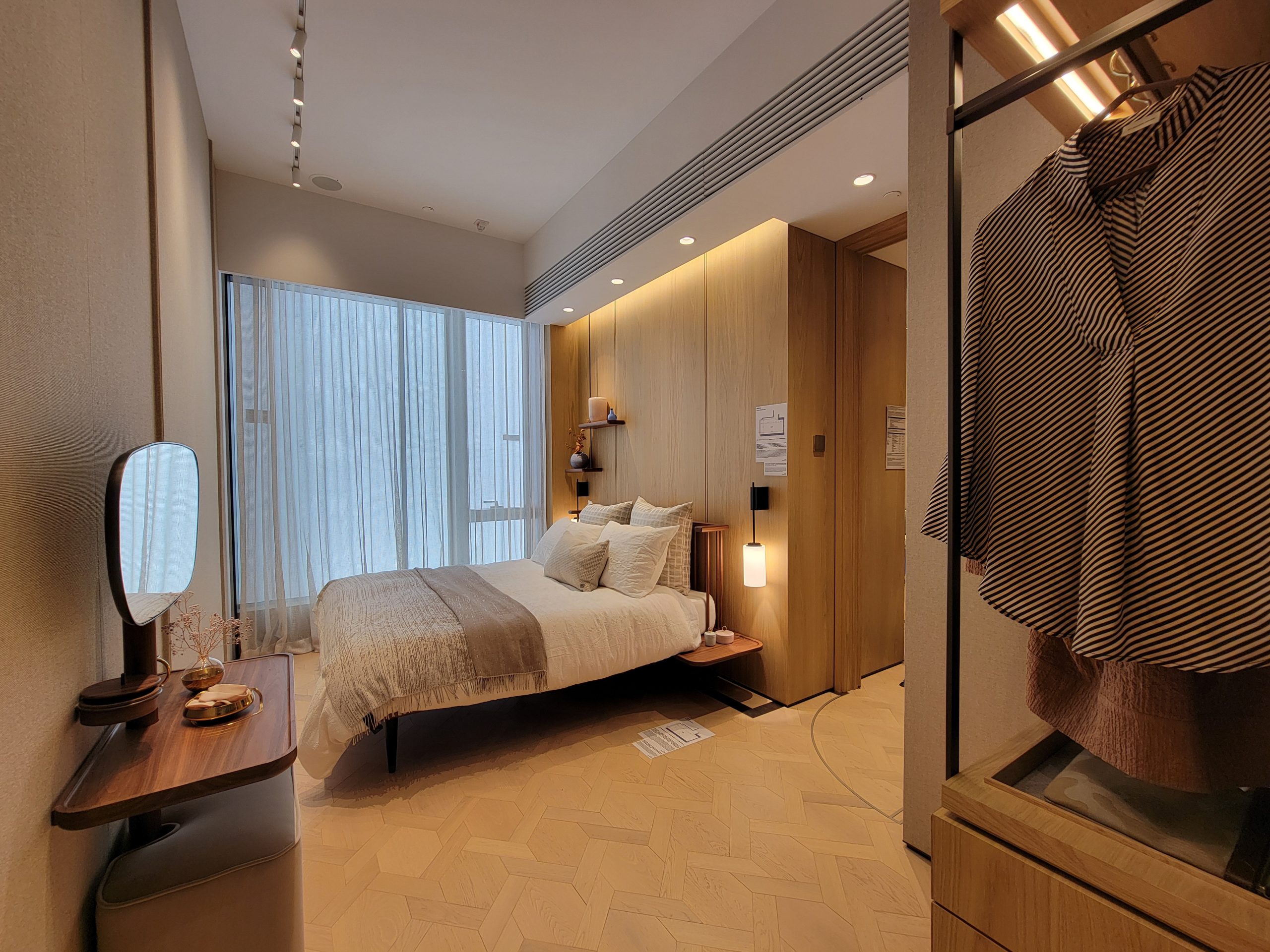 另一睡房巧妙打造成半開放式書房,採用雙趟門設計提升空間靈活性,同時增加視覺通透感。房內擺放書桌和座椅外,靠窗位置更特意擺放雙座位大型藤製躺椅,成私人閱讀角落。主人睡房放置Queen Size睡床後,三面仍保留充裕空間;透過大型觀景窗,可欣賞戶外綠意盎然的景致。木紋牆面、簡約玻璃擺設,結合柔和燈光營造舒適氛圍,配以胡桃木質梳妝台及約3米高的開放式衣櫃,將功能性和美學完美結合,打造出Japandi的優雅居住空間。