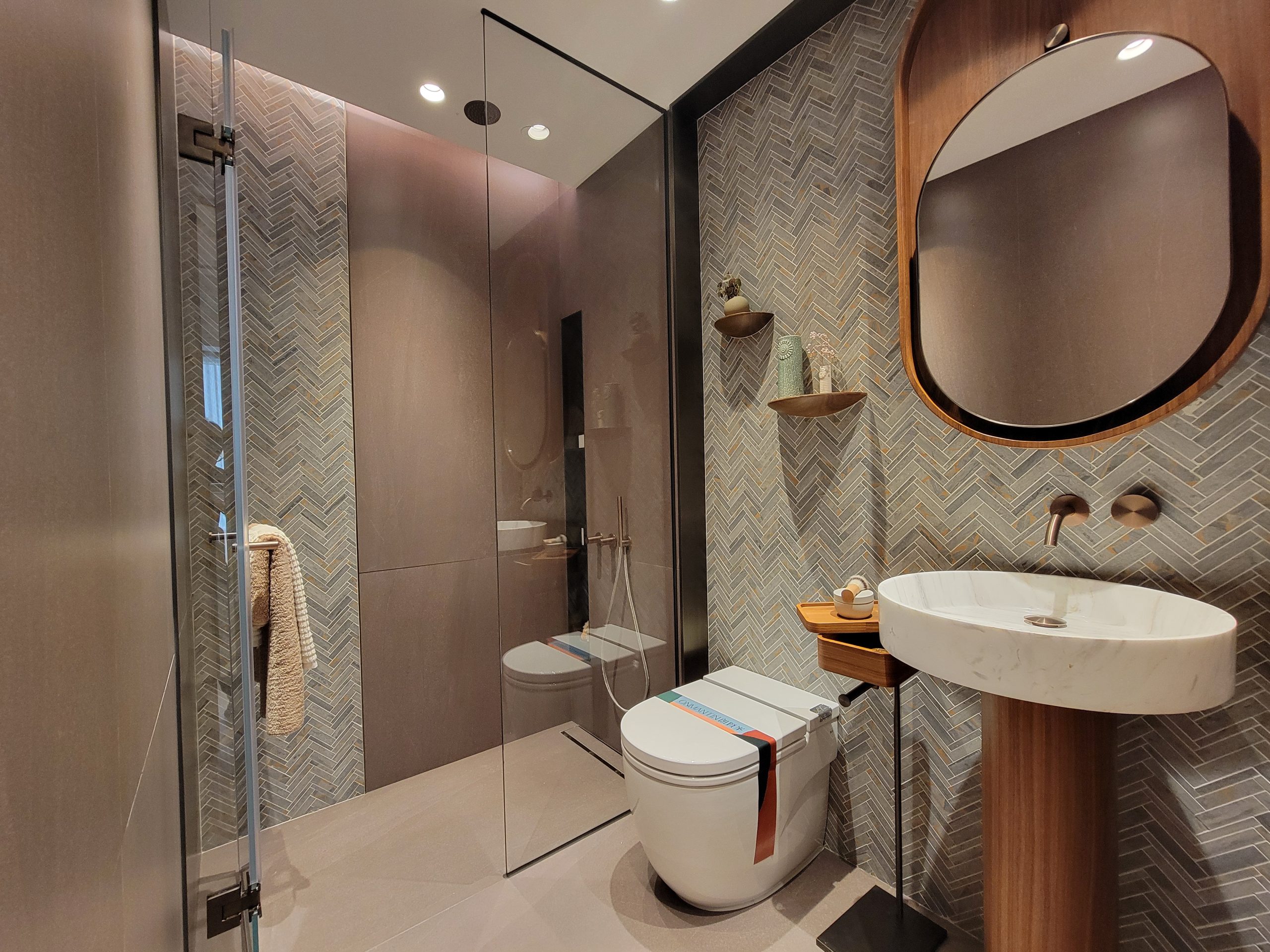 開放式廚房採用桐色廚櫃面板,配以翠綠色馬賽克磚和淺色檯面,完美融合日式和風與北歐簡約美學。特別設計的弧形咖啡角落,擺放精緻器具,進一步彰顯住戶的生活品味。浴室設計靈感源自日本「金繼」工藝,牆面以碎石馬賽克精心鋪砌,搭配雲石洗面盆和胡桃木鏡櫃,更體現了對細節的追求。