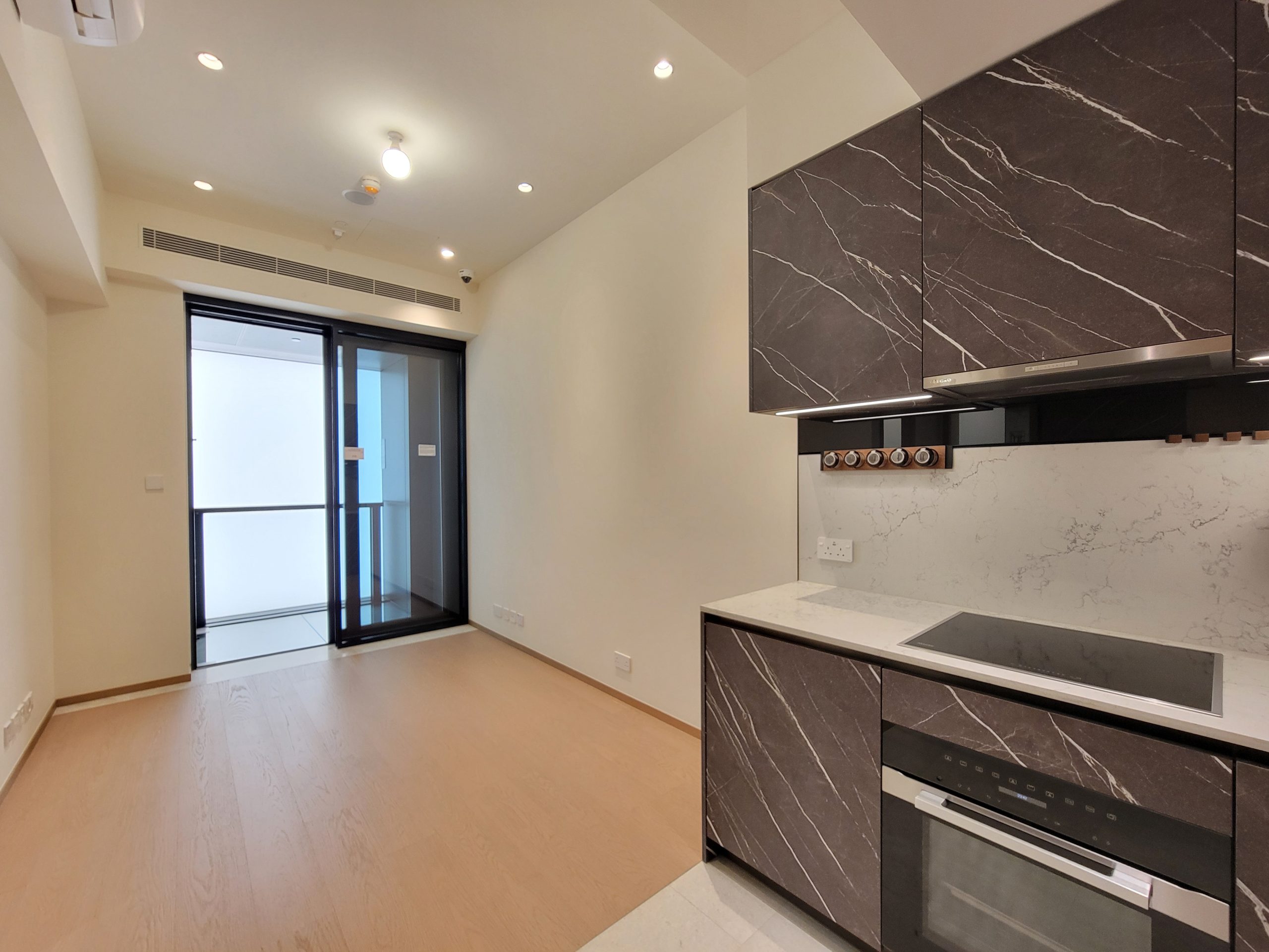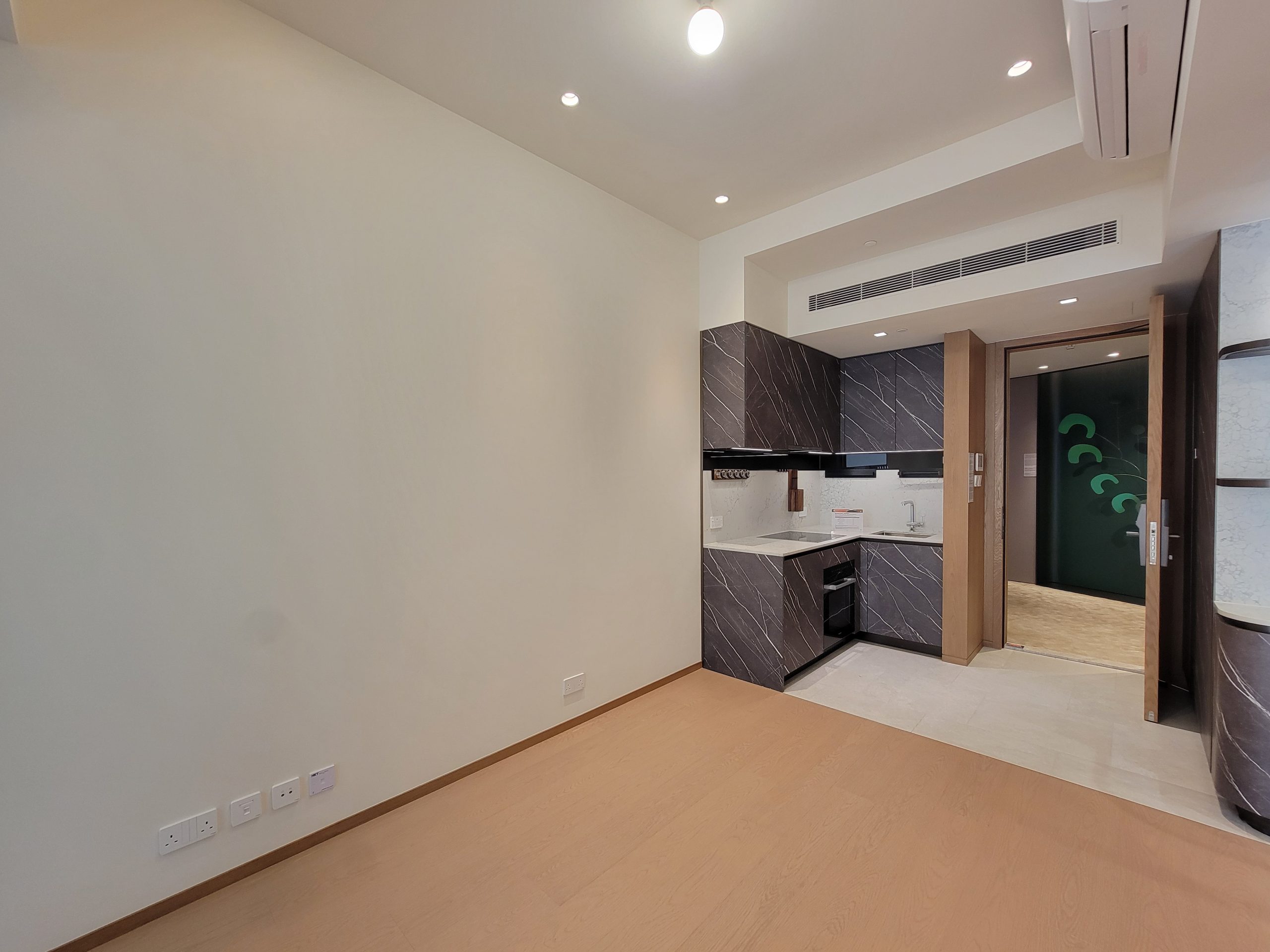 無改動示範單位客廳與兩間睡房採用橫向排列,景觀同向,享東何文田休憩處的開揚綠化景致。單位一大特色是何文田站頂獨有的三合一環保露台,巧妙地結合了露台、工作平台及冷氣機平台的設計,使室外空間更加寬敞實用。整個單位間隔四正,層與層之間的高度達到3.3米,營造出十足的空間感。在門口玄關的左面,設計師巧妙地安排了一組嵌入式儲物櫃,內設靈活層板及電插座,為住戶提供充足的儲物空間。