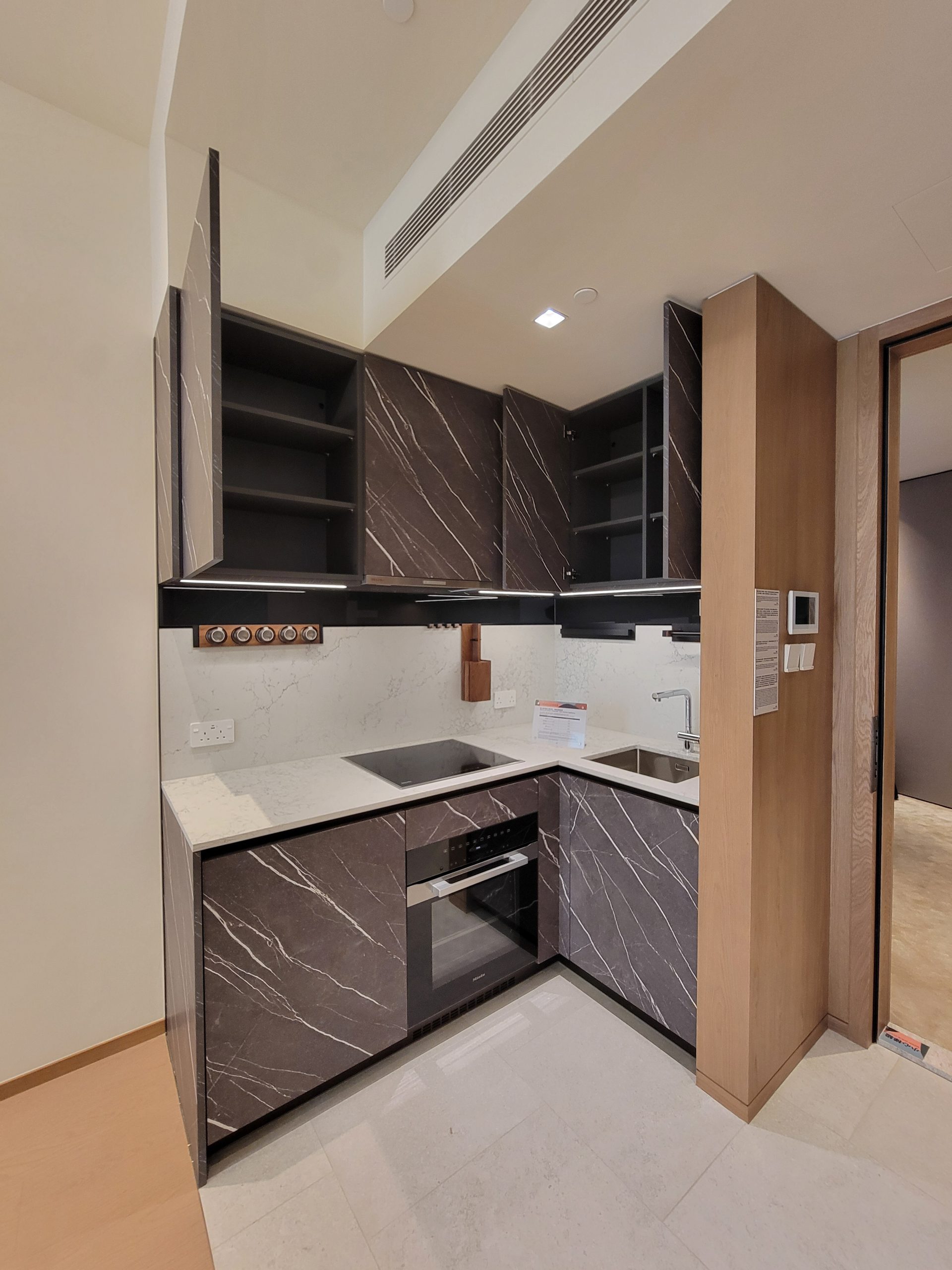 廚房設計別具匠心,帶有個性的深灰色石紋廚櫃面板與淺色檯面相結合,為整個烹飪空間增添獨特個性。特大的L型煮食檯面設計不僅實用,還配備了著名德國品牌Miele的四頭電磁爐、抽油煙機、蒸焗爐及雪櫃。鋅盤採用瑞士品牌Franke,水龍頭則選用意大利品牌Gessi,優質的選材用料盡顯氣派。