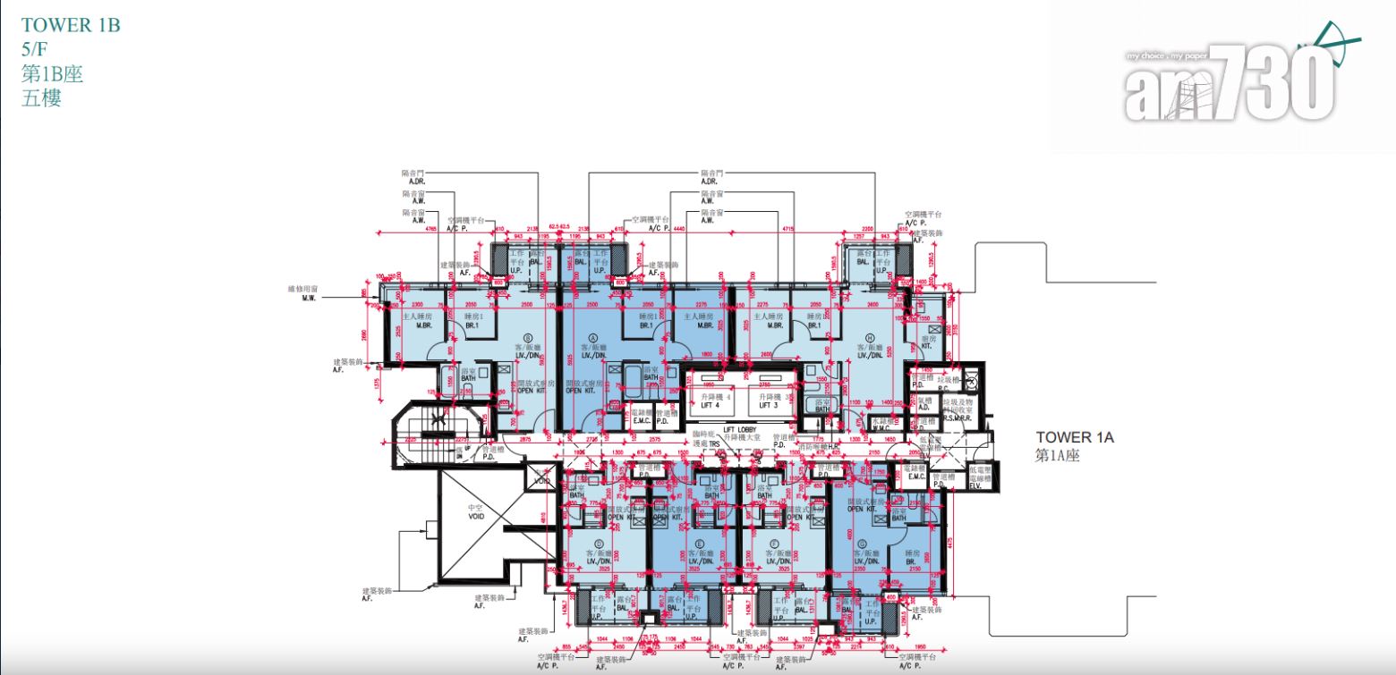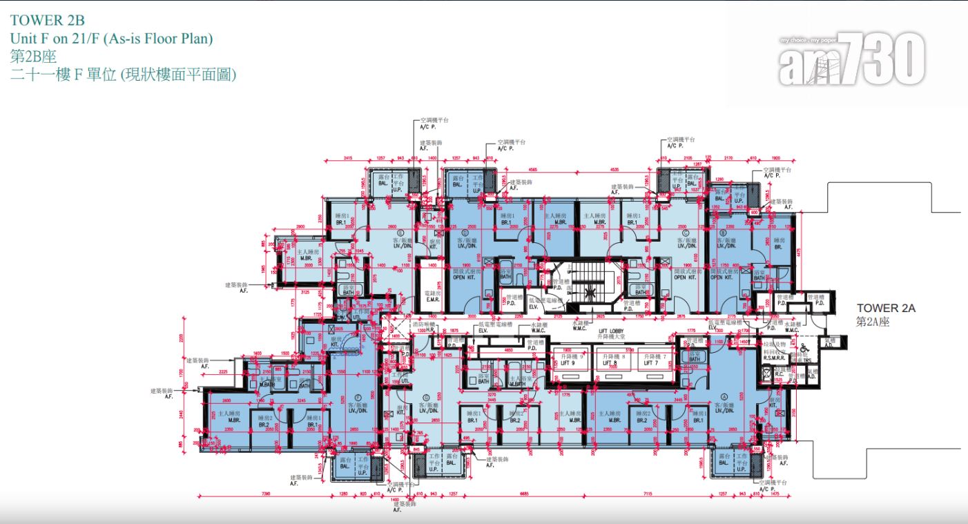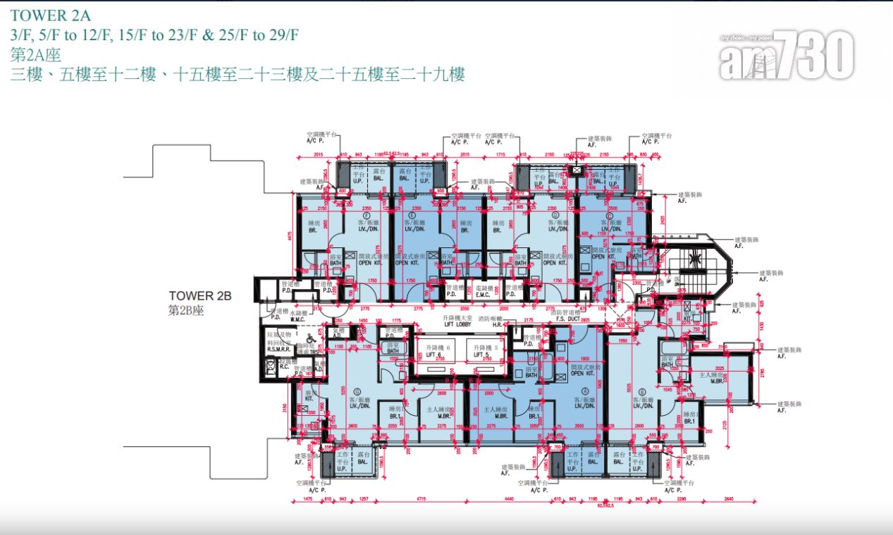 戶型分布方面,項目標準單位涉及701伙,實用面積由244至705方呎。項目主打兩房單位,提供292伙,佔近42%,實用面積由437方呎至509方呎。開放式及一房單位合佔約48%,各提供97伙和239伙,開放式實用面積由244至250方呎;一房實用面積由300至311方呎。另三房單位佔約10%,涉及73伙,實用面積由593方呎至705方呎,全部分布在第2座,廳房同向,享維多利亞港海景。