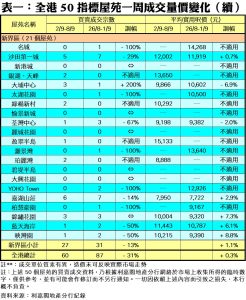 至於,新界區21個指標屋苑上周共錄27宗買賣,較前周的31宗減少13%,當中荃灣中心成交量由前周的3宗,減少67%至上周1宗;藍天海岸及映灣園分別只有1宗交投,各自按周減少50%;沙田第一城及嘉湖山莊分別錄得5宗及6宗成交,各自按周減少29%及14%。此外,在全港50個指標屋苑之中,上周共有19個屋苑錄得「零成交」,較前周的20個減少5%,當中九龍區及新界區分別佔7個及10個屋苑,港島區則佔2個(詳見表一)。