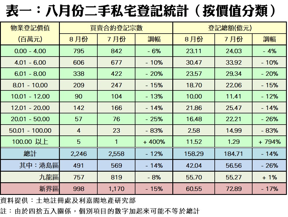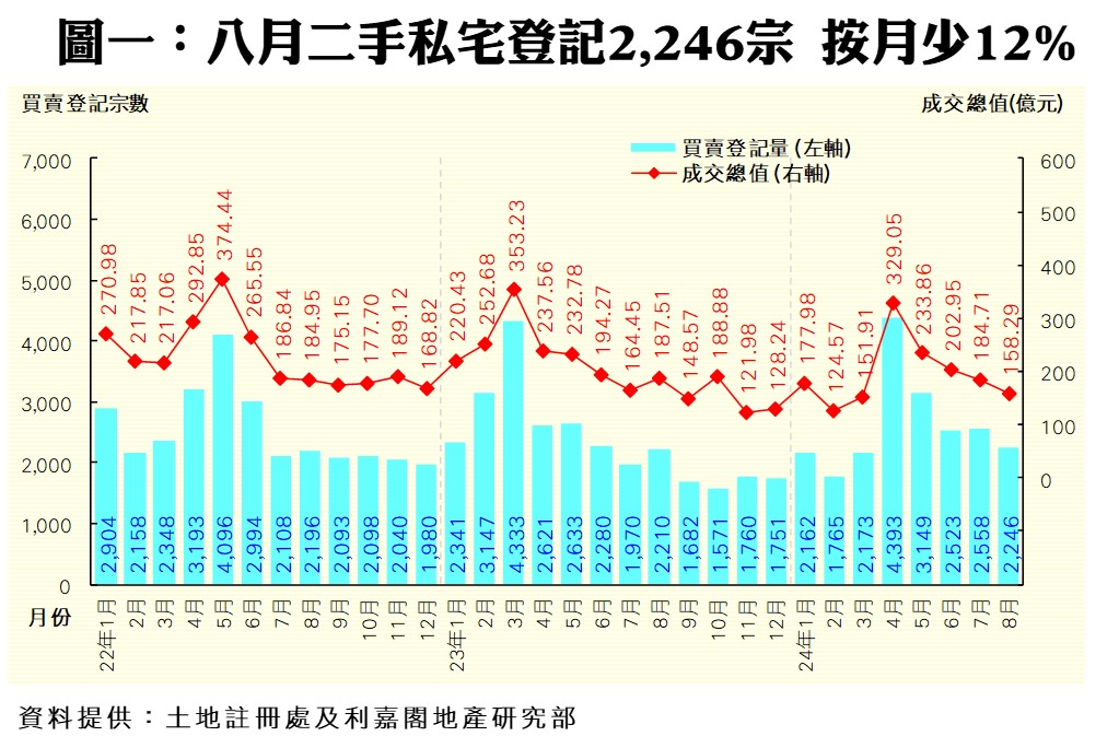 利嘉閣地產研究部主管陳海潮表示,市場預期減息在即,準買家入市心態不一,有審慎亦有積極者,整體樓市格局料在落實減息後才有較顯著變化。根據土地註冊處數據所得,2024年八月份全港共錄2,246宗二手私宅買賣登記(數字主要反映七月中旬至八月上旬期間的市場實況),較七月份的2,558宗減少12%,反覆偏軟,創近5個月低位。至於,八月份登記總值按月持續跌14%,錄158.29億元,連跌4個月兼為近5個月最少。