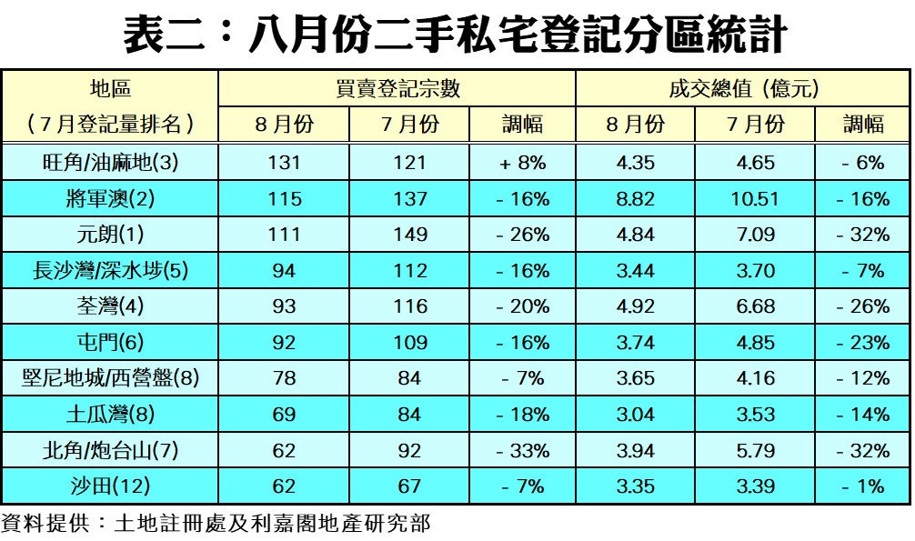 按全港三區作分析,八月份港九新界三區登記量全線回落。當中,港島區登記量按月跌14%,月內錄得491宗登記;九龍區按月也跌8%,共錄757宗登記;至於新界區跌幅最大,挫15%失守千宗水平,僅錄998宗。另外,十大最活躍成交分區的登記量亦跌多升少,當中以北角/炮台山區的跌勢最急,月內只錄得62宗登記,按月大跌33%。至於元朗區及荃灣區亦分別錄得26%及20%的跌幅,前者錄得111宗,後者則有93宗登記;至於唯一錄得升幅的是旺角/油麻地區,共有131宗,按月漲8%,並取代將軍澳區成為登記量最多的分區。
