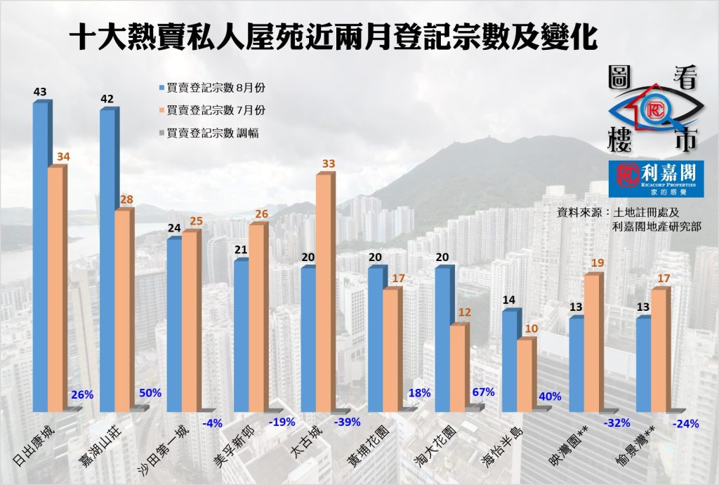 此外,上月十大活躍二手私人屋苑登記量中,錄得升跌各半,其中以太古城的跌幅最大,月內共錄20宗登記,按月大減39%;其次映灣園也跌32%,八月只錄13宗登記。至於,登記量錄得升幅者,以淘大花園表現最凌厲,按月漲67%,共錄20宗,嘉湖山莊也升50%,至42宗登記,排第二位;而日出康城則連月成為登記量最活躍的屋苑,八月錄43宗,按月升26%。此外,八月份十大活躍屋苑總計登記量共有230宗,較七月時的221宗升4%。