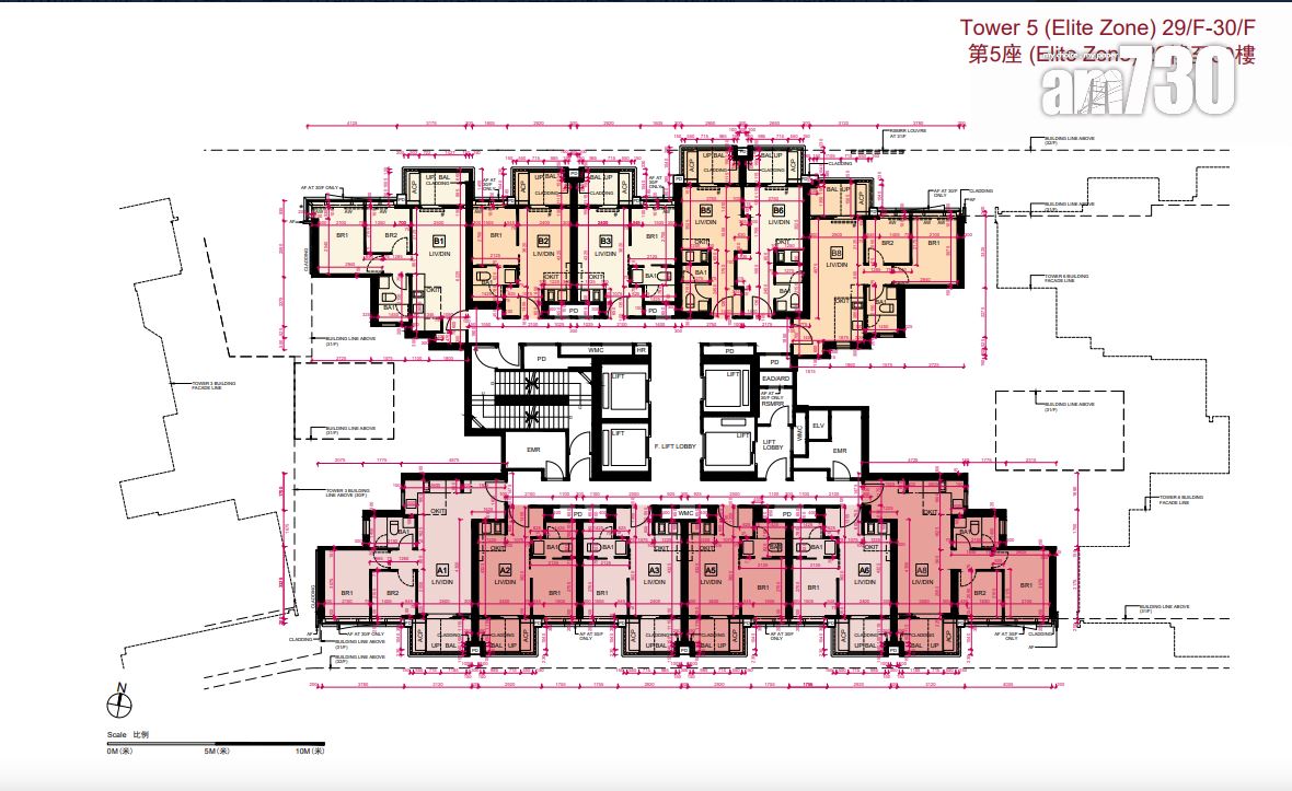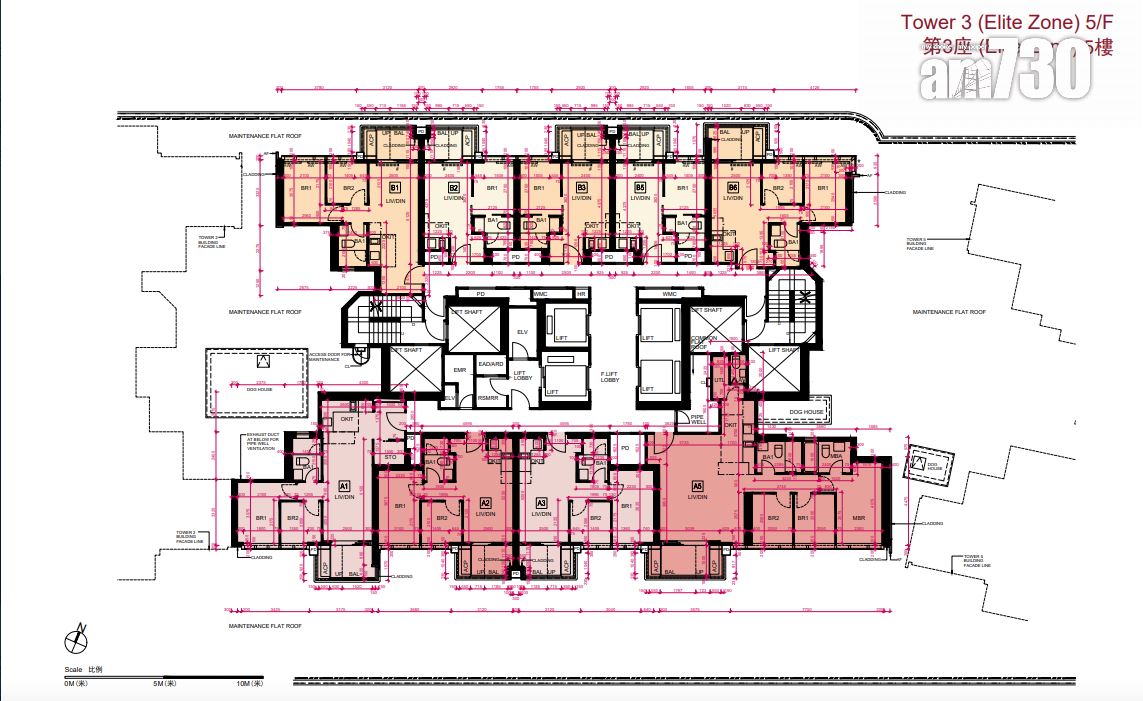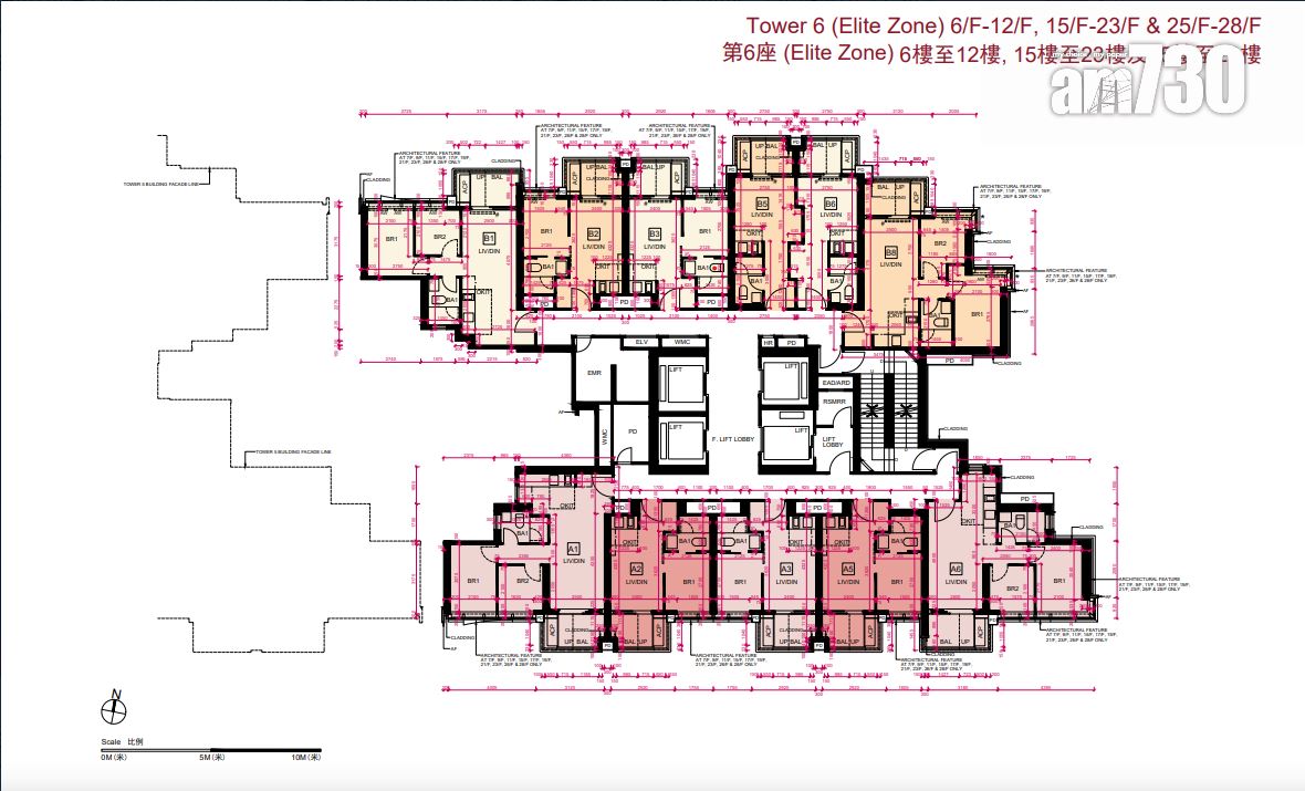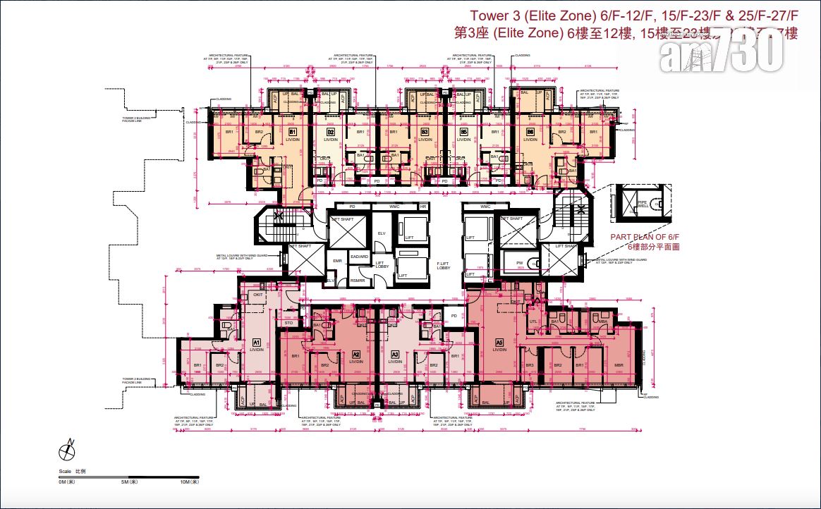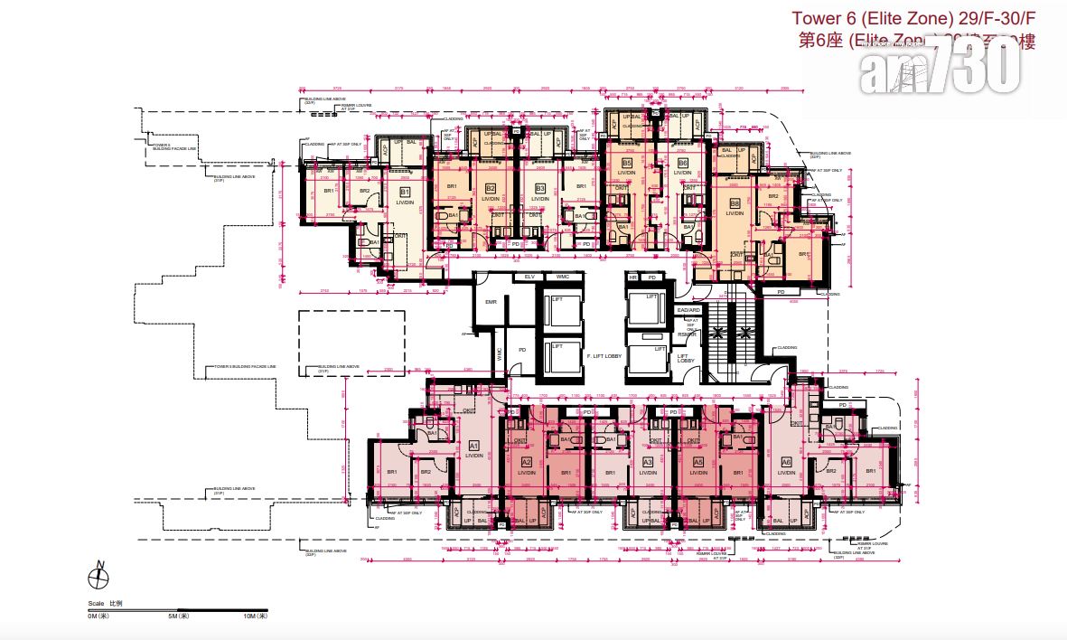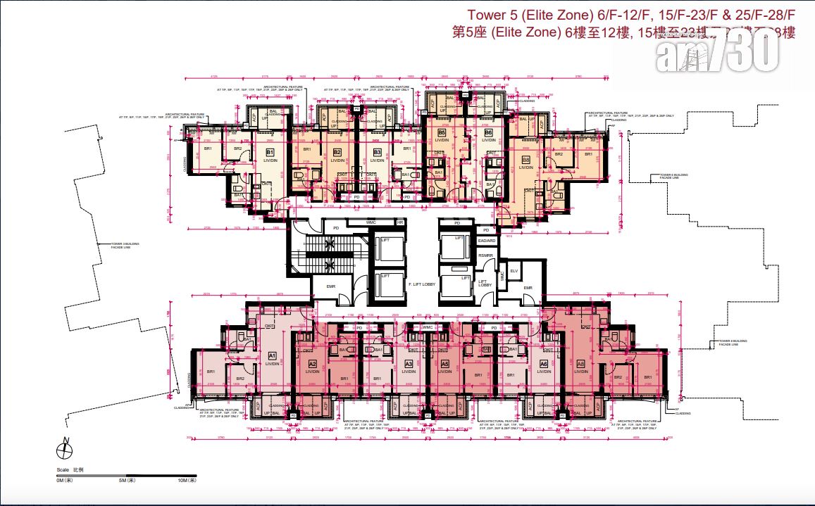 項目第3座5樓至28樓,以及第5座和第6座5樓至30樓空中花園對落的低層區域「Elite Zone」提供718伙,戶型涵蓋開放式至三房,實用面積介乎236至887方呎。另外,空中花園對上三個高層區域提供188伙,入場戶型由兩房起,主打三房及四房,實用面積介乎445至3,936方呎。當中第3座32樓至50樓「Peak Tower」,涉及60伙;第5座及第6座32樓至42樓「Pinnacle Tower」及「Apex Tower」,分別涉及約60伙及約68伙。
