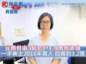 元朗世宙3房套戶1.9萬獲承租 一手業主2016年買入 回報約3.2厘