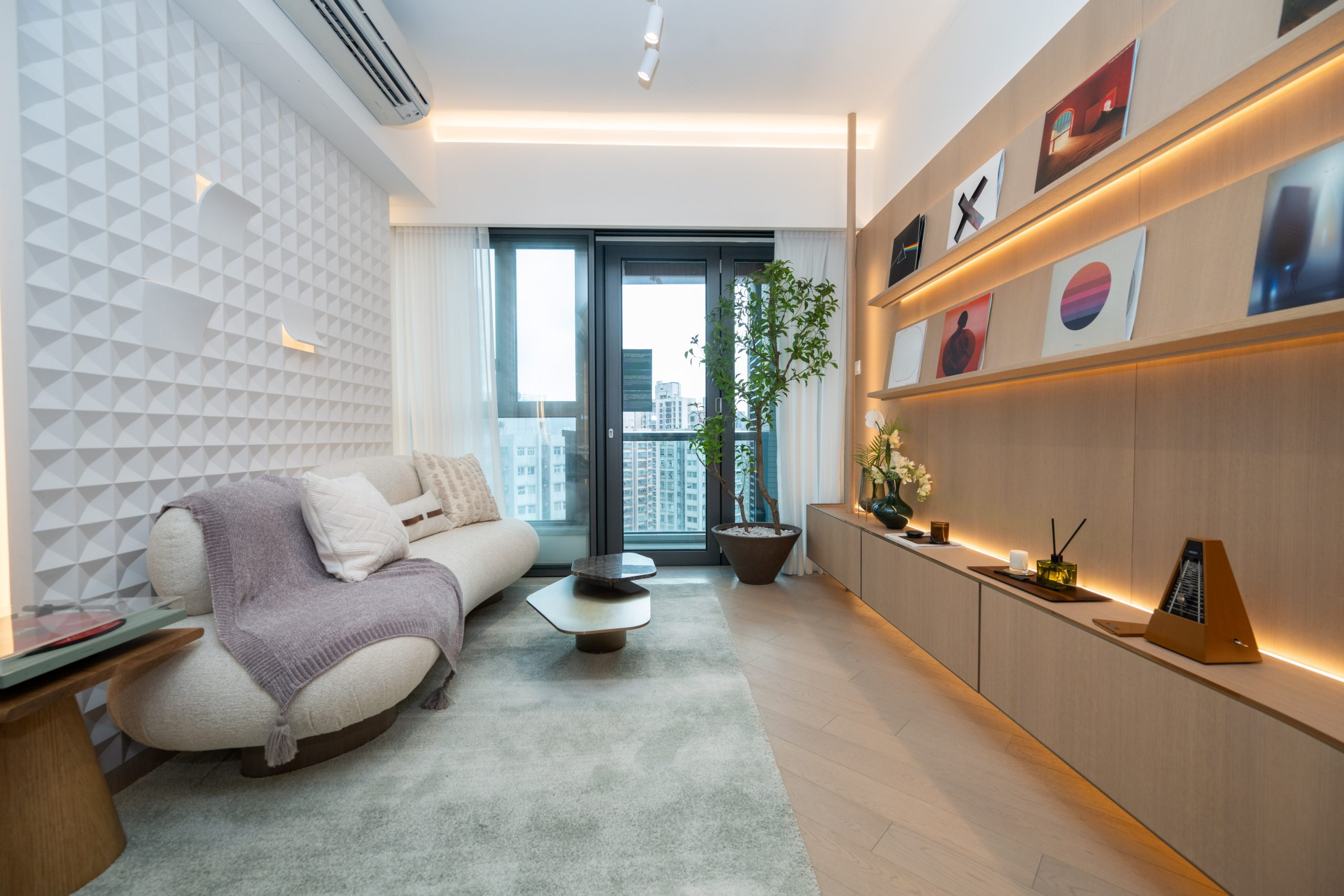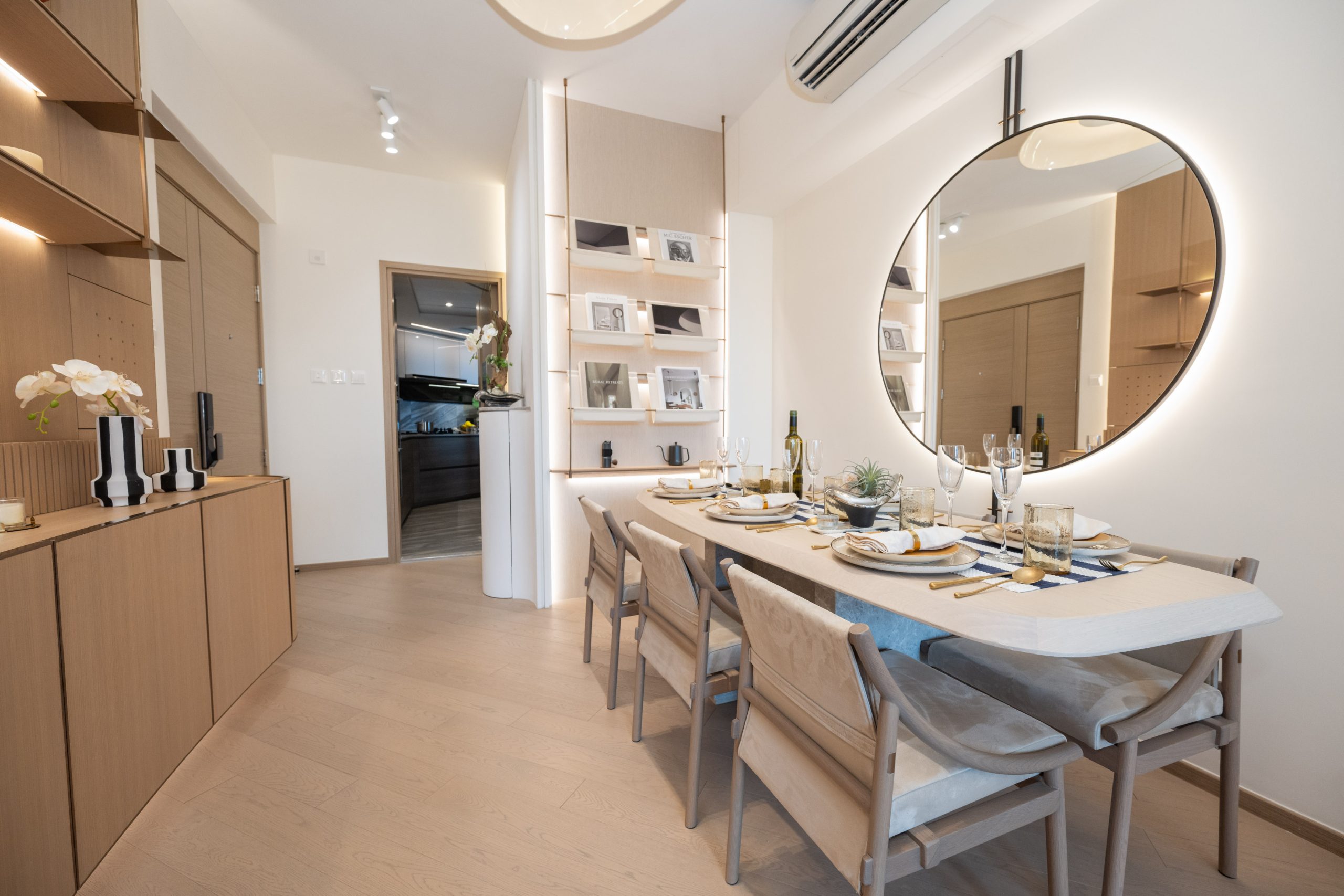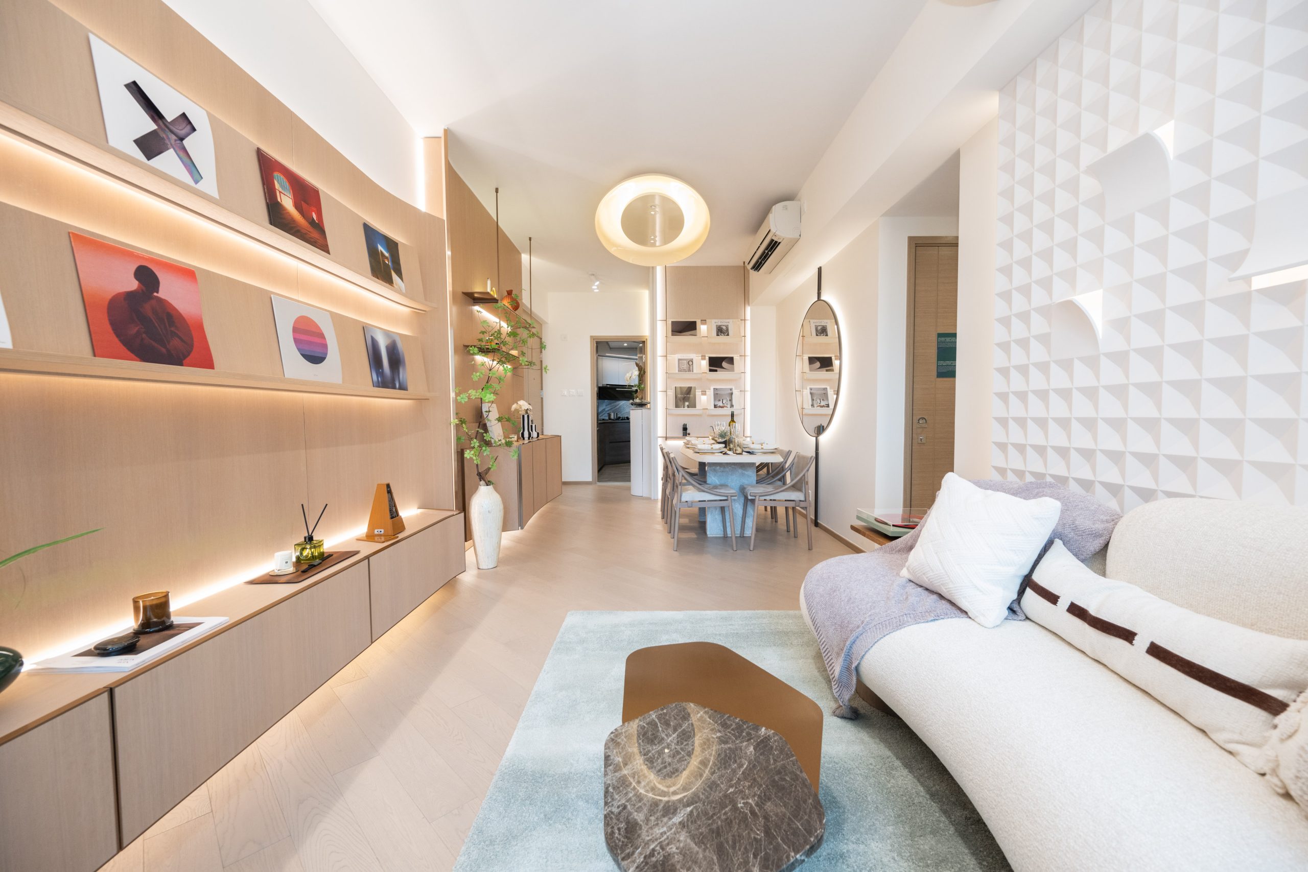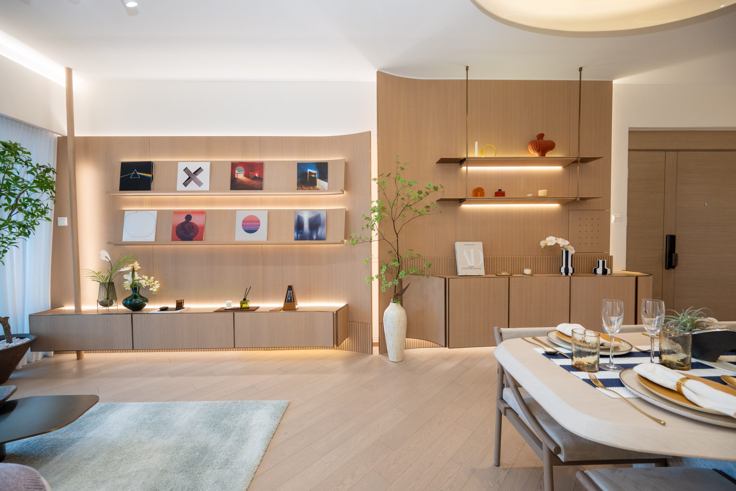 客飯廳整體以色調柔和的大地色系為主題,布局方正實用。地板以淺色複合木地板鋪砌,客飯廳玄關位置特意設計弧形隱藏式置物櫃,讓住戶放置鞋或雨傘,另一側同時放置大型原木置物架,增加收納空間,打造具獨特時尚格調的居住環境。客飯廳左側放置淺色六人長餐桌,桌上放置同色系的餐具以及藍白間條餐桌布,配備灰色絨布的餐桌椅,再以特大圓鏡作配襯,展現自然簡約風格。餐桌左側牆上亦掛上展示架,多座位的設計亦方便住戶日常邀請親朋好友聚餐。客飯廳右側位置放置米色不規則形狀的梳化,配以淺綠色長方形地氈,梳化亦襯上兩個不同花紋的抱枕,前方同樣放置不規則拼色茶几,客飯廳以不規則形狀為整體設計概念,融入多種元素,打造時尚精緻的魅力。牆身亦以立體格紋的設計點綴,增添時髦感。客廳另一端選用特大木展示櫃拼電視櫃,内含壁燈,更顯別緻空間感。客飯廳連接戶外露台,採用落地大玻璃折疊門設計廣納自然光線,大大提高客飯廳採光度之餘,亦延伸室內空間感。