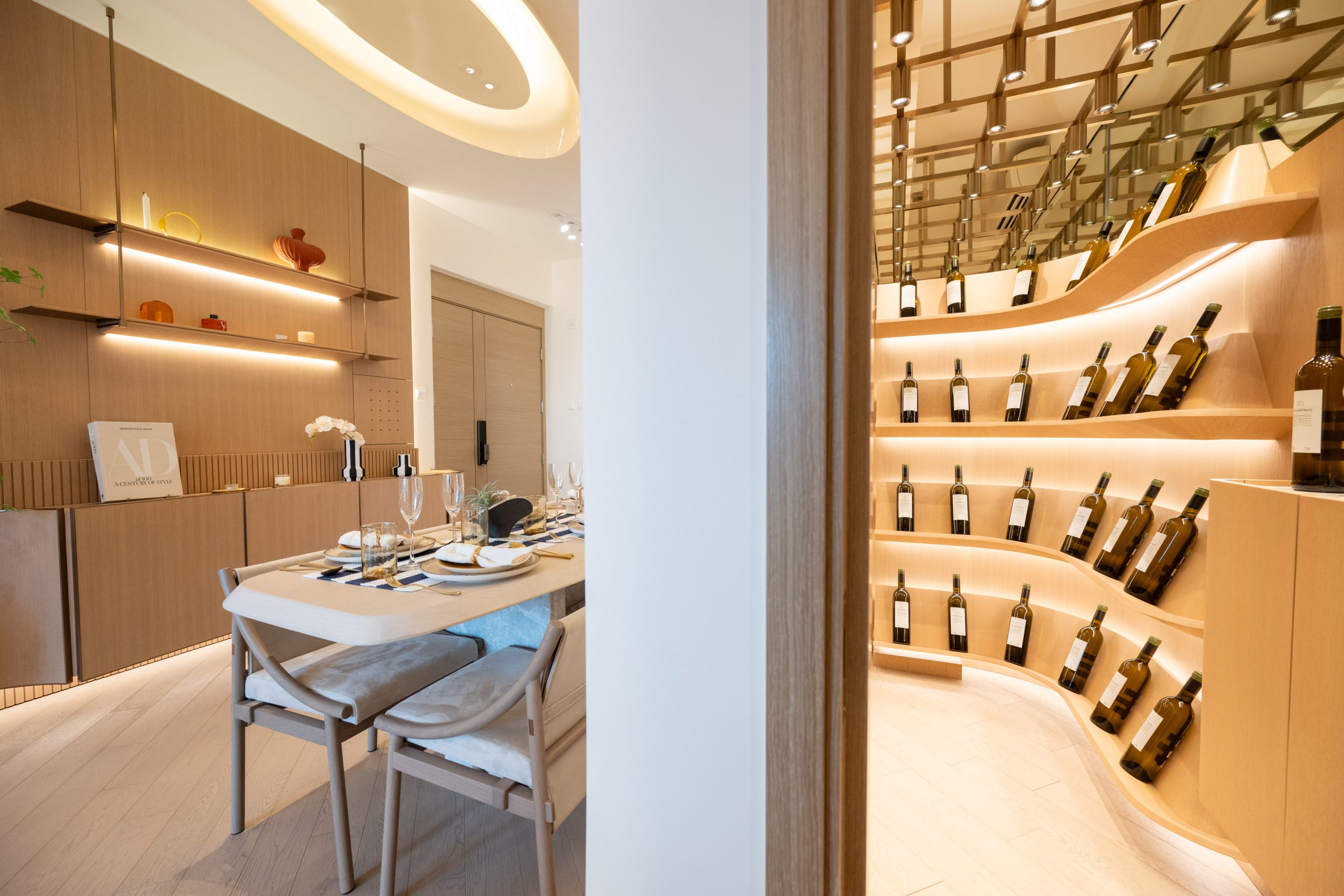 踏入儲物房,時尚典雅的設計空間映入眼簾,天花配備射燈,提供充足的光線。房間採用鏡面牆身,大大擴大室內空間感之餘,打造型格知性格調。同時,儲物房設置數層淺原木色的圓拱形置物架,放置各式紅酒,打造空間實用感。工作間空間方正,内設有洗手間,配備坐廁、洗手台以及花灑,方便住戶彈性運用。