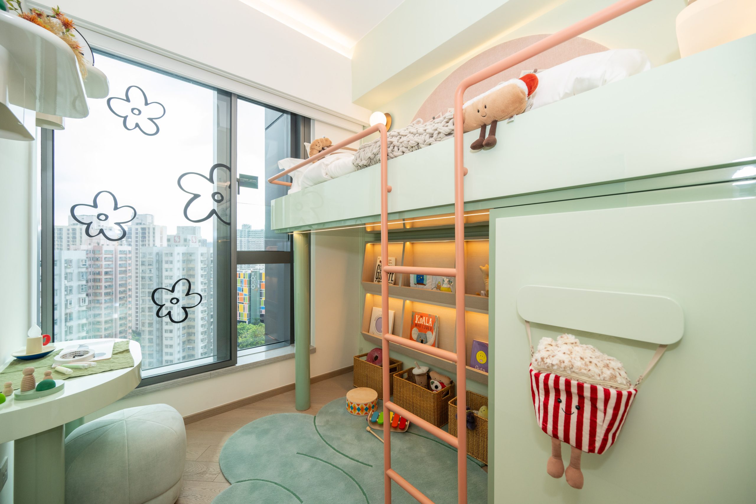 設計師特意將睡房2設計為兒童房及睡房1設計為客房,以切合家庭的需要。兩間睡房設計基調連貫全屋顔色主軸,睡房2以活潑繽紛的綠色為基調,擺放配有衣櫥的單人淺綠色高架床,配以粉嫩的圍欄及長梯,床上擺放多個色彩繽紛的造型抱枕及玩偶,為兒童打造童趣滿分的空間。高架床下方設有兒童專屬的玩具收納空間,收納各種食物造型玩偶、兒童圖書等等,襯以雲朵造型綠色地氈、半圓形淺綠色茶几及矮凳,打造童趣滿分的小天地。