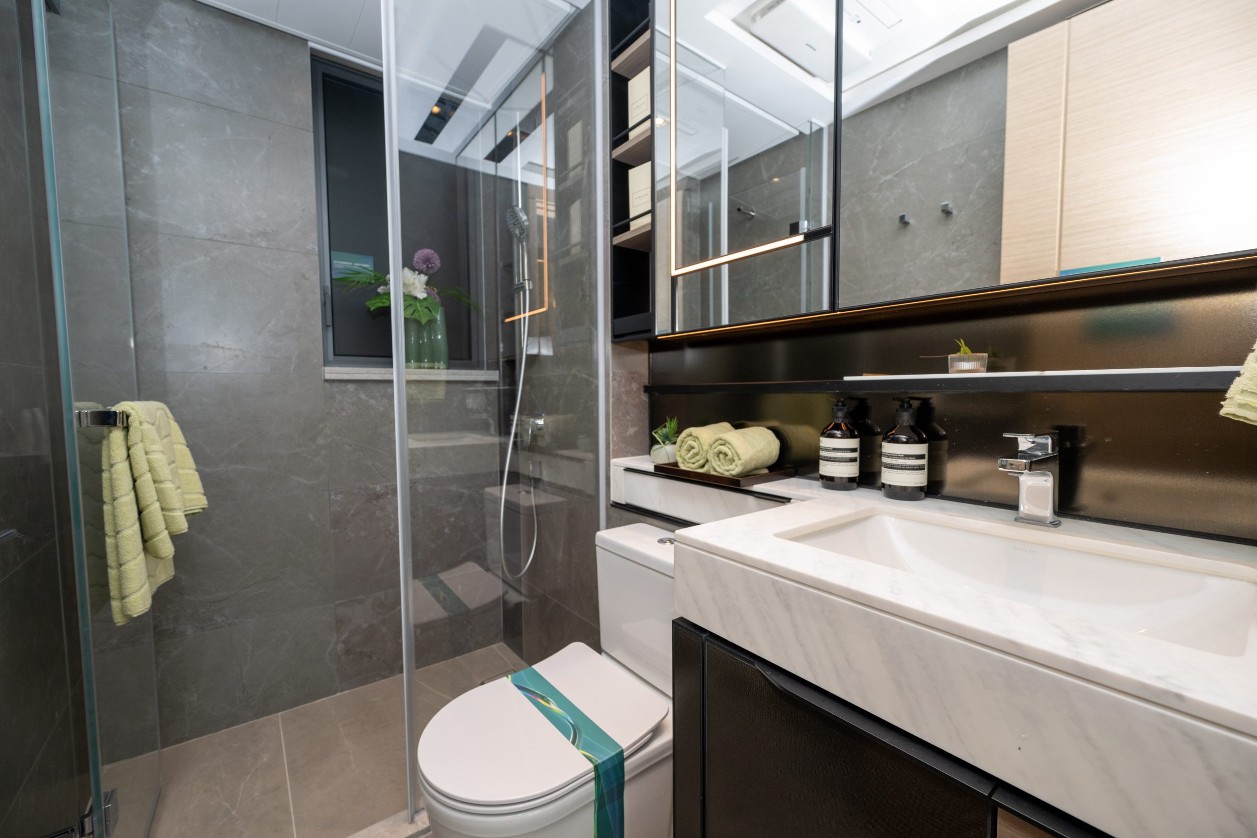 主人房設計簡約亮麗,空間布置簇新,備有偌大玻璃窗吸納自然光線,盡享悠閑生活空間。整體房間運用大地色系為主調,地板同時連貫客廳設計,鋪砌複合木地板。雙人大床放在靠窗位置,床頭配備米色床頭軟墊靠枕,配上純白色床單以及深啡色格紋床尾布,床尾的牆身一端以灰粉色畫作點綴,凸顯潮流雅緻的氣氛。同時雙人床頭位置及底下選用鏤空設計並配備隱藏式暗燈,更顯空間感。大床的旁邊放置高貴的雲石梳妝臺,牆身設有原木色展示架,陳列各式小型擺設,及優雅花卉作襯托,強調現代簡約輕奢感。旁邊亦設有落地式衣櫃,提供足夠的儲物空間,配以玻璃拼金屬邊的櫃門,注入通透優雅的感覺。主人房浴室方正實用,運用灰色的基調,並鋪砌淺色雲石紋瓷磚地板及洗手盆臺面,備有浴缸、洗手盆、鏡櫃及坐廁,同時配備Panasonic浴室寶。