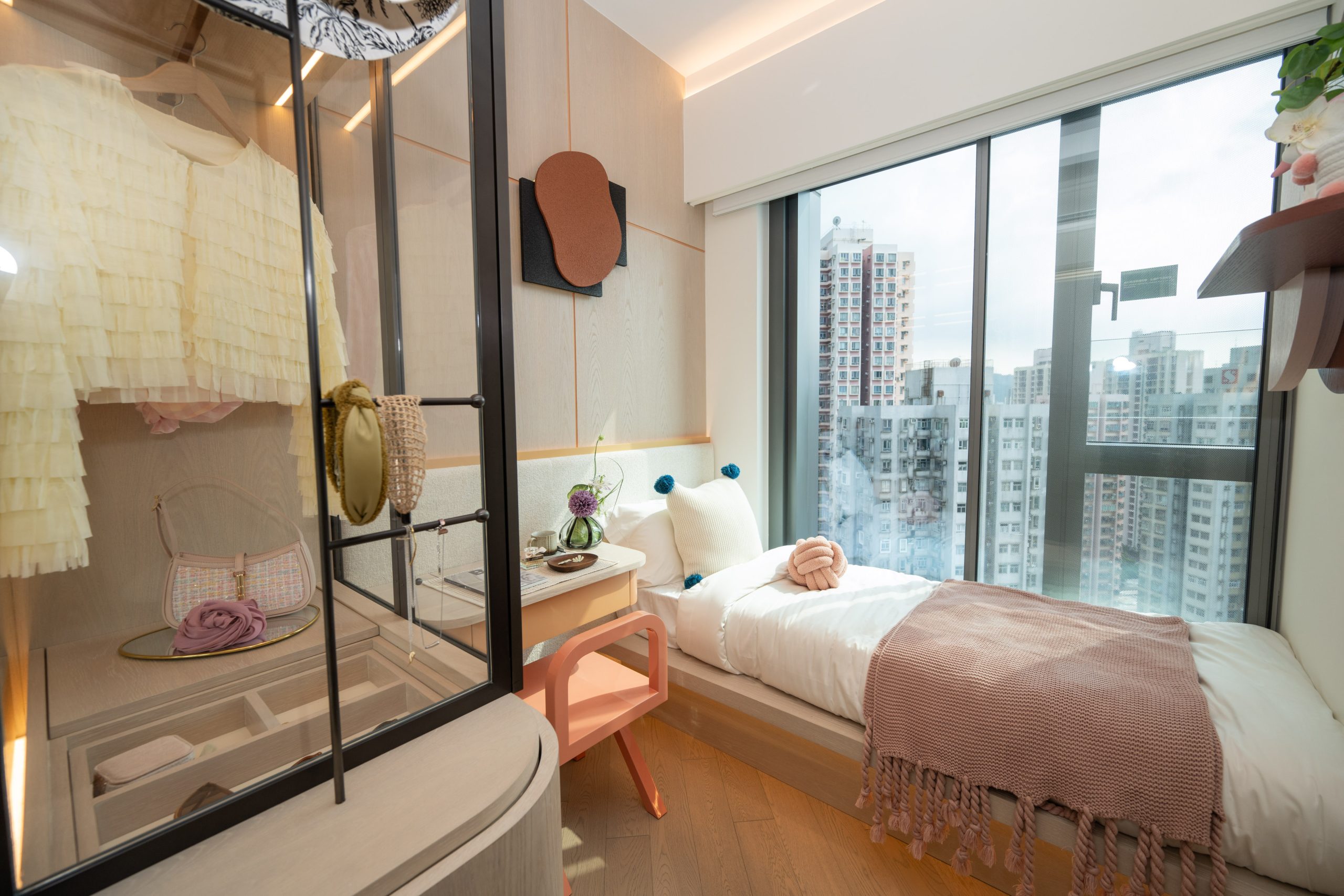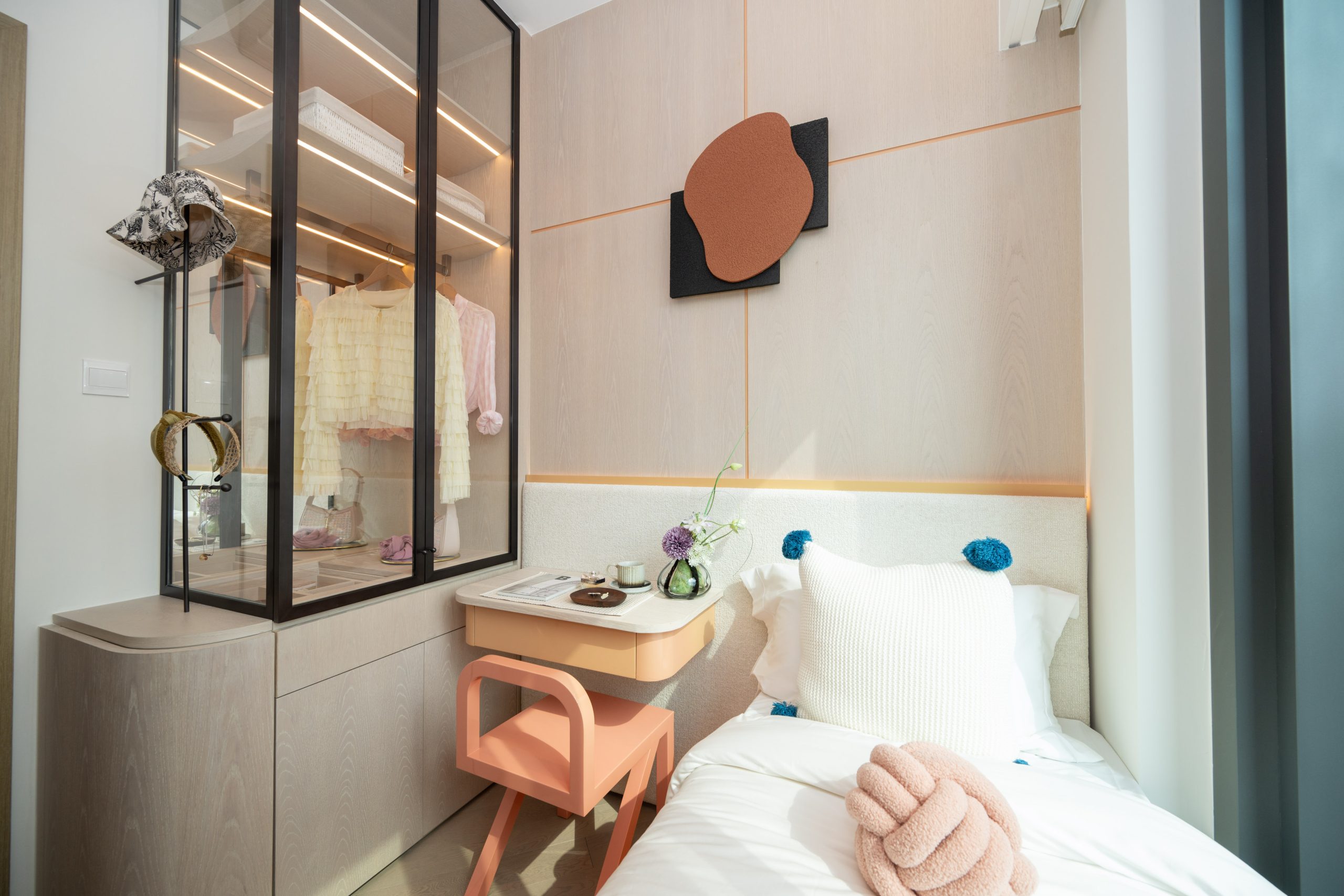 睡房1方正簡潔,間隔靈巧實用,創意自由度高。單人床同樣擺放靠窗位置,採光度十足,床上鋪上純白色床單配上粉色扭結抱枕及米色抱枕,以及乾燥玫瑰紅的扭結床尾布;床尾的牆上掛上兩種圓形創意配搭的掛牆式置物架。床邊擺放多用途書桌連鮮粉色桌椅,以及通透的玻璃吊櫃和層架,增加收納空間。另外,浴室1同樣備有淋浴間、洗手盆、鏡櫃及坐廁,滿足住戶日常所需。