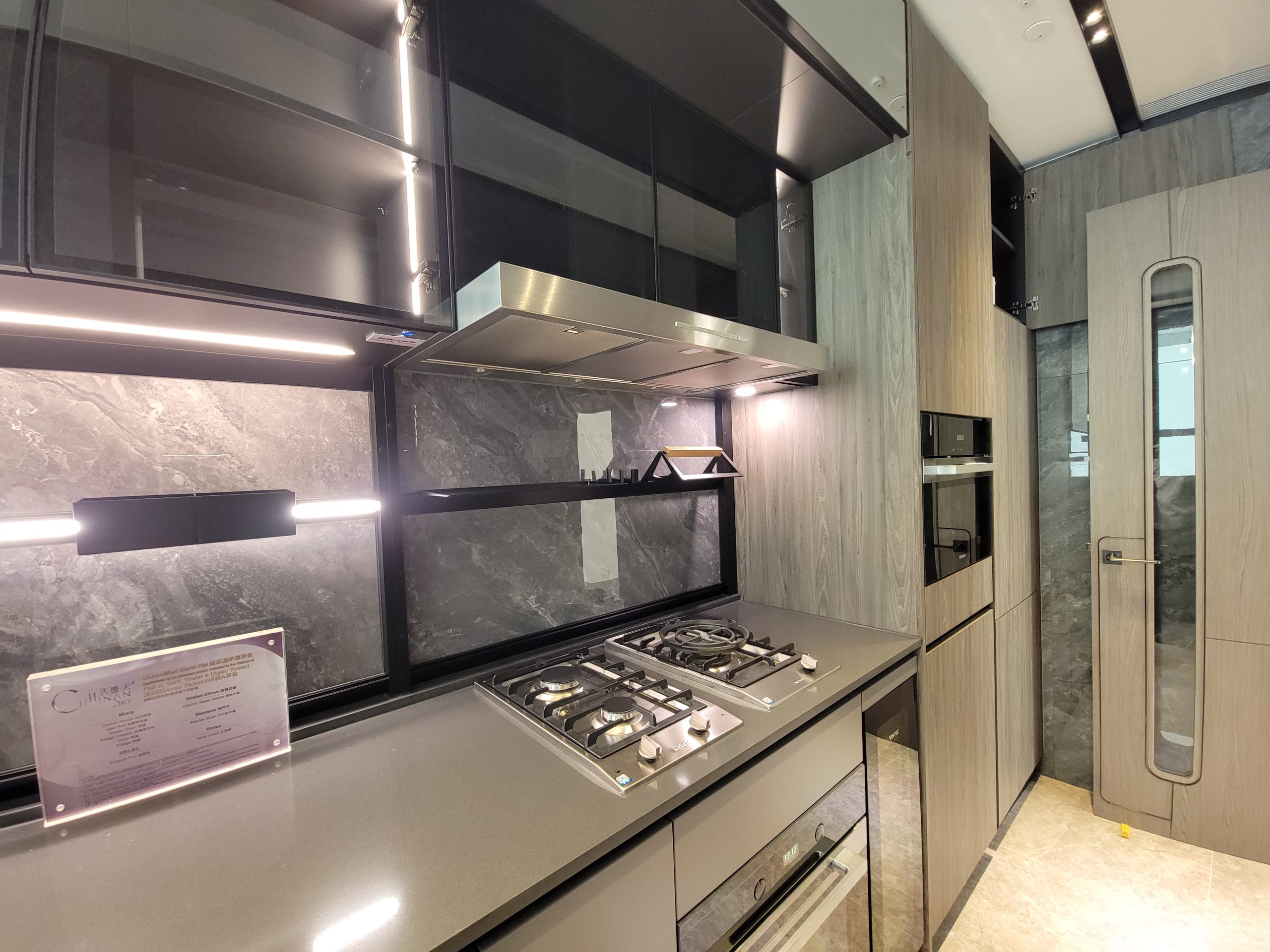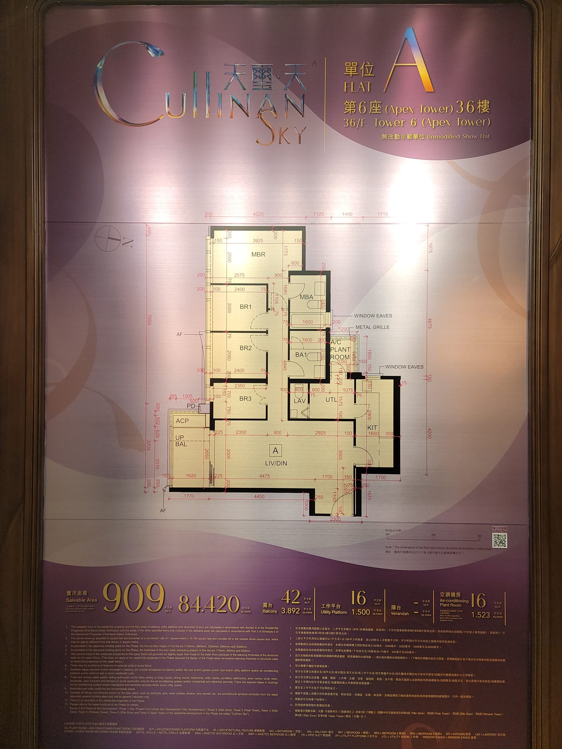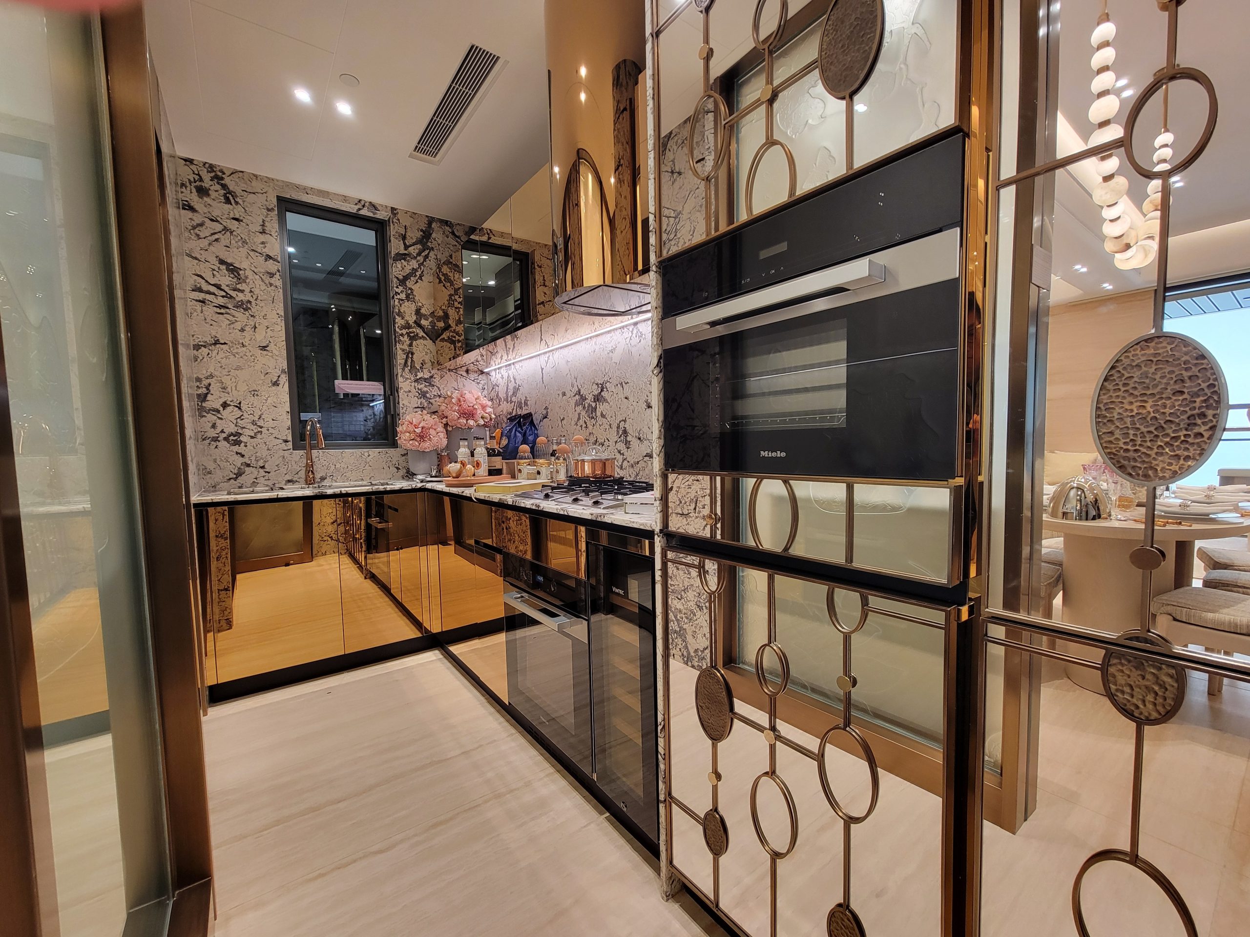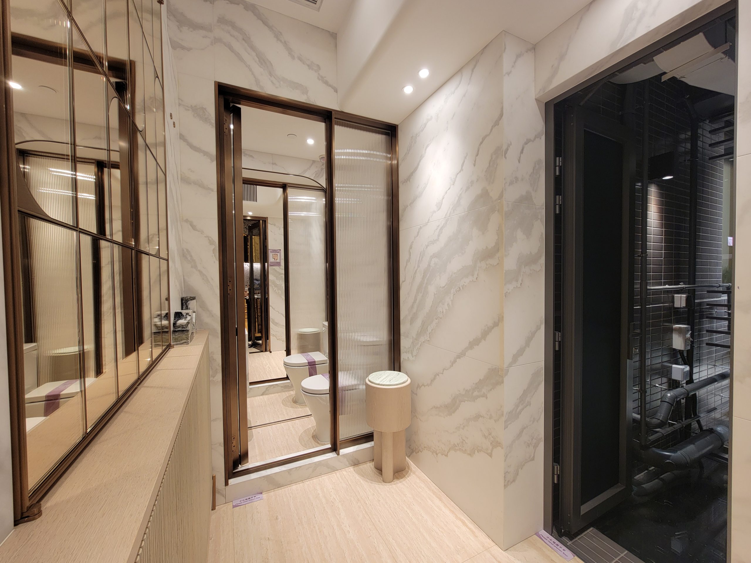 另提供1個以第6座36樓A室為藍本改造的交樓標準四房,實用面積909呎,客飯廳呈長方形,以玻璃趟門連接42方呎露台。單位採梗廚設計,墻面使用深灰色大理石,操作空間寬敞,配備嵌入式雪櫃和烤箱。全部睡房均與客飯廳同座向,其中一間睡房面積偏細,可改造為書房使用,主人房套廁設有浴缸,客廁採幹濕分離設計。
