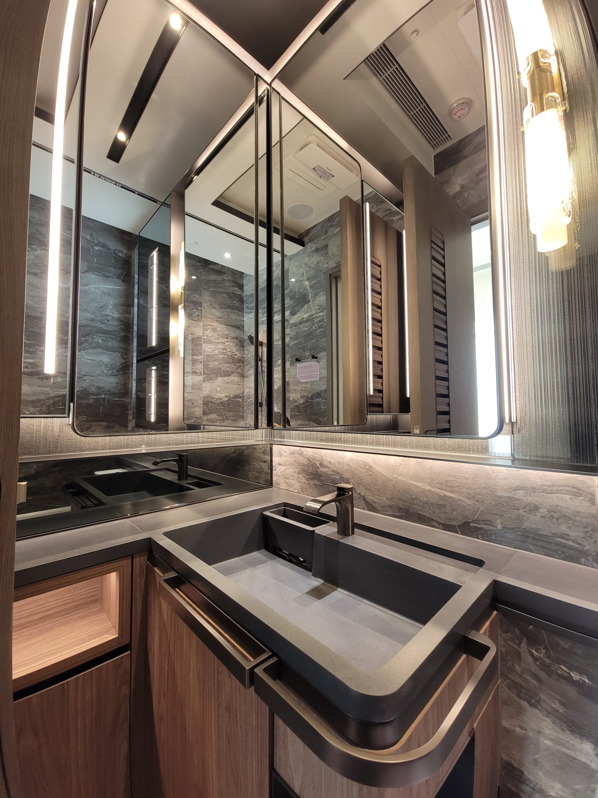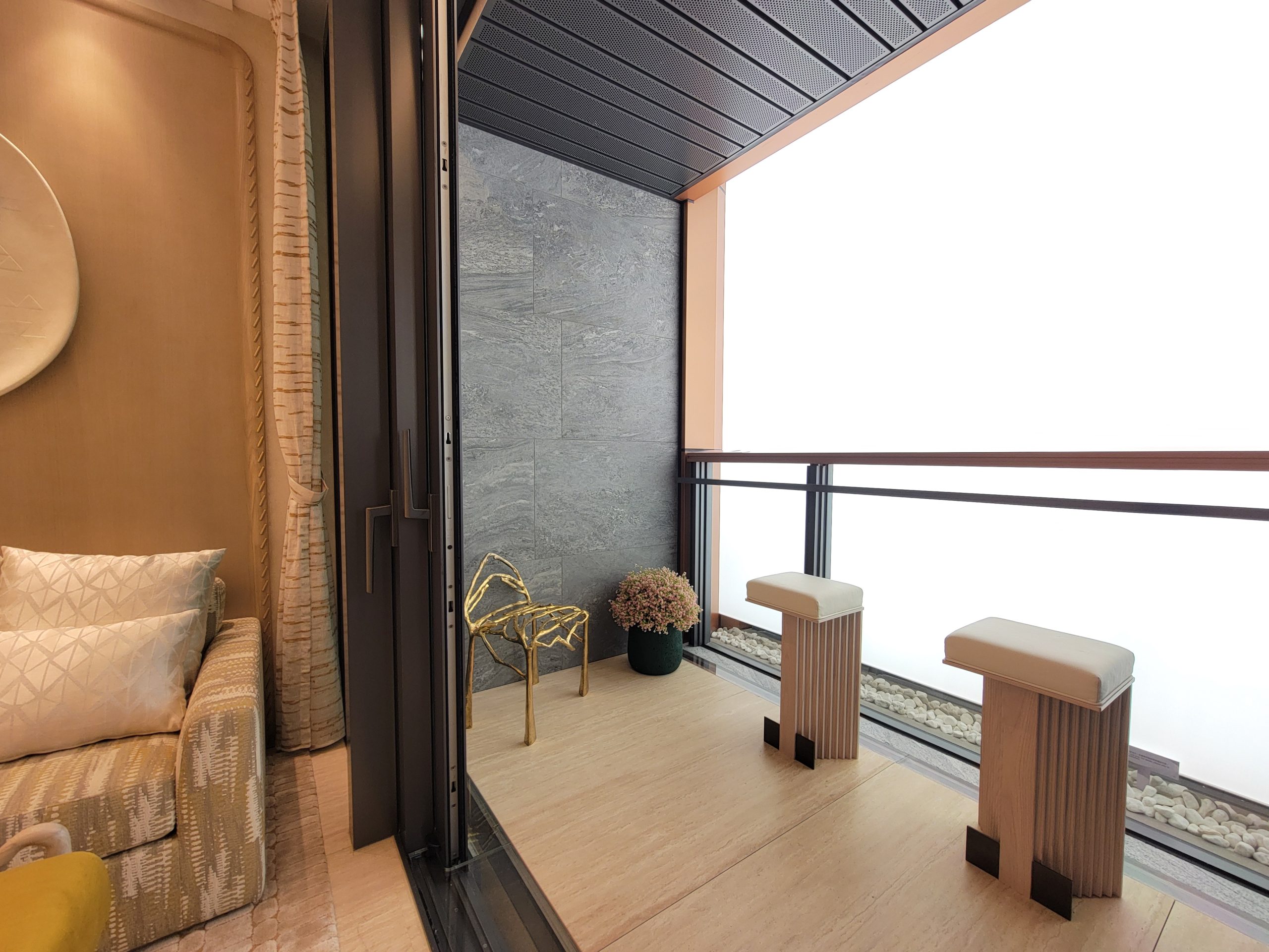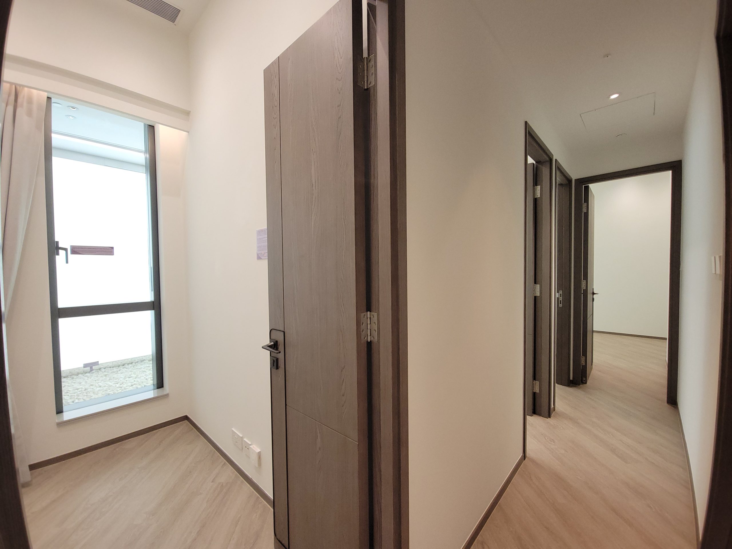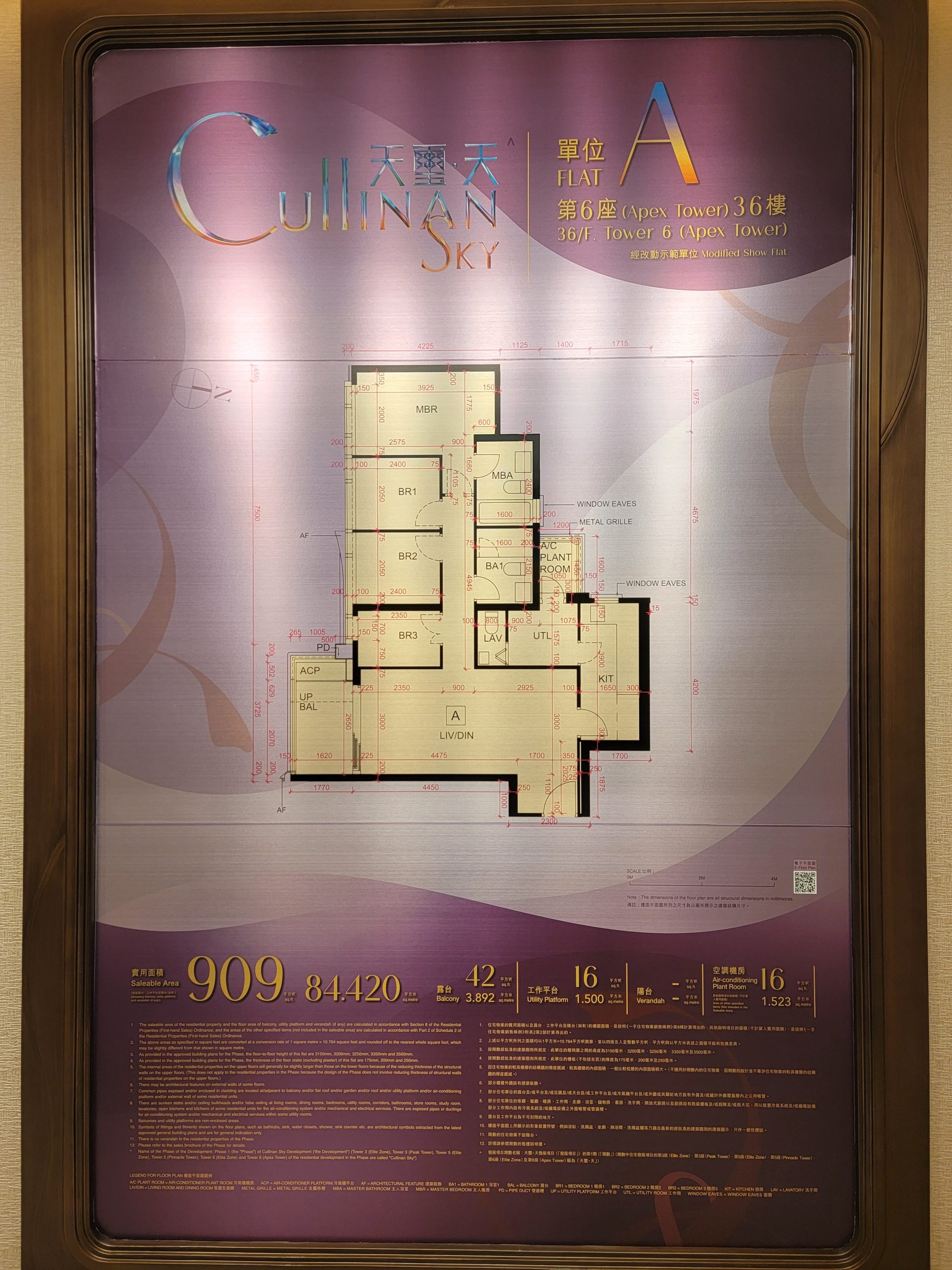 另提供1個以第6座36樓A室為藍本改造的交樓標準四房,實用面積909呎,客飯廳呈長方形,以玻璃趟門連接42方呎露台。單位採梗廚設計,墻面使用深灰色大理石,操作空間寬敞,配備嵌入式雪櫃和烤箱。全部睡房均與客飯廳同座向,其中一間睡房面積偏細,可改造為書房使用,主人房套廁設有浴缸,客廁採幹濕分離設計。