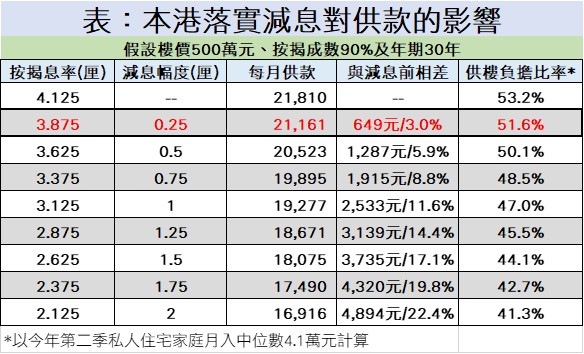 展望後市,隨著息口下調,實際供樓負擔得以減輕,加上特首下月中旬發表的《施政報告》料續有刺激本港經濟的方案出台,可望進一步鞏固市民入市置業的信心。預期在減息效應下,十月份二手私宅交投可望在之前的低基數下大幅反彈三成或以上,而一手私宅按月買賣料重越千宗水平。至於樓價走勢方面,因應新盤仍有一定存量,發展商料持續貼市價開盤,樓價短期變化料不大,維持全年樓價看跌8%左右。