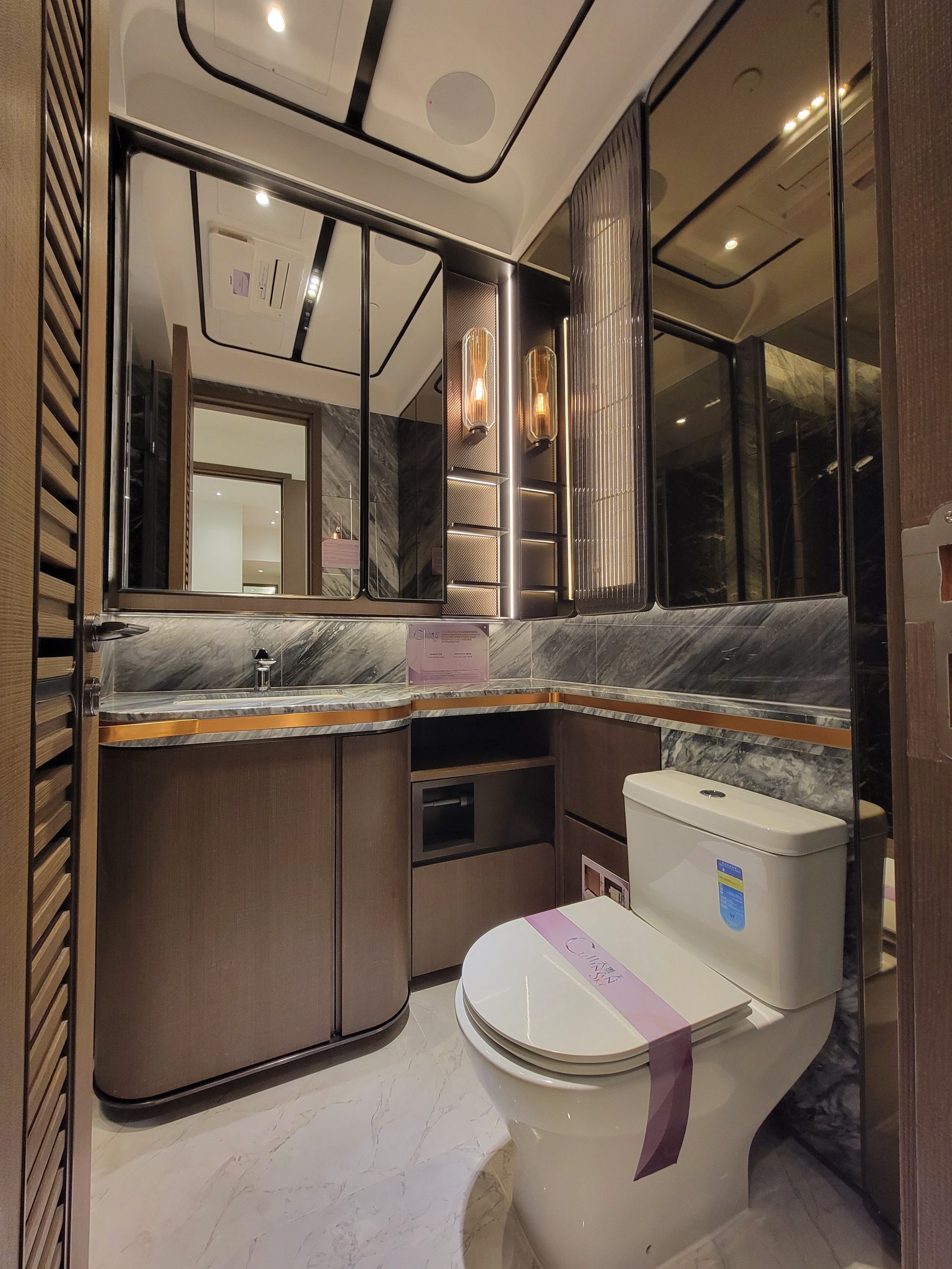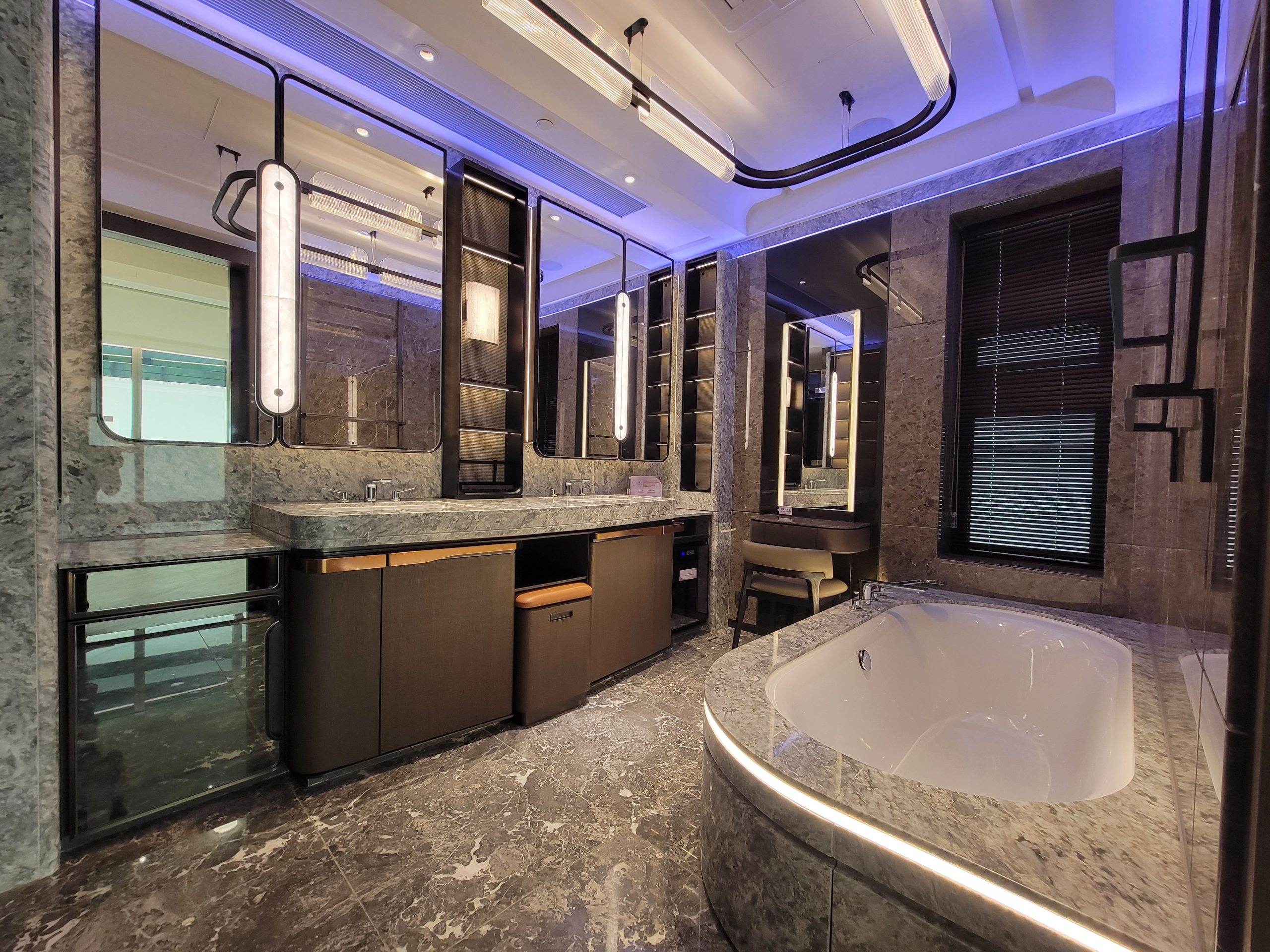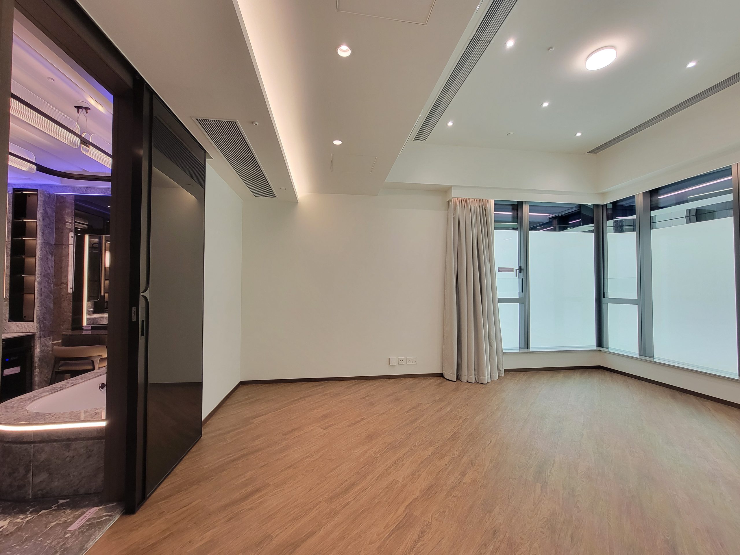 單位設有私人升降機大堂,等候區擺放有梳化;入室可見巨大客飯廳,以玻璃趟門連接118方呎露台,配置可變色燈帶,營造氛圍感。單位採梗廚設計,黑色經典組合櫥櫃,儲物空間充足,放置有雙人大理石吧檯桌椅,烹飪區及洗滌區分隔兩邊,操作空間寬闊,採光明亮。工作間擺放組合式收納櫃,靈活運用。睡房方正實用,均與客飯廳同坐向,主人房擁角窗設計,光線充足,以黑色趟門連接套廁,套廁內設有梳妝檯,附有窗戶方便通風透氣,客廁則為暗廁設計。