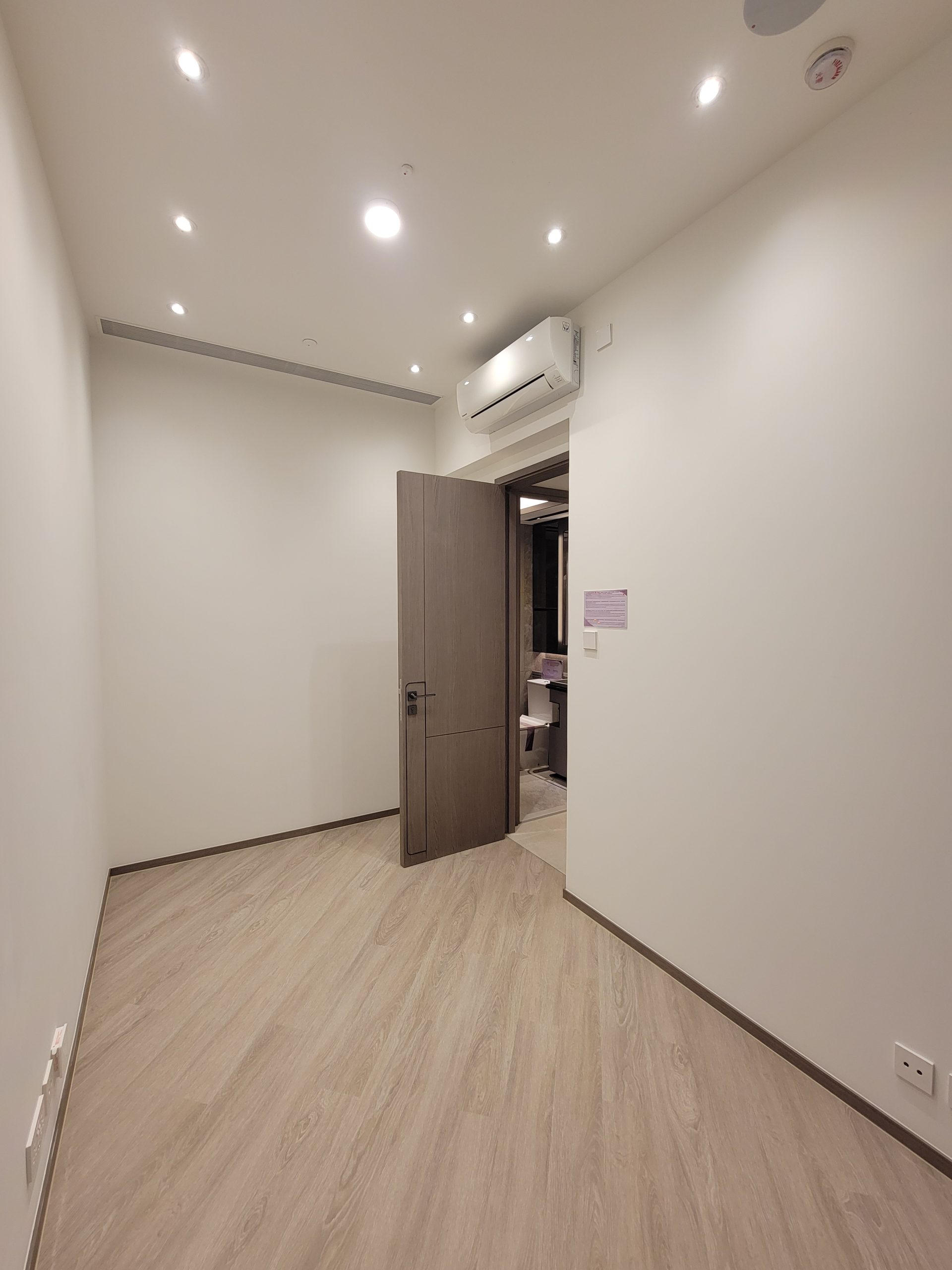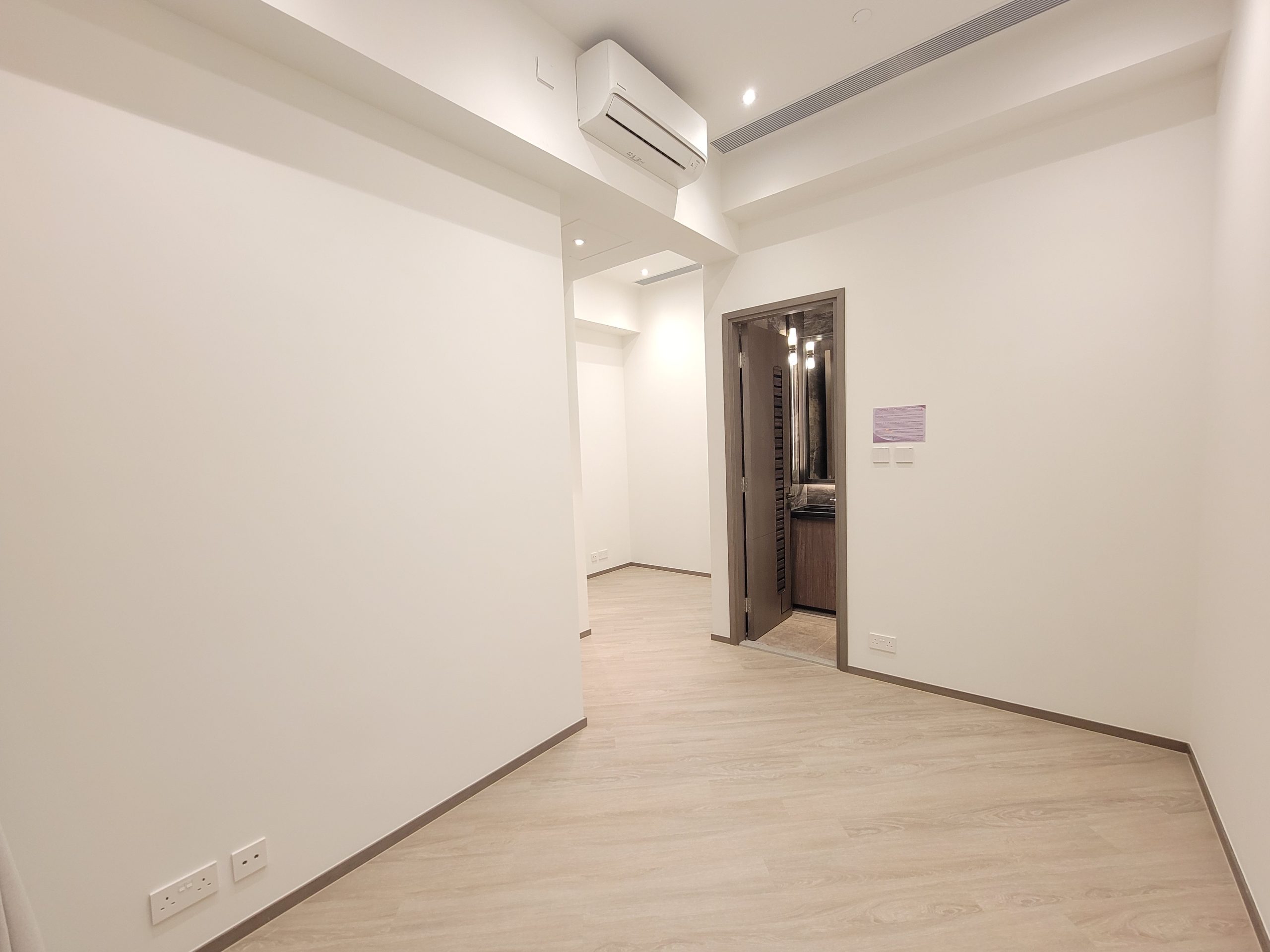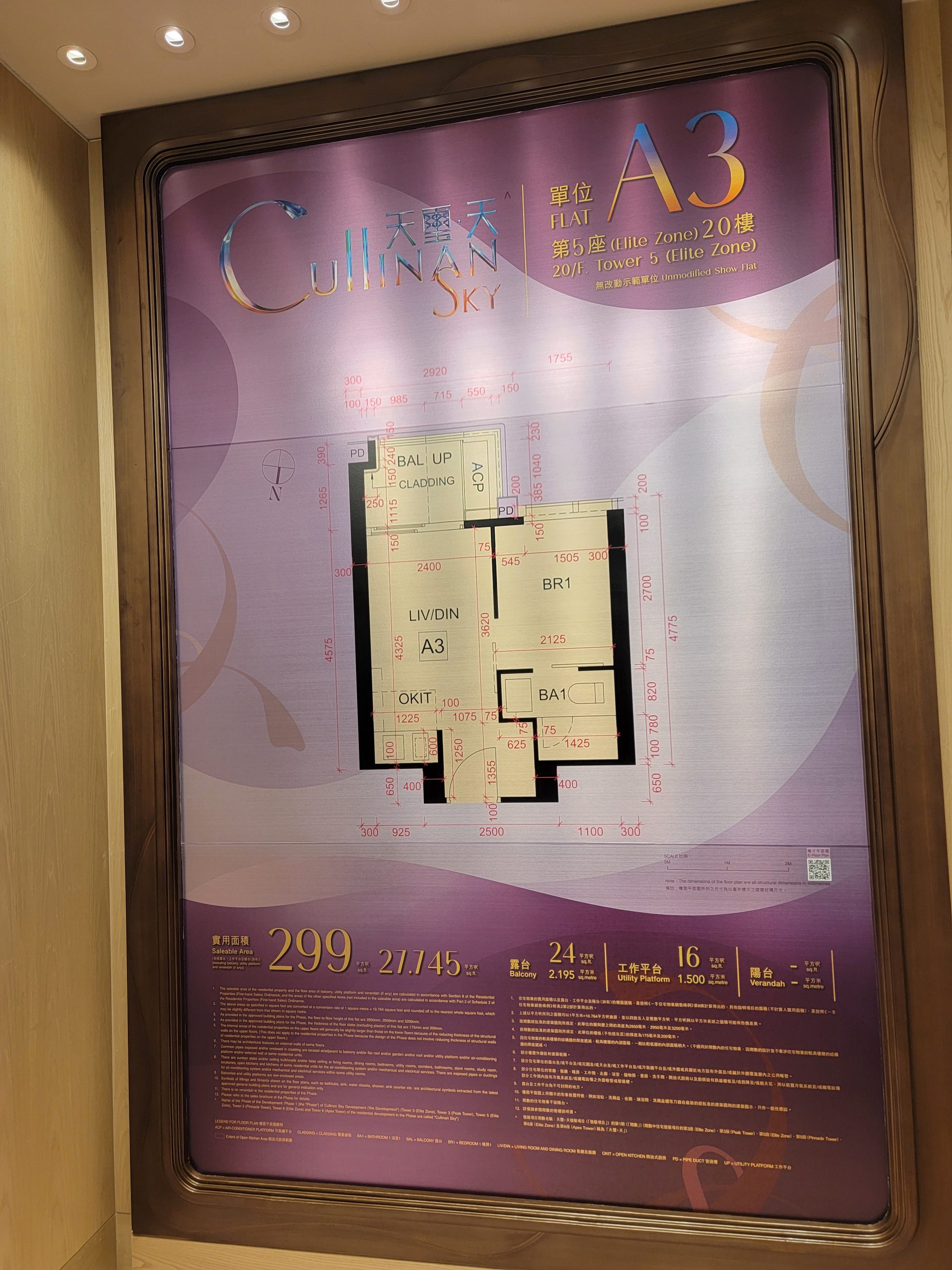 「天璽.天」還提供一個以第5座20樓A3室為藍本改造的交樓標準示範單位,實用面積299方呎,一房間隔。客飯廳長形開則,開放式廚房配備可伸縮式操作檯,以及多個木色系儲物櫃。睡房布局方正,需經由睡房進入浴室,以木門分隔。