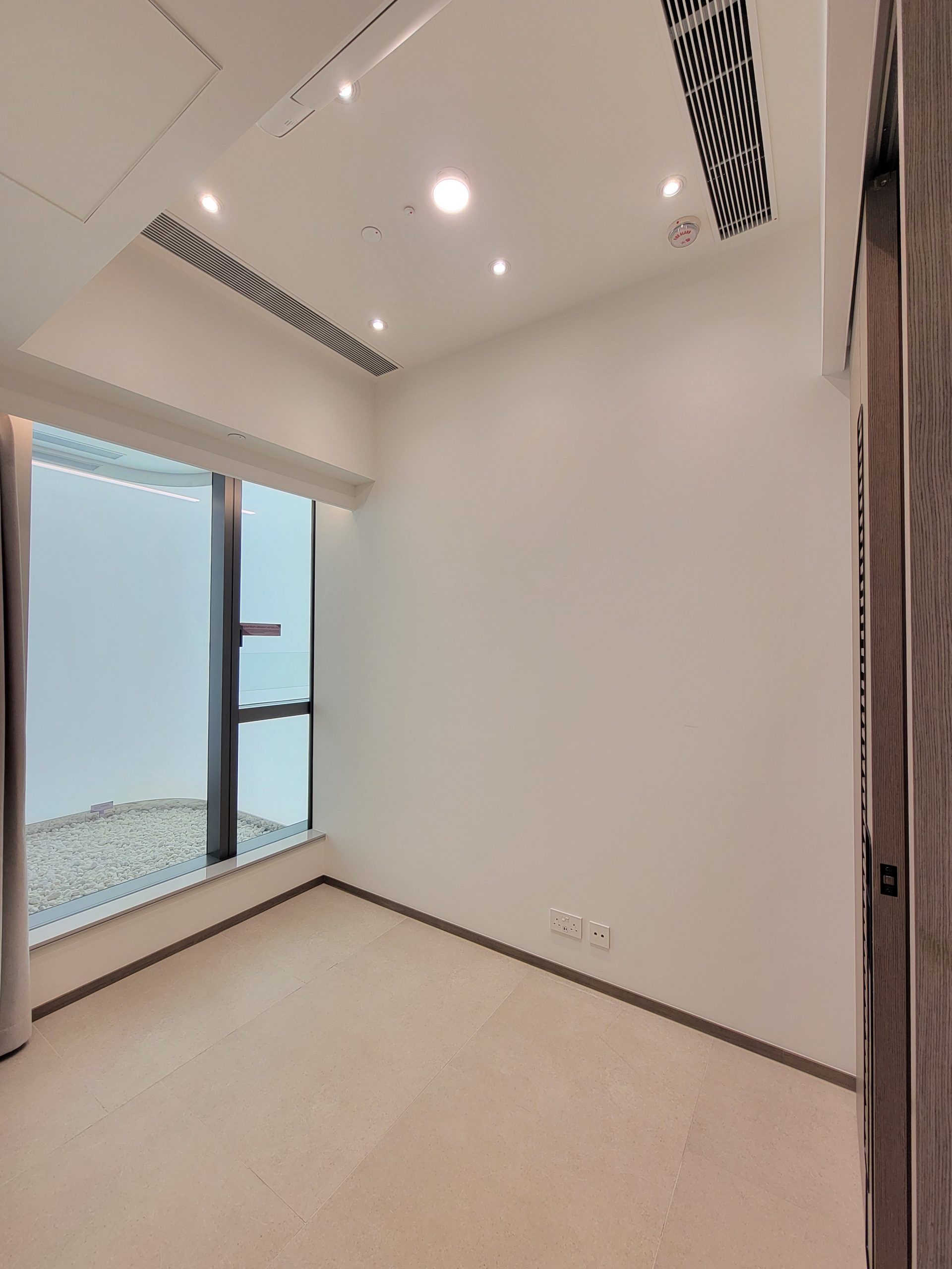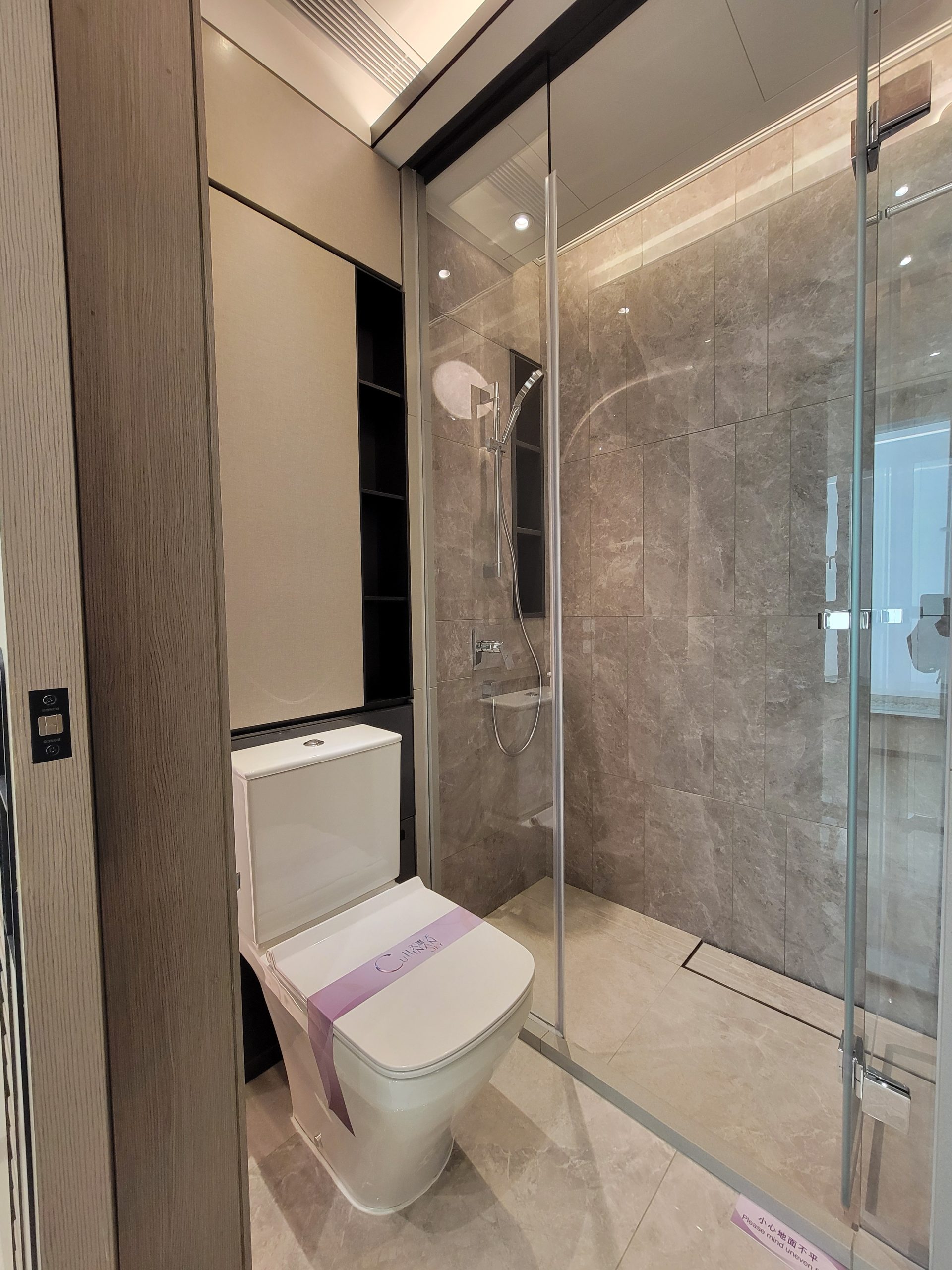 另外,以第5座36樓G室為藍本改造的交樓標準示範單位,實用面積614方呎,兩房間隔。入室左側為開放式廚房,不設有玄關,採深木色儲物櫃,以操作櫃檯隔開客飯廳,側邊設有調料置物架。客飯廳空間諾大,玻璃趟門連接31方呎露台。睡房位於同側,主人房與書房相連,主人房浴室及客廁均為暗廁。