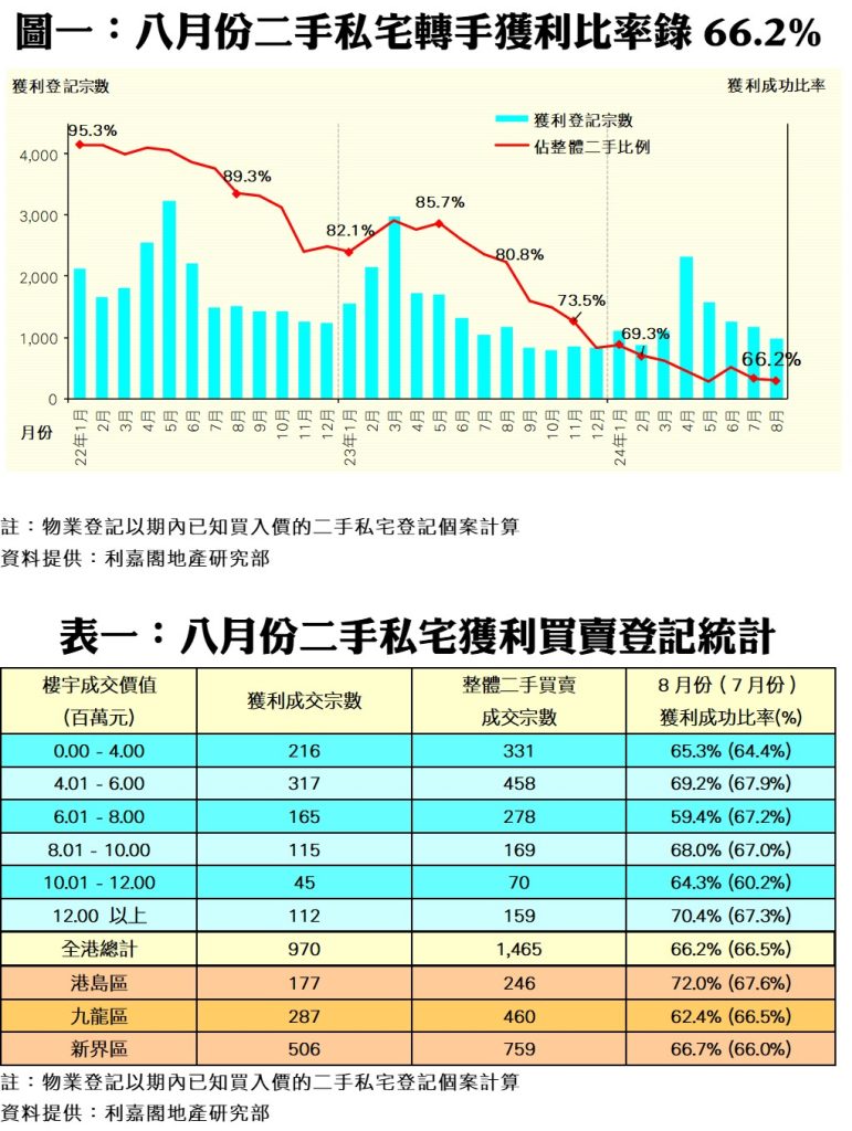 利嘉閣地產研究部主管陳海潮表示,第三季以來樓市仍然受壓,二手私宅轉手獲利比率未改輾轉下跌之勢,不過在減息周期初現下,料劣勢最快於十月開始扭轉。綜合土地註冊處資料所得,2024年八月份全港1,465宗已知上手購入價的二手私宅買賣登記中,帳面獲利個案共970宗,佔比66.2%,連跌兩個月,按月再跌0.3個百分點,創近3個月低位。