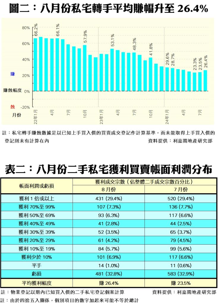 八月私宅轉手平均賺幅連升兩月見26.4% 減息效應冀帶動獲利比率觸底回升