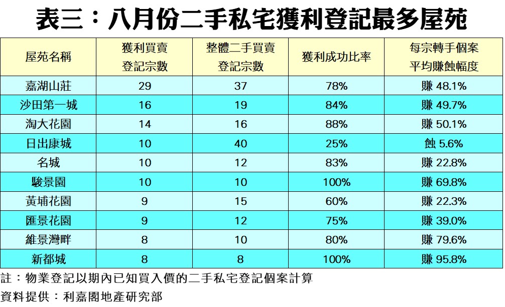 此外,檢視上月10個獲利登記最多的屋苑,當中有2個屋苑,包括駿景園及新都城錄得百分百獲利,而其他獲利成功比率較高者還包括淘大花園(88%)及沙田第一城(84%)。此10個屋苑當中,每宗平均賺/蝕幅介乎最差的蝕5.6%至最佳的賺95.8%不等。其中,值得留意的是,日出康城錄得每宗轉手平均蝕5.6%,為表現較弱的屋苑。另外,新都城晉身成為錄得每宗轉手平均賺幅最高的屋苑,達95.8%。至於撇除日出康城,上月榜內賺幅最低者為黃埔花園,平均每宗只賺22.3%,繼而是名城的22.8%(見表三)。