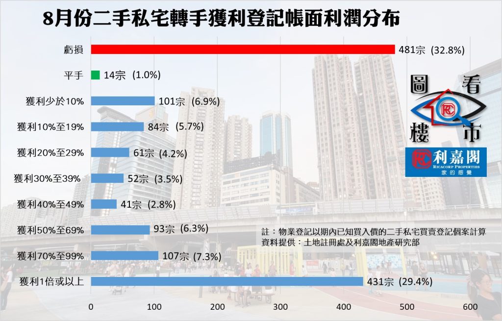 另外,數據顯示今年八月份每宗私宅轉手個案平均賺幅為26.4%(見圖二),連升2個月,單月再升2.9個百分點,創下近4個月新高。帳面獲利1倍或以上的轉手個案佔整體二手私宅買賣比例維持在29.4%,按月無升跌,錄431宗;至於帳面錄得虧損者達481宗,佔比按月微減0.1個百分點,至32.8%,處於年內的高位反覆浮沉;而以宗數計,則按月少102宗,為近6個月以來最少;至於上月平手的個案錄得14宗,佔比微升0.4百分點至1.0%。