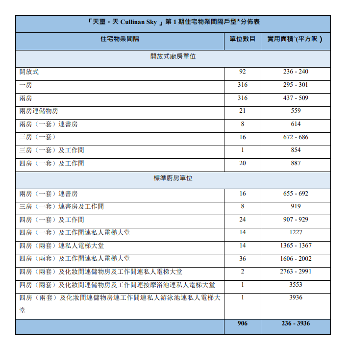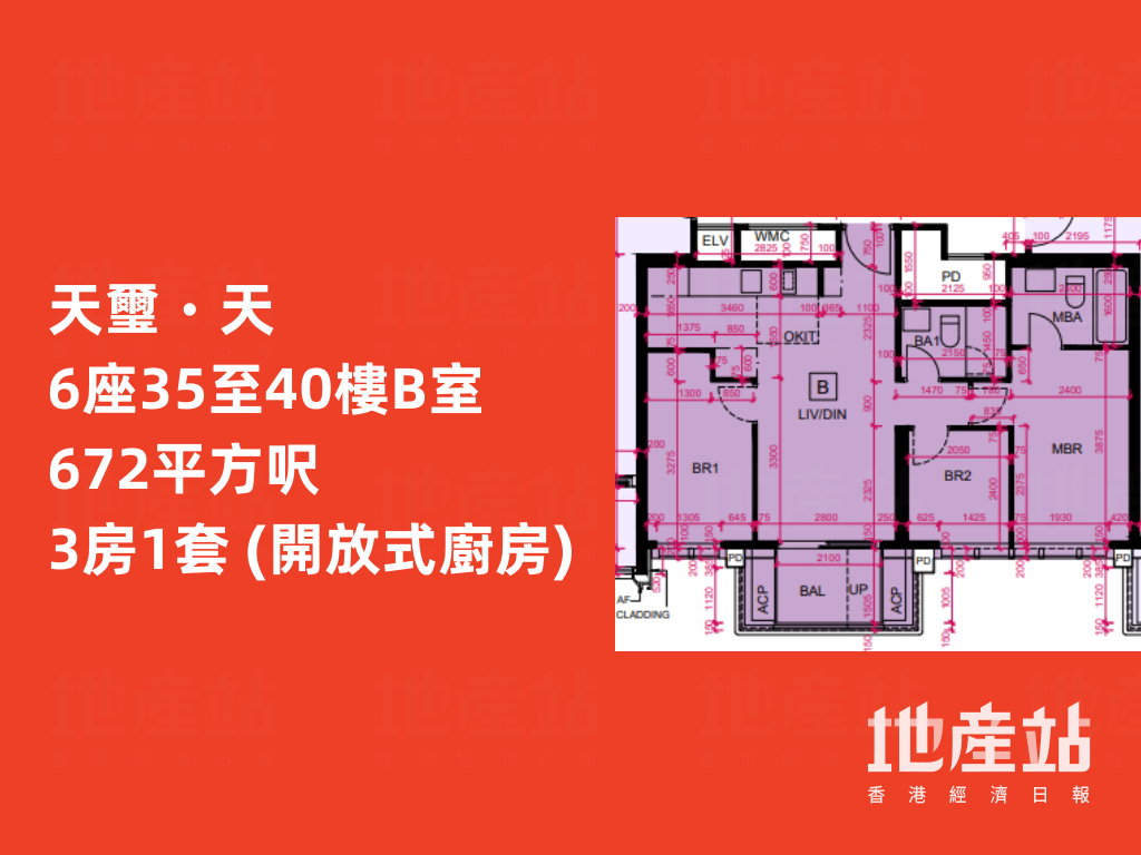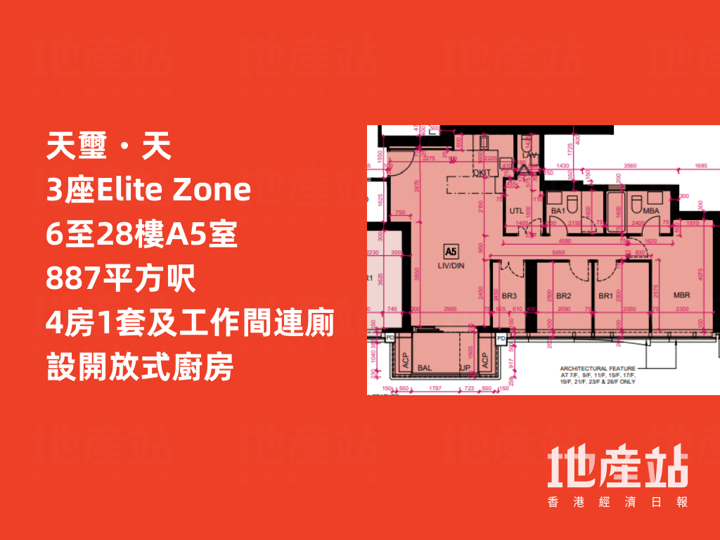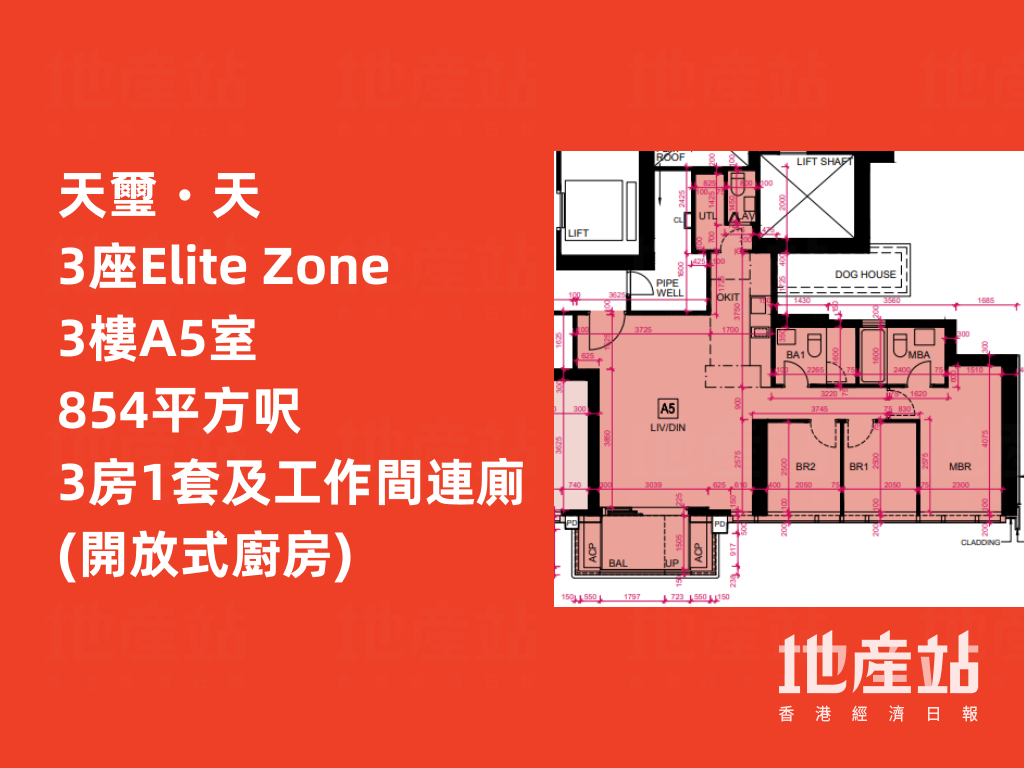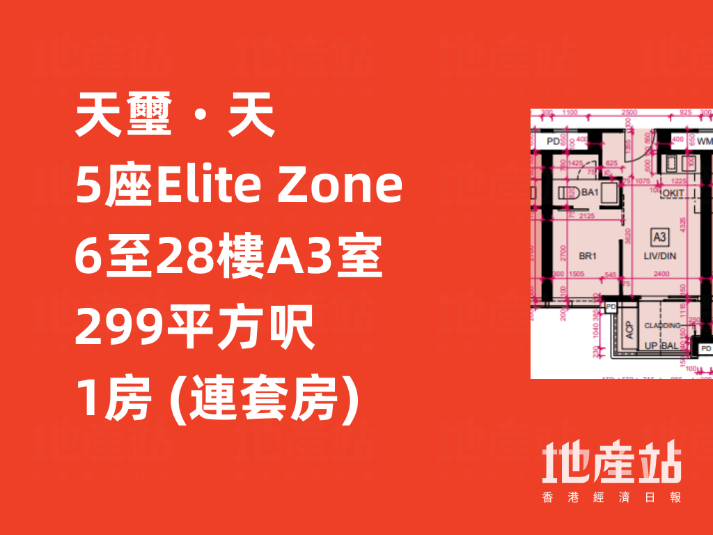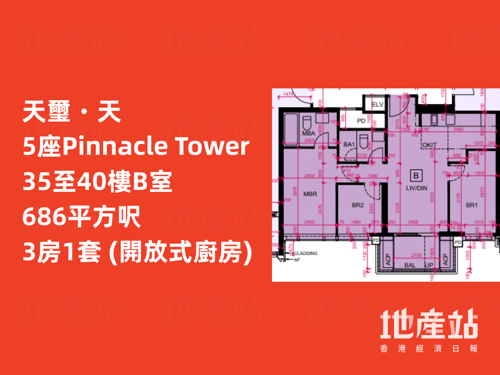 天璽‧天第1期的3房戶共有25伙,當中3座Elite Zone 3樓A5室,實用面積854平方呎,設3房1套及工作間連廁,長形開放式廚房位於飯廳一隅,盡頭為工作間連廁。至於5座Pinnacle Tower 32至40樓B室,以及6座Apex Tower 32至40樓B室,實用面積分別為686及672平方呎,均為3房1套 (開放式廚房) 間隔;兩者的睡房1均設有預留衣櫃位。
