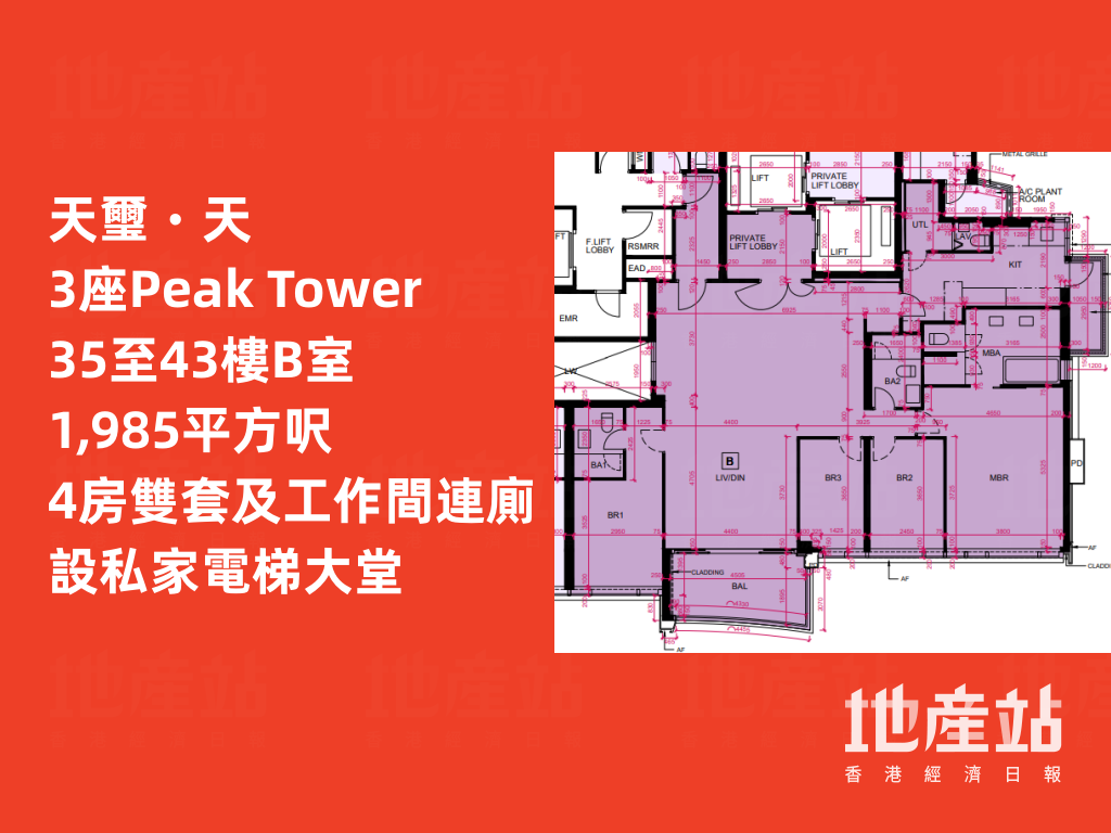 至於4房雙套單位,全數均設有私家電梯大堂,分布於3座Peak Tower 33至47樓A至D室,當中A、B、D室均設工作間連廁,由梗廚內接;C室則不設工作間,但其通往走火通道的走廊內,設有額外廁所。另外,A及B室的主人房套廁均設有雙洗手盆。