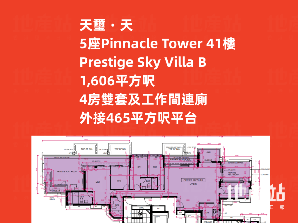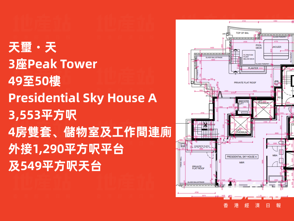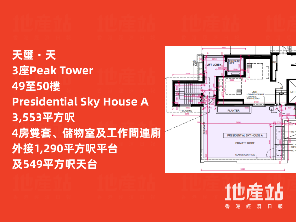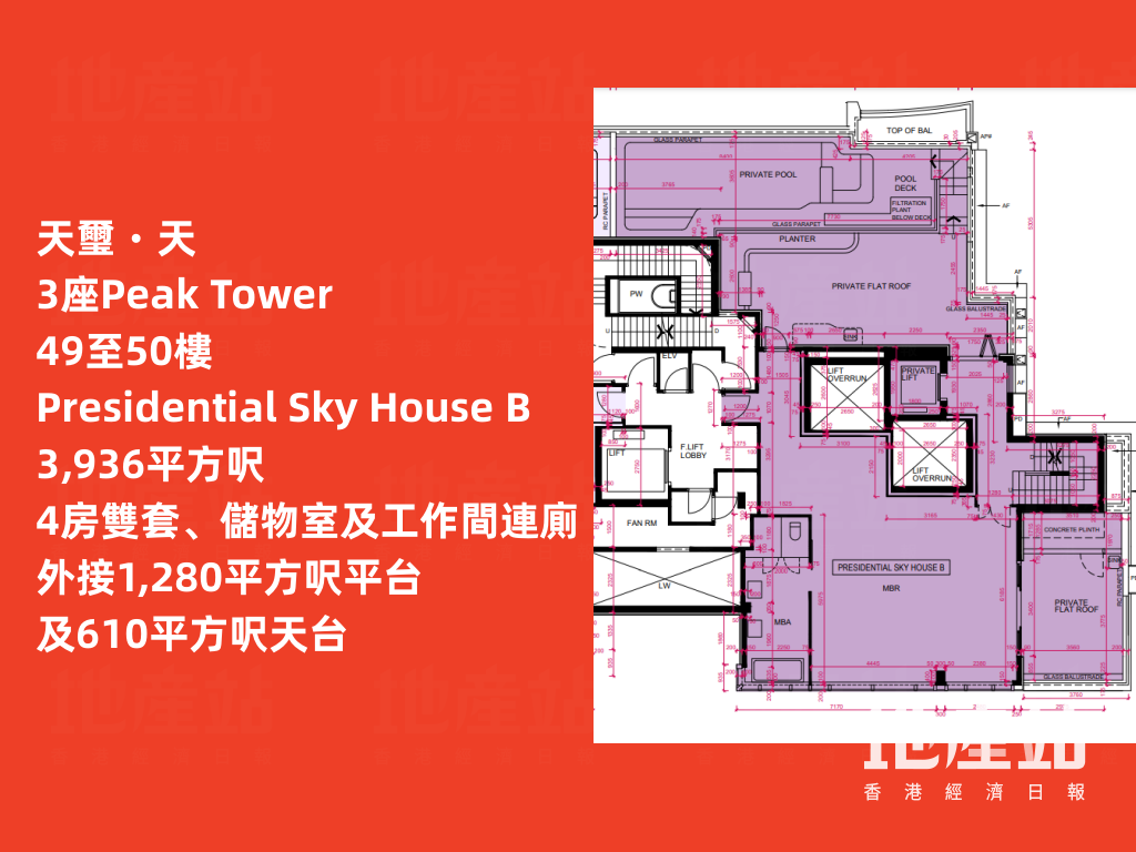 其中,3座Peak Tower 49至50樓 Presidential Sky House B,實用面積3,936平方呎,設4房雙套、儲物室及工作間連廁,屬全盤面積最大的單位,外接1,280平方呎平台及610平方呎天台;其次為3座Peak Tower 49及50樓Presidential Sky House A,實用面積為3,553平方呎,間隔與前者相同,外連1,290平方呎平台及549平方呎天台。上述兩伙均設有私家電梯大堂,更設有內置樓梯以及私家升降機,以便住戶往返複式上層。另外,上述兩伙各設兩個平台,分別由主人套房及私家升降機旁外接。