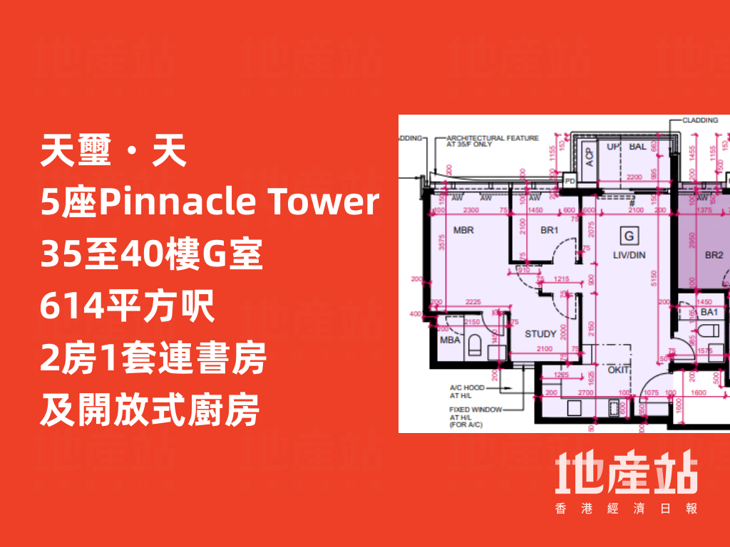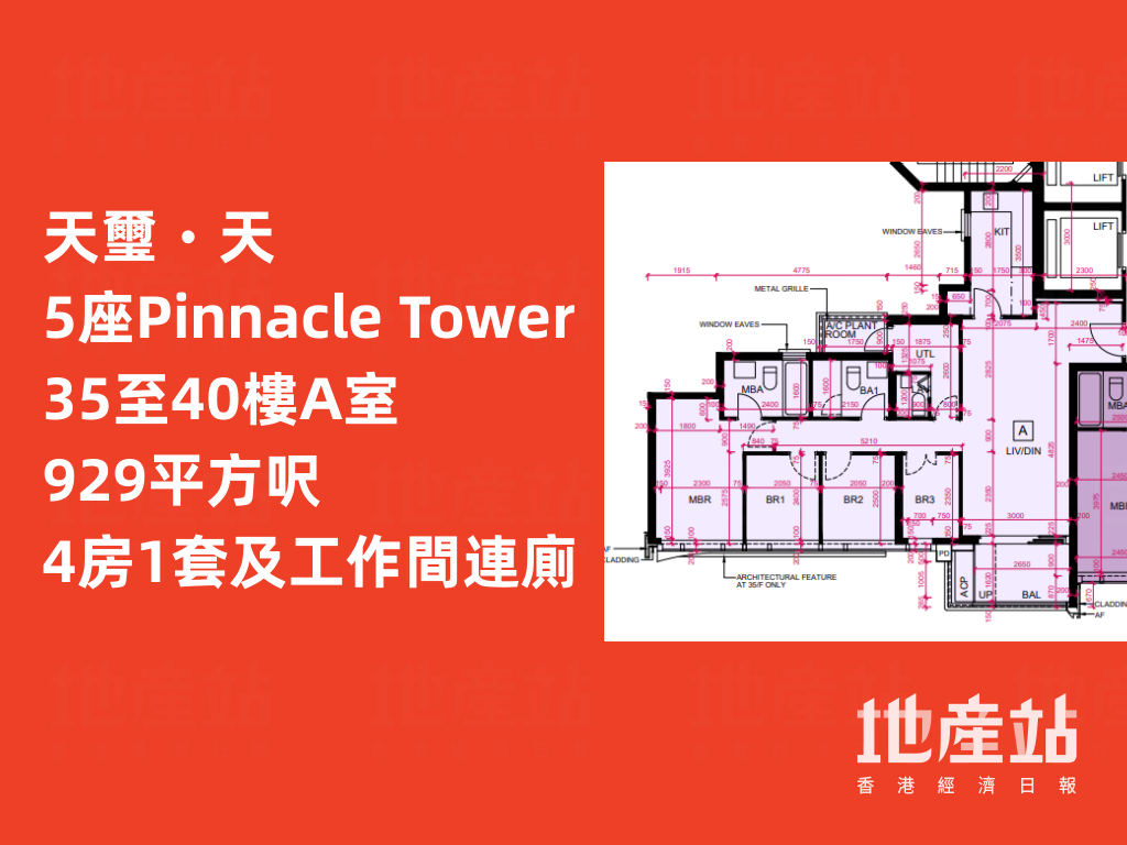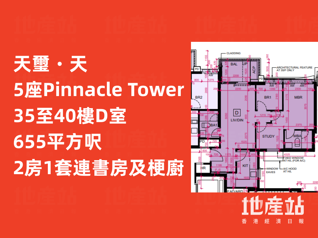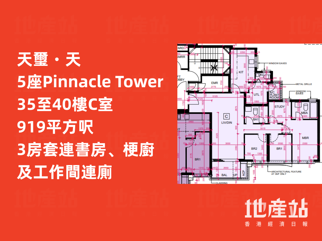 另外,5座Pinnacle Tower 33至40樓C室,實用面積919平方呎,設3房1套、梗廚、書房及工作間連廁,大門旁邊已預留空間放置鞋櫃,設長形梗廚,內接工作間連廁。書房同樣備有獨立門口,裡面亦直接通往主人套房。