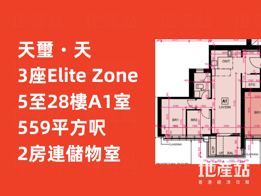 另外,2房連儲物室單位位於3座Elite Zone 5至28樓A1室,共有21伙,實用面積559平方呎。大門左邊為以趟門開關的儲物室,右邊已預留鞋櫃位,並對正L形開則的開放式廚房;設長直大廳,兩房與廳同向。