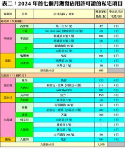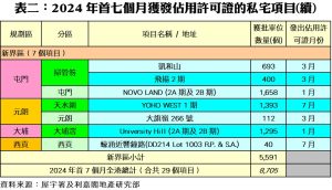 根據資料顯示,七月份本港共有6個私宅項目正式落成,當中規模最大的是天水圍「YOHO WEST」第1期,涉及1,393伙;其次為中環「The Unit Soho」(奧卑利街28號),涉及69伙;至於,何文田山谷道21號(61伙)、西營盤第三街50號(42伙) 、西貢蠔涌近響鐘路(DD214 Lot 1003 R.P. & S.A.) (40伙)及山頂山頂道52號(3伙)亦於期內竣工(詳見表二)。